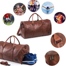 Leather Travel Bag with Shoe Pouch, Waterproof Weekender Overnight Bag,Carry On Duffel Bag for Men Women-Brown