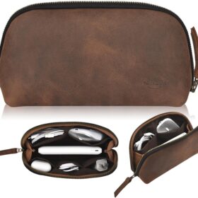 Leather Tech Pouch for Cables Chargers Phone | Tech Bag | Zipper Travel Accessory Pouch | Electronic Organizer Case Travel Bag (Vintage Dark Brown)