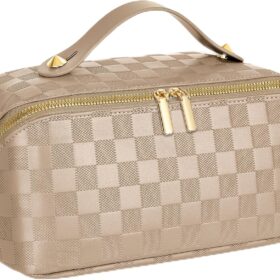 Large Capacity Travel Cosmetic Bag – Portable Makeup Bags for Women Waterproof PU Leather Checkered Makeup Organizer Bag with Dividers and Handle,Toiletry Bag for Cosmetics