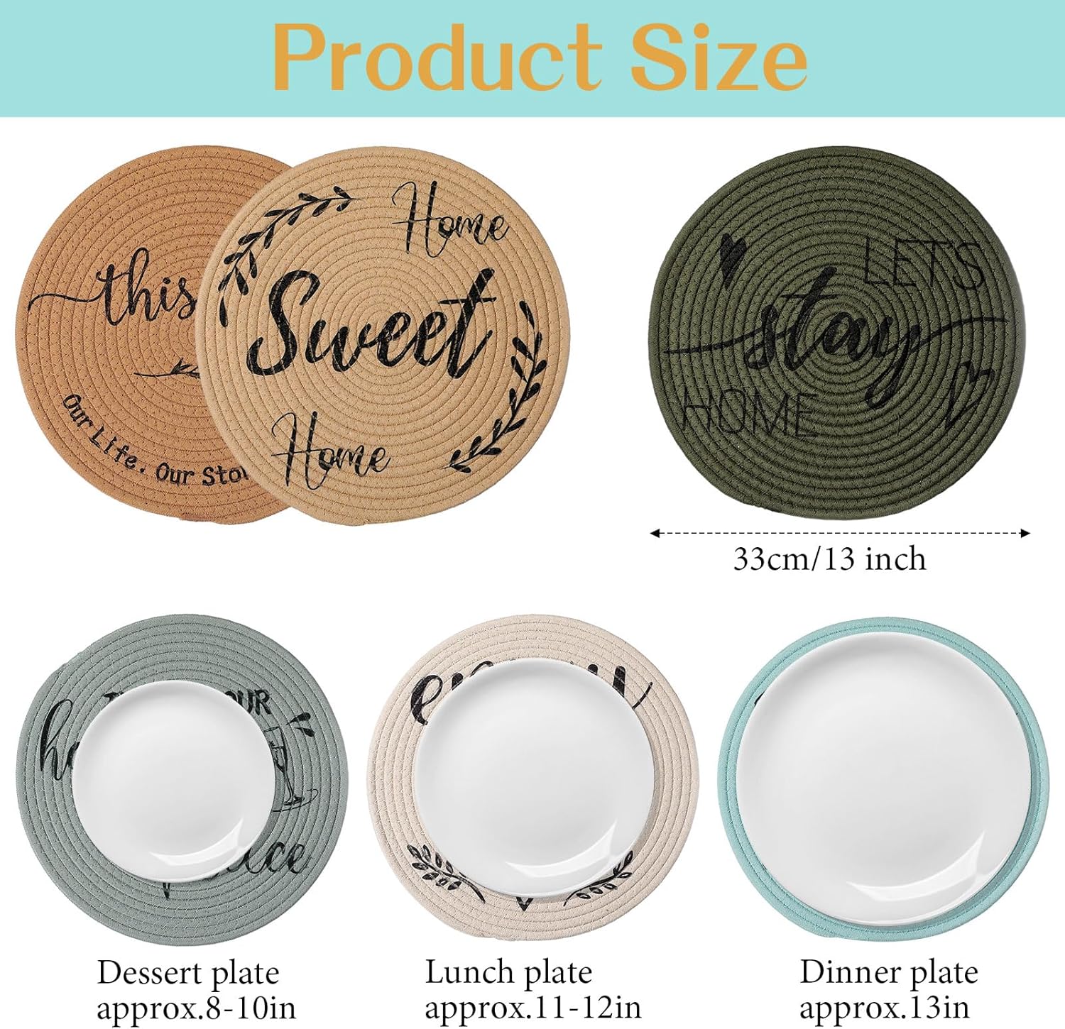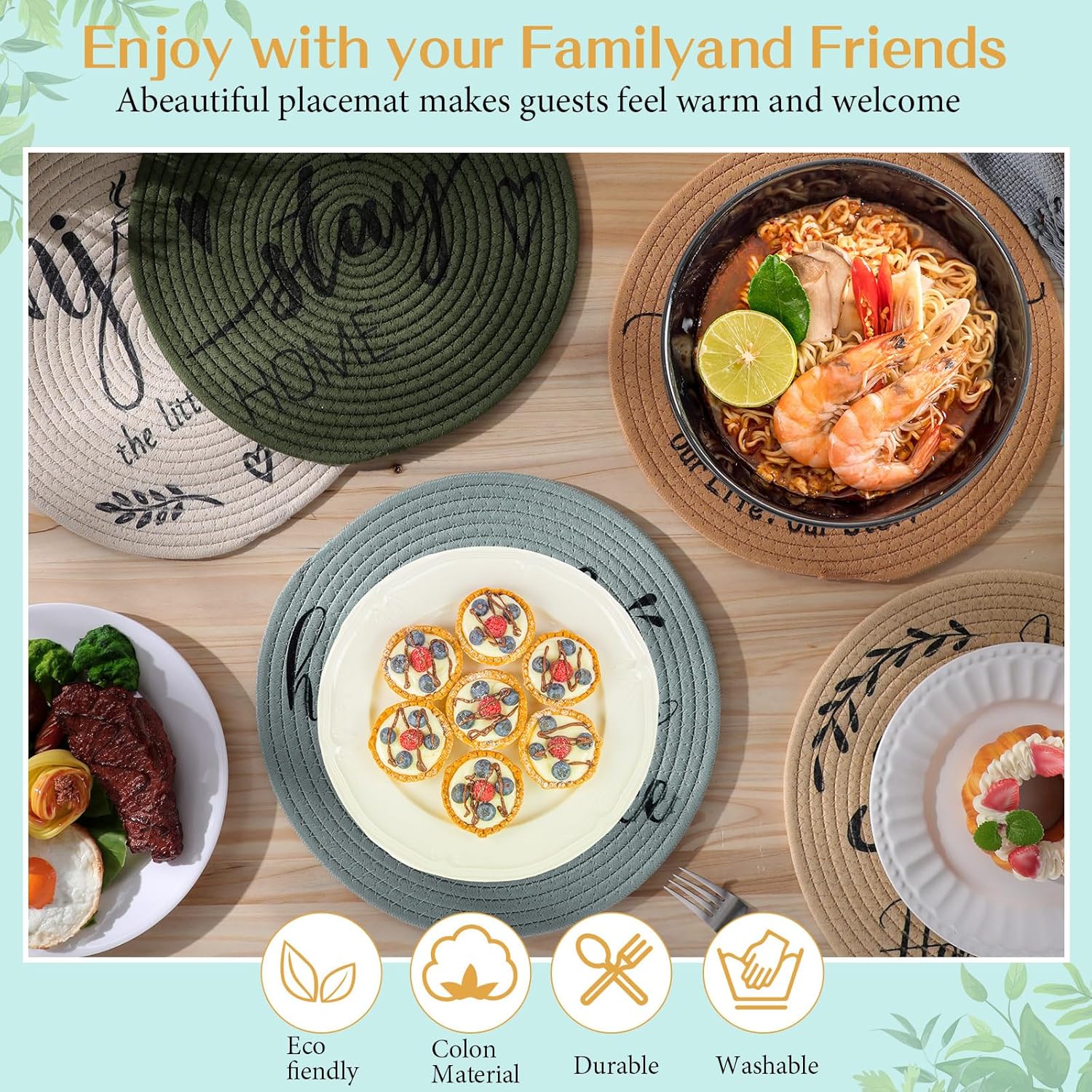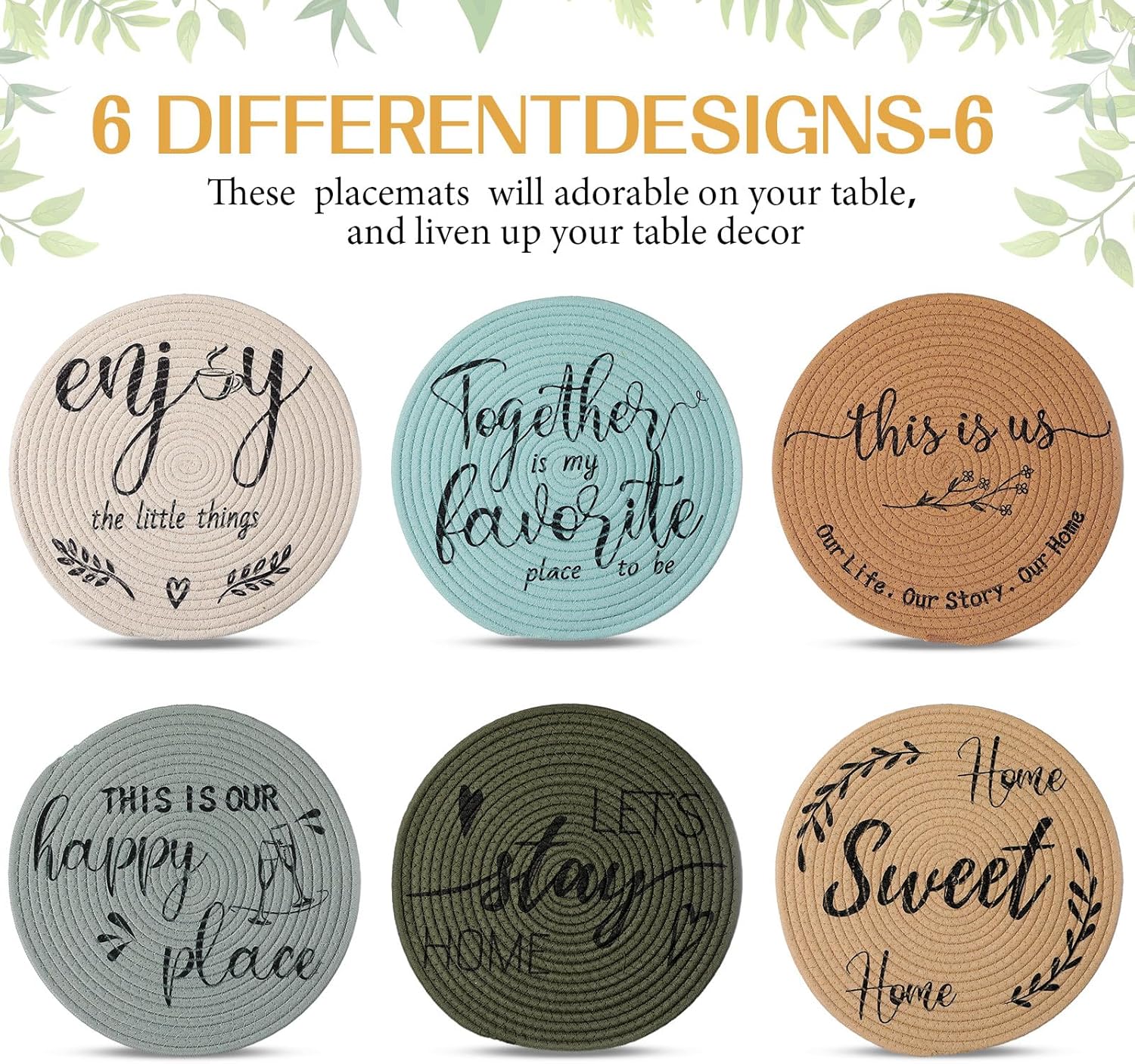 About this itemnCotton Placemats Set of 6: consists of 6 pieces of boho placemats, made of soft cotton; Kitchen placemats with print enjoy, sweet, and more, add a cozy atmosphere to your dining room, suitable for family use and friend gatheringsn13 Inch Round Cotton Placemat: this kitchen pot holder comes in a set of 6 colors, circle table mats are 13 inches in diameter, making them the suitable size for some plate or bowl, and adding a touch of rustic charm to your table setting; Cotton placemats fit almost more kitchen or dining room decorationnNon Slip and Heat Resistant: the farmhouse placemats provide friendly insulation against heat for your dining table that will not only protect your tabletops and countertop from hot pans but also as lid holders for pots, pans, hot dishes, or teapots; Round braided placemats are decorative accessories for all occasions all year round for your homenDelicate Pattern: decorate your dining table; A delicate and beautiful quilted floral pattern will add a romantic rustic style to your dining table; These dining table centerpiece decors add a touch of classic bohemian style to your dining roomnUsage: suitable for various occasions, including Valentine’s Day, Christmas, Thanksgiving, and Easter, these table mats are suitable for both indoor and outdoor dining, which impresses your loved ones and guests