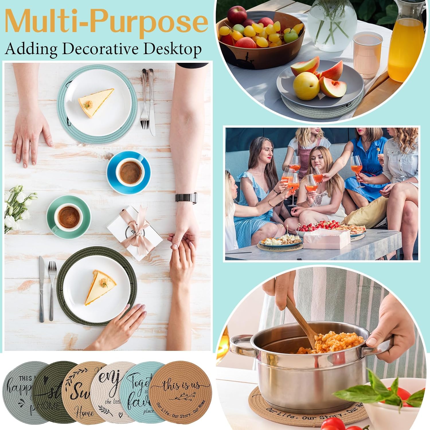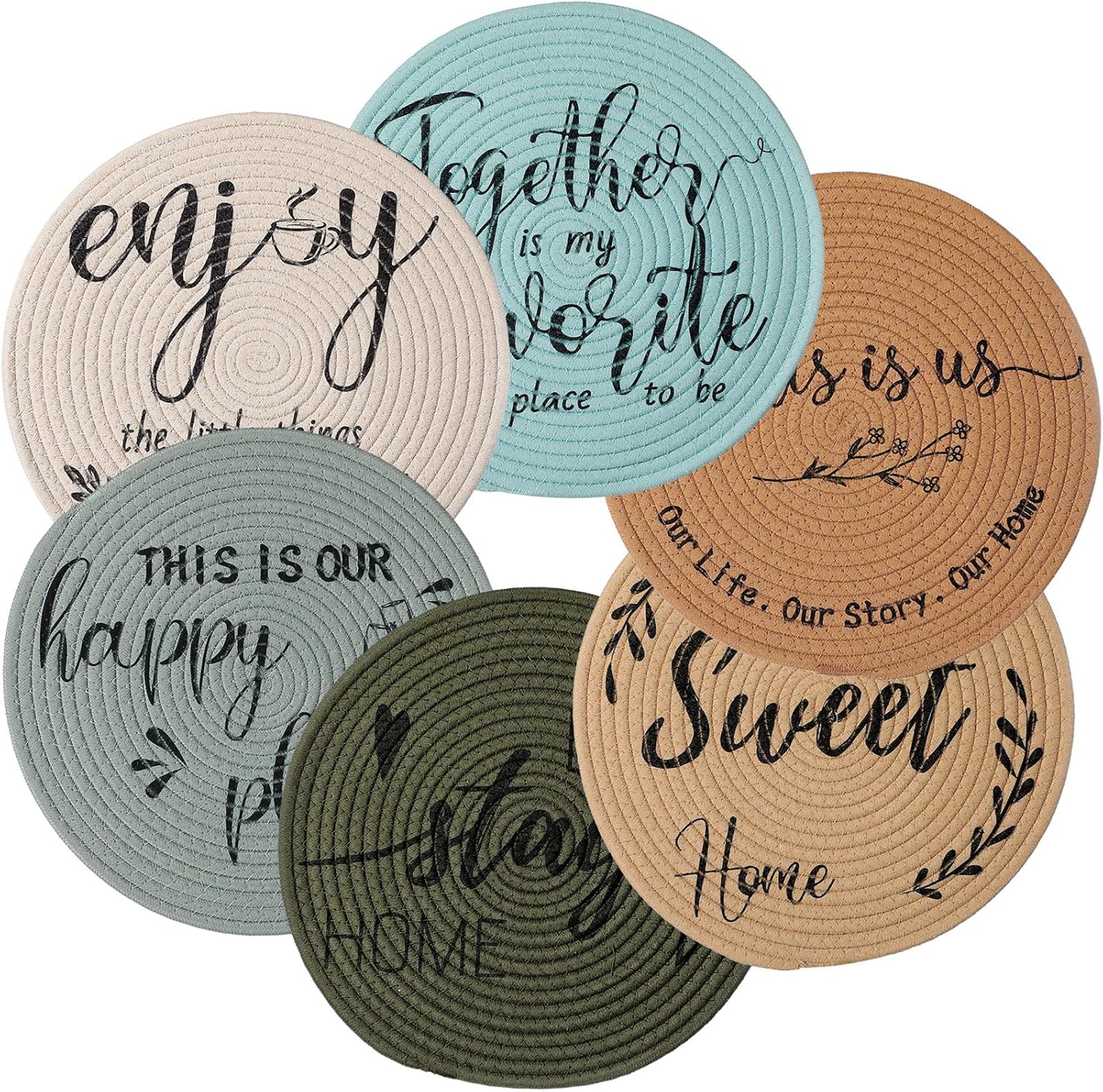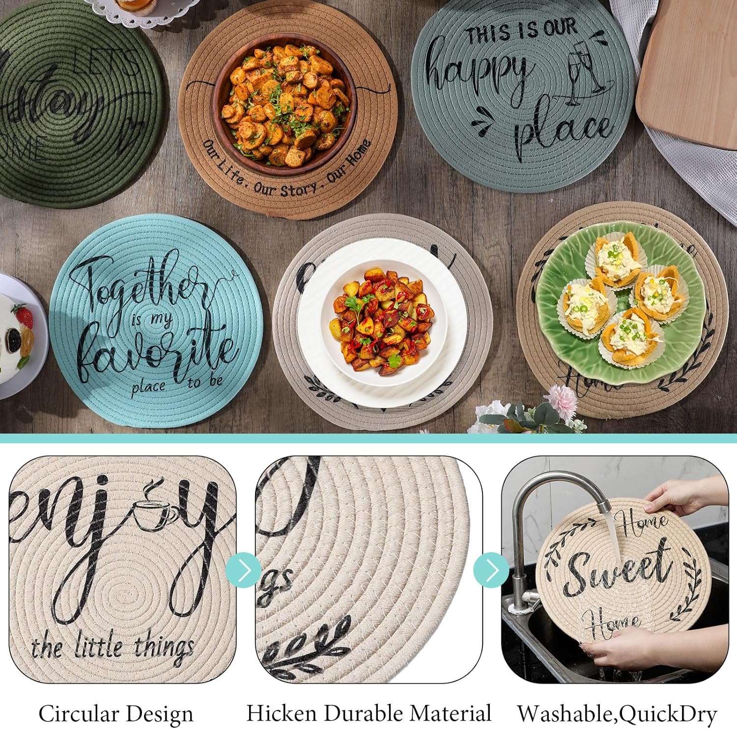 About this itemnCotton Placemats Set of 6: consists of 6 pieces of boho placemats, made of soft cotton; Kitchen placemats with print enjoy, sweet, and more, add a cozy atmosphere to your dining room, suitable for family use and friend gatheringsn13 Inch Round Cotton Placemat: this kitchen pot holder comes in a set of 6 colors, circle table mats are 13 inches in diameter, making them the suitable size for some plate or bowl, and adding a touch of rustic charm to your table setting; Cotton placemats fit almost more kitchen or dining room decorationnNon Slip and Heat Resistant: the farmhouse placemats provide friendly insulation against heat for your dining table that will not only protect your tabletops and countertop from hot pans but also as lid holders for pots, pans, hot dishes, or teapots; Round braided placemats are decorative accessories for all occasions all year round for your homenDelicate Pattern: decorate your dining table; A delicate and beautiful quilted floral pattern will add a romantic rustic style to your dining table; These dining table centerpiece decors add a touch of classic bohemian style to your dining roomnUsage: suitable for various occasions, including Valentine’s Day, Christmas, Thanksgiving, and Easter, these table mats are suitable for both indoor and outdoor dining, which impresses your loved ones and guests