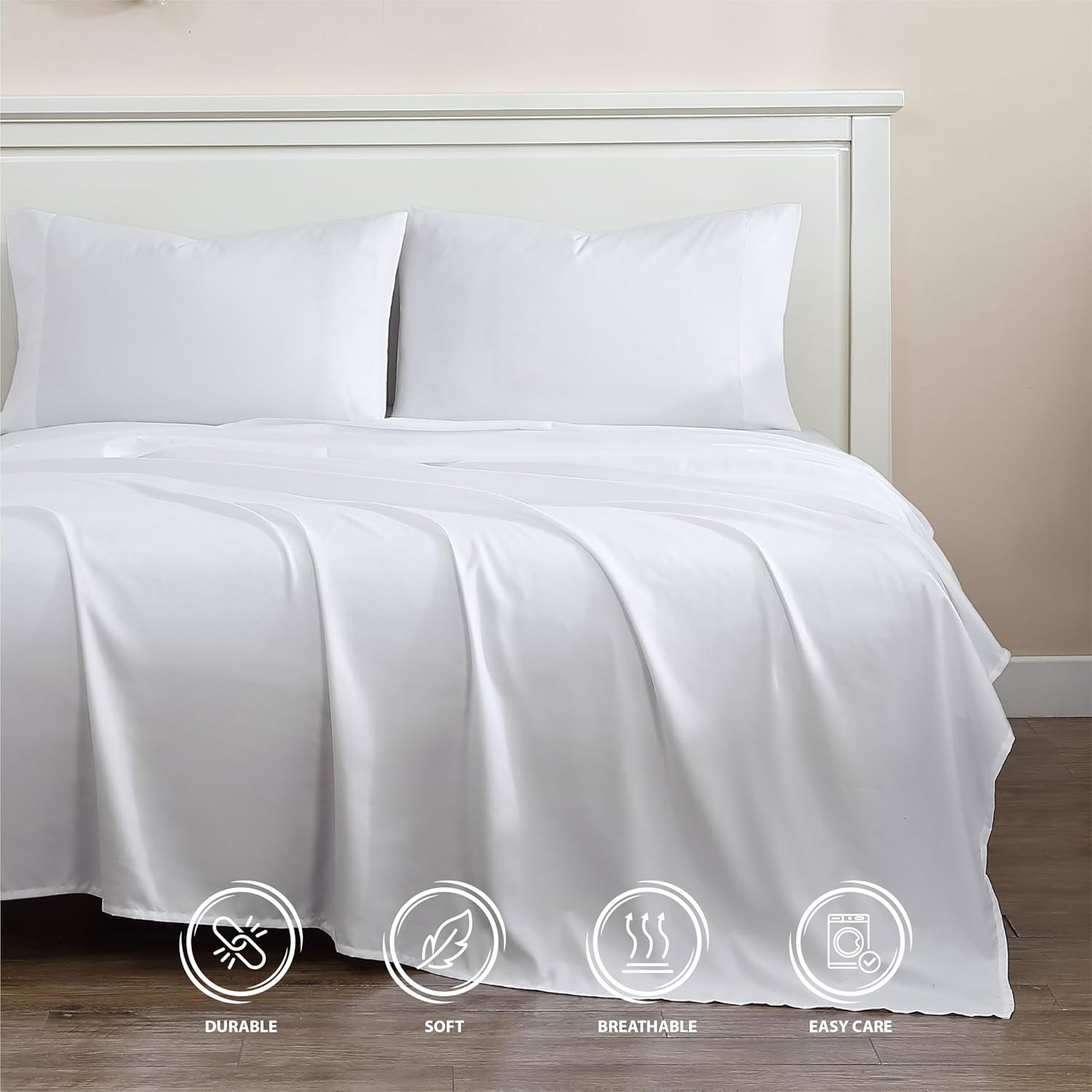 About this itemnPolyesternDEEP POCKETS / PERFECT FIT: Our fitted sheet features all-around elastic for a secure grip that effortlessly fits mattresses up to 16 inches deep, ensuring a snug, stay-put experience all night long.nSOFT AND COMFORTABLE: Experience exceptional softness with our brushed microfiber polyester fabric, providing a cozy, year-round comfort that keeps you cool In summer and warm in winter.n4 PIECE BED SHEET SET: Includes a Queen bed sheet set with a (1) 90 x 112 inch flat sheet, (1) 60 x 80 x 14 inch fitted sheet, and (2) 20 x 30 inch Standard pillowcase.nCARE INSTRUCTIONS – Machine wash, tumble dry or iron on low temperature; do not bleachnEXCEPTIONAL VALUE AND COMFORT: Enjoy the ever lasting softness and affordability of our True Classic Bed Sheet Seta perfect balance of luxury and comfort at an affordable price