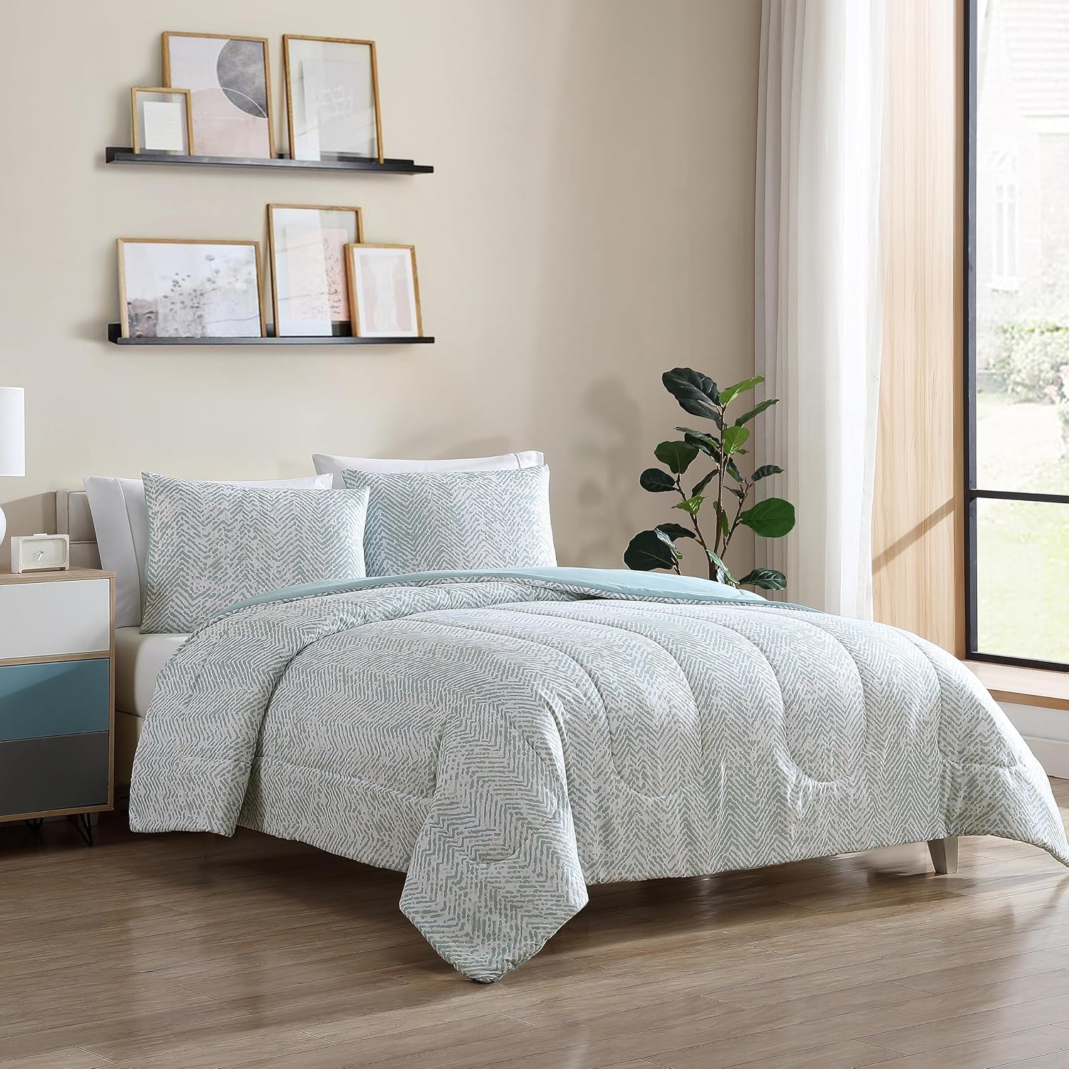 About this itemnUNMATCHED SOFTNESS: Crafted with premium microfiber, the 1888 Mills True Classics Comforter Set offers an exceptionally soft touch, providing plush comfort that feels gentle against your skin. Ideal for a cozy and restful nights sleep. Designed to offer comfort throughout the year, this comforter set ensures you stay warm in the winter and cool in the summer, making it perfect for all-season use.nCOMPLETE & COORDINATED SET: This set includes a Twin-sized comforter (66x86) and 1 Pillow Sham (20x26), offering a coordinated and sophisticated look that enhances your space. Its a perfect choice for a refined bedroom update or a thoughtful gift for special occasions like anniversaries, birthdays, or housewarmings.nREVERSIBLE DESIGN FOR VERSATILE STYLE: Enjoy two looks in one with our comforter set! One side features a modern geo print, while the other side showcases a solid sage colour. This reversible design allows you to easily switch up your bedroom decor and adapt to different moods or seasons with ease.nCERTIFIED SAFETY & QUALITY: Rest easy, knowing that this comforter set has been independently tested and certified against over 350 harmful chemicals, meeting the rigorous STANDARD 100 by OEKO-TEX guidelines. This certification ensures that the product is safe and free from harmful substances, prioritizing your health and well-being.nEASY CARE & MAINTENANCE: This comforter set is machine washable for your convenience. For long-lasting softness and to avoid pilling, wash on a gentle cycle with cold water and tumble dry on low. Enjoy hassle-free upkeep and maintain the comfort of your bedding.