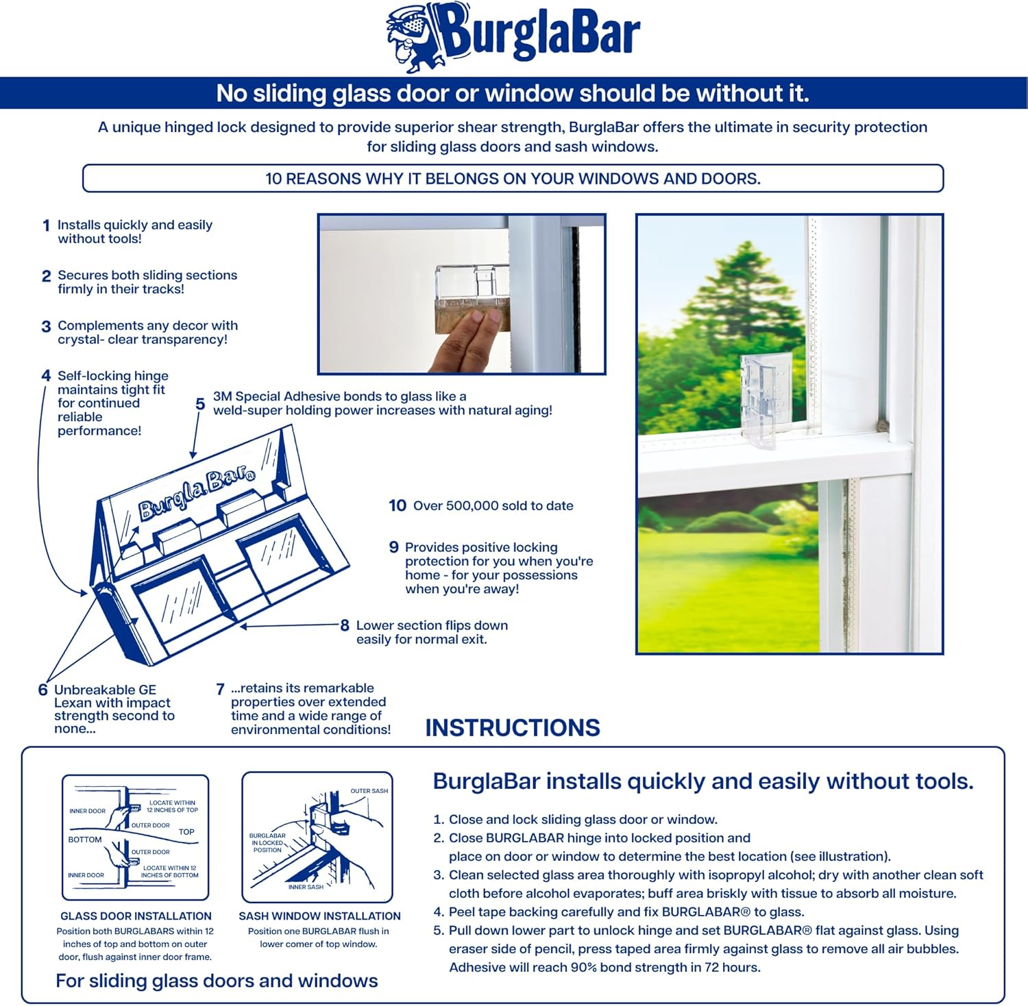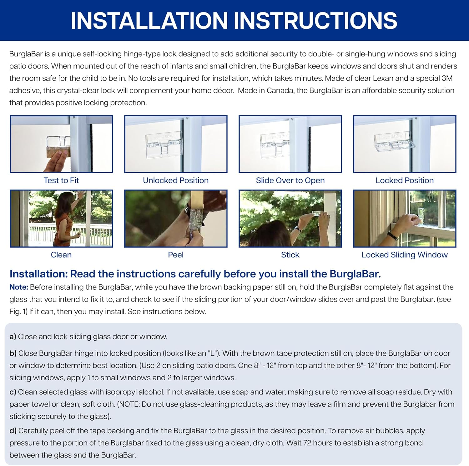 About this itemnEnhance Your Home Security: Instantly add additional security to patio doors and windows with this unique hinge-style sliding glass door lock; Not only does this door security device keep your space safe, it can also be used to childproof your homenEasy To Install: The Burglabar patio door lock is simple to install – no tools required – and its crystal-clear design easily blends in; This versatile child-proof door lock can be used as a sliding door security bar or a sliding window locknAdjusts To Your Door: Our sliding glass door security bar can easily be adjusted to fit different doors sizes; Secure your home with a Burglabar security bar for sliding glass doors and windows and enjoy added peace of mindnSturdy & Reliable: These durable security door locks come equipped with strong adhesive that adheres to glass like a weld for maximum strength; When properly applied, our sliding door and window security bars provide additional safety and securityn20 Years of Experience: The creators of the original Addalock and Burglabar, Rishon Enterprises Inc. is dedicated to promoting safety, security, and privacy; Protect your spaces, whether at home or away, with our safety locks for doorsn See more product details