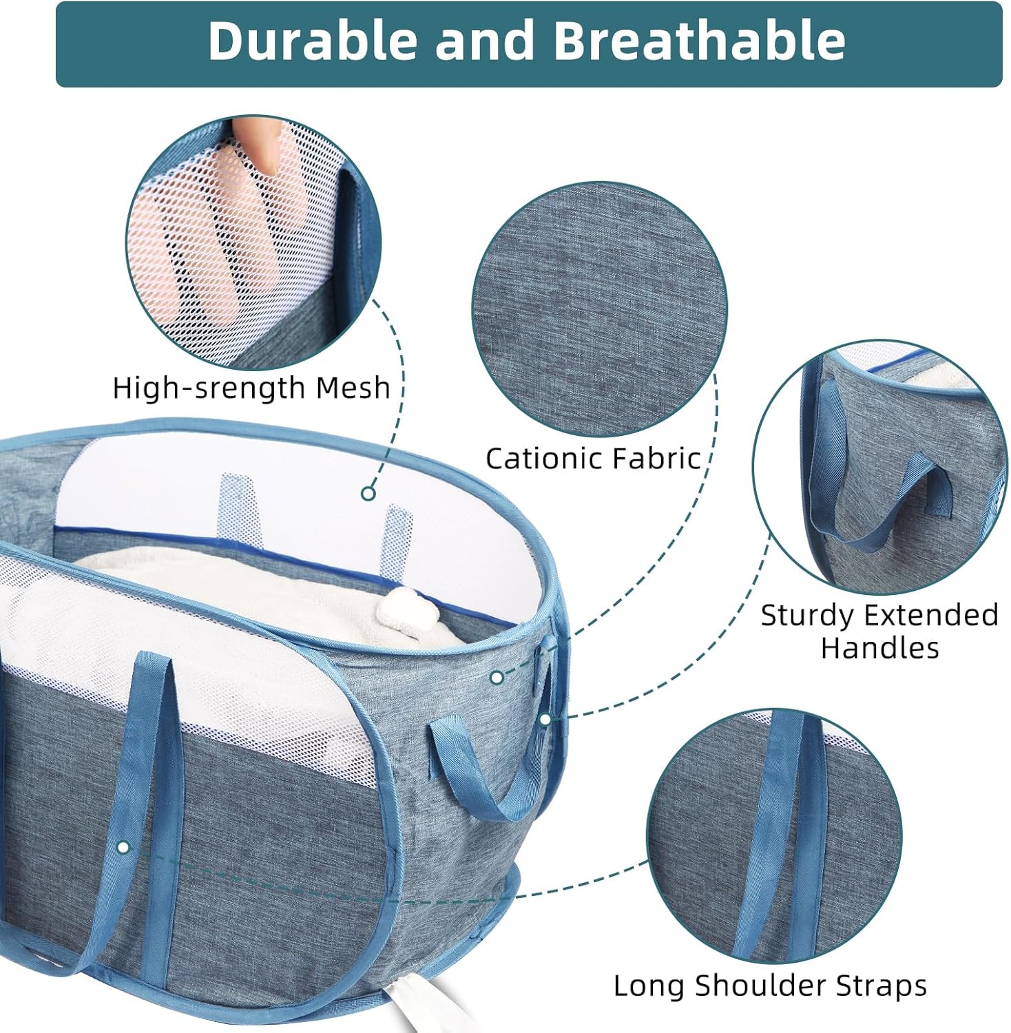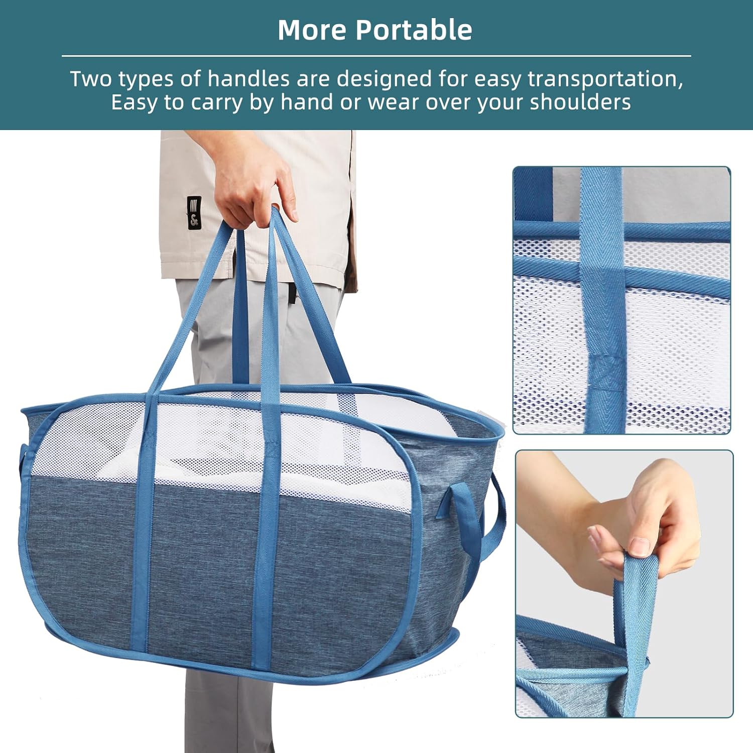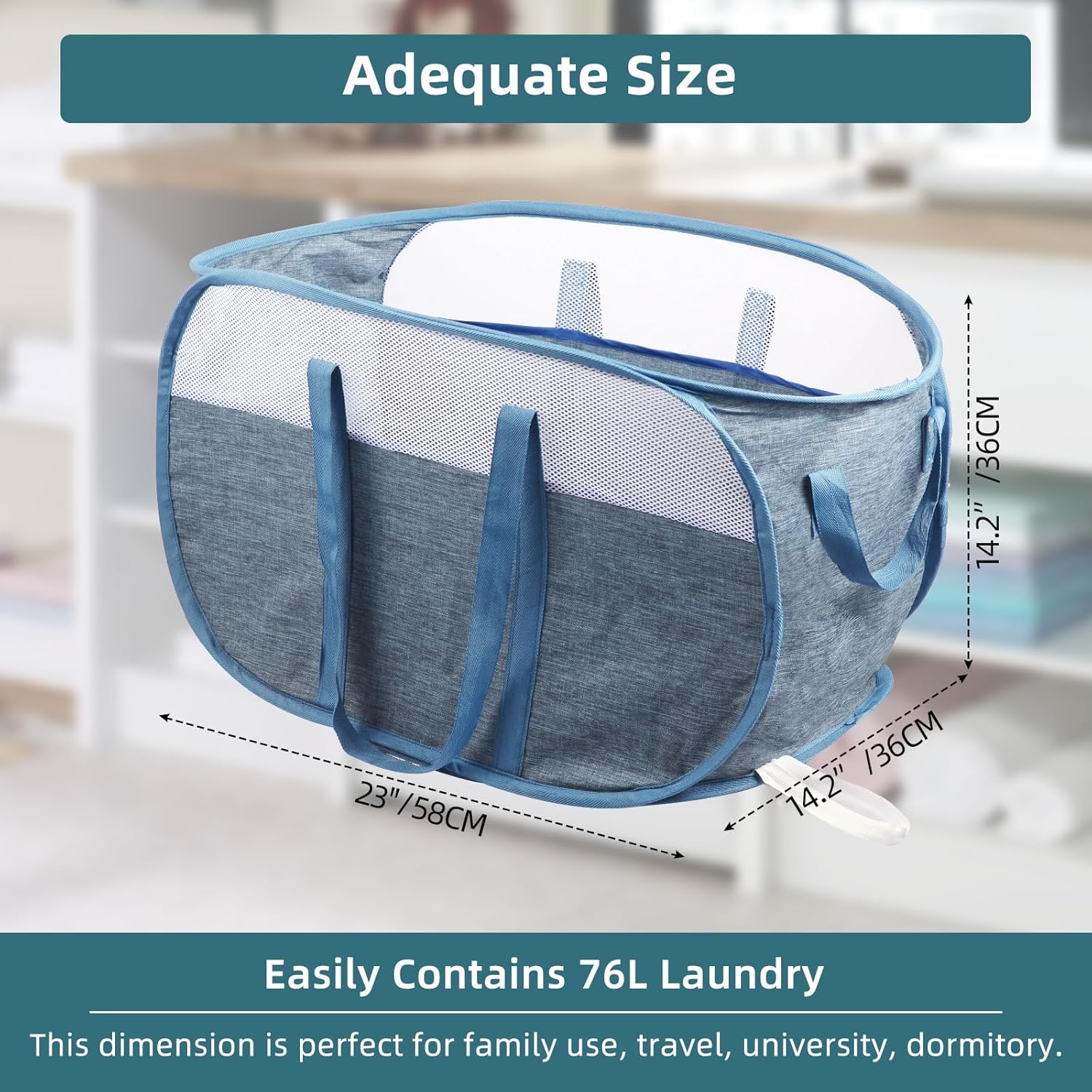 About this itemnUpgrade Durable Design: This laundry basket uses sturdy cationic fabric and denser mesh, stitching with sturdy binding, which prevents tearing and scratching at the bottom and can be used long after.nSturdy Handles: This laundry hamper has reinforced multi-handles, making it easy to carry laundry up and down stairs. The extended handles can even be used as shoulder straps, providing multiple carrying options. Move your laundry with ease using the two side small handles.nPortable and Space-Saving: The collapsible design allows the laundry hamper to be easily folded into a flat or small circle when not in use. Perfect for dorms, travel, campouts, apartments, kids’ rooms, hotels, shopping, and more. Save space and take it with you wherever you go.nLarge Capacity: With its ample size and large opening, this premium clothes hamper can hold a lot of laundry. Dimensions: 24 x 14 x 14 inches. Say goodbye to overflowing hampers and enjoy the convenience of a spacious laundry basket.nVersatile Use: Not only is this foldable hamper a great helper for daily laundry, but it can also be used for home storage. Store clothes, sporting goods, toys, and any household items with ease. Keep your space organized and clutter-free.nSuitable for Everyone: This pop-up hamper is not only convenient and lightweight, but it is also suitable for the whole family. It’s a great helper for women, mothers, toddlers, children, girlfriends, students, and more. No more hassle with daily laundry or tidying up toys and other items.n See more product details
