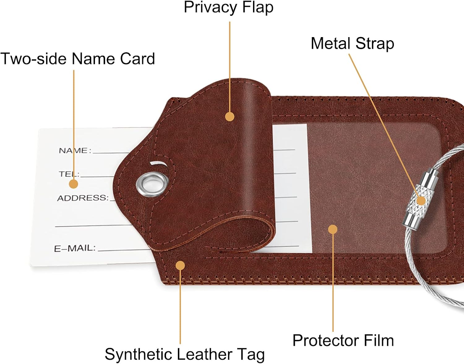 About this itemnUnique Pattern: Uniquely designed travel luggage tags, simple yet stylish, perfectly match your youthful vigor and personality. Carefully selected monogram luggage tags make your luggage more personal.nPrivacy Protection: Luggage tags with a privacy back cover to completely hide your owner information. Avoid prying eyes, so that you don’t have to worry about personal information leakage, and enjoy a pleasant journey.nEasier to Identify: The eye-catching orange color allows you to spot your luggage at a glance among many items, which helps to identify your luggage and avoid losing items at the airport or on a cruise ship. Perfect for anyone who loves to travel or is on the go.nHigh Quality & Durable: The bag label is made of high-quality PU leather, which is comfortable to touch and not easy to deform. The sides are stitched with silk thread, which is very durable and suitable for long-term repeated use.nEasy to Use: Connected with a metal wire buckle, the detachable steel ring makes it easy to install and remove the tags from your luggage or bag. No need to worry about accidental loss of luggage tags anymore! Perfect for travel bags, suitcases, school bags, sports gear, pet carriers, or any other item that needs to be labeled.