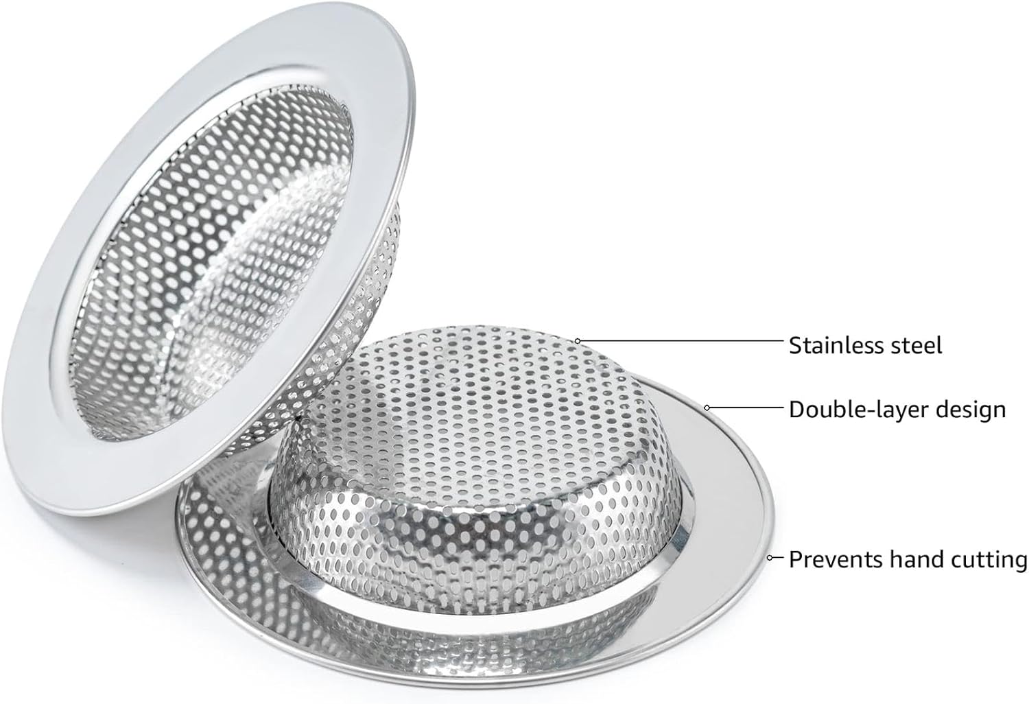 About this itemn?Premium Materials?: Stainless steel sink strainer, bright, long-lasting, rustproof.n?Upgrade Design?: Our sink strainer upgrade the double-layer design over the sharp edges prevent yours hands from cutting.n?Easy to Use?: Our sink strainers are easy to use without any tool installation, easy remove and place, and easy to clean by hand wash or rinse with just warm soapy water.n?Suitable Holes?: 0.08 inch diameter drain pore for smooth drainage and meanwhile filter out more food particles.n?Widely Used?: Outer diameter: 4.5 inch; inner filter: 3 inch; depth: 1 inch. Please measure the size of your sink before purchasing, in order to determine whether our product is suitable for your sinks.