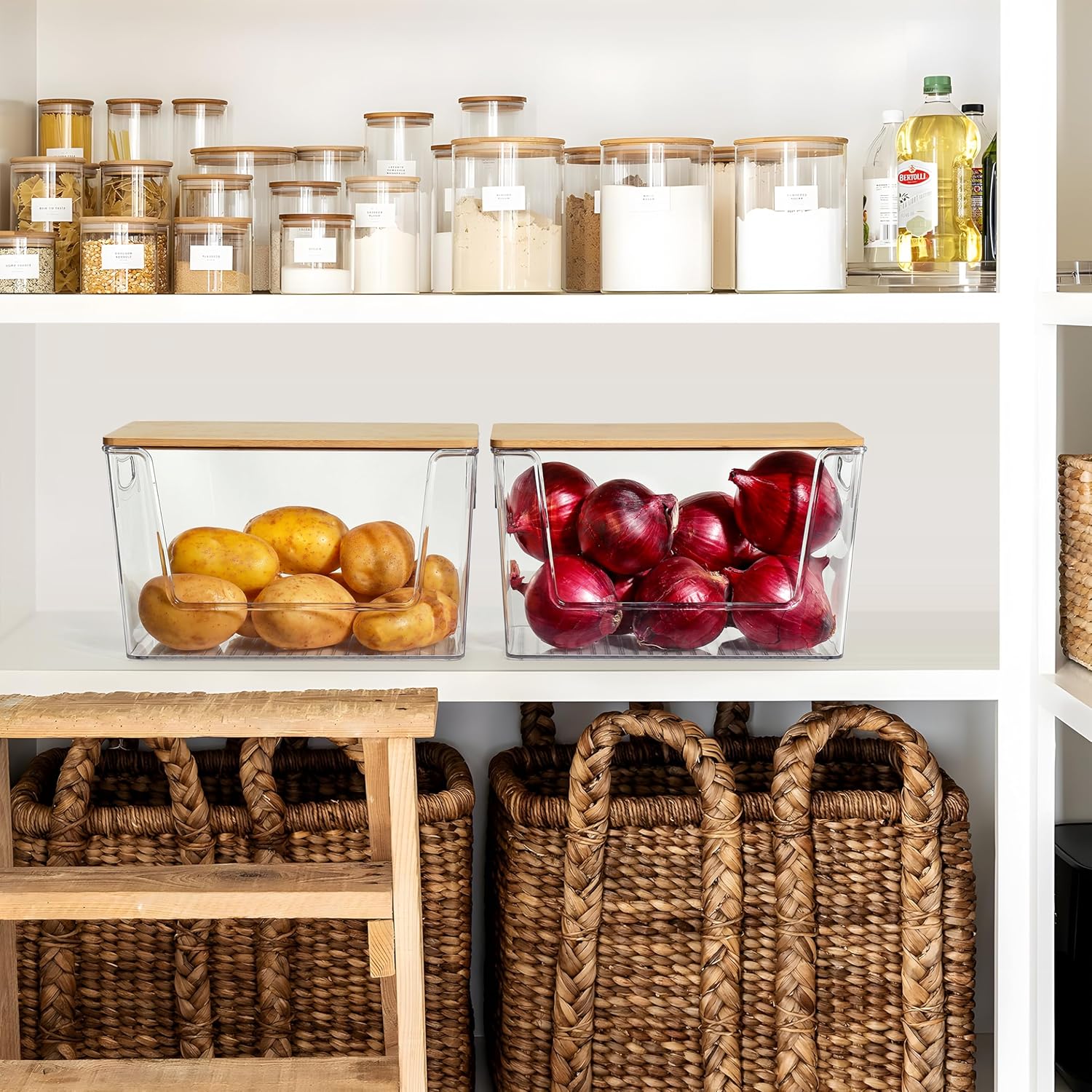 About this itemnBamboo Lid with Front Opening: This storage bin features a convenient front opening and is topped with a durable bamboo lid. The lid design allows for easy access to the contents while adding a touch of natural elegance to your space.nIdeal for Potatoes and Onions: Designed to hold potatoes, onions, and other similar produce, this storage bin keeps your countertop tidy and your produce easily accessible. Say goodbye to cluttered surfaces and hello to effortless retrieval.nClear Plastic Construction: Crafted from transparent plastic, this storage bin provides visibility of its contents at a glance. You can easily identify the stored items, ensuring efficient organization.nStackable for Vertical Space Utilization: The stackable design of this storage bin allows for efficient use of vertical space. Stack multiple bins on top of each other to maximize storage capacity without taking up extra floor space, making it perfect for compact kitchens or pantries.nVersatile Storage Solution: While perfect for storing potatoes and onions, this bin can also be used for organizing a variety of other items, such as fruits, snacks, or kitchen accessories. Its versatility makes it a practical addition to any home.n See more product details