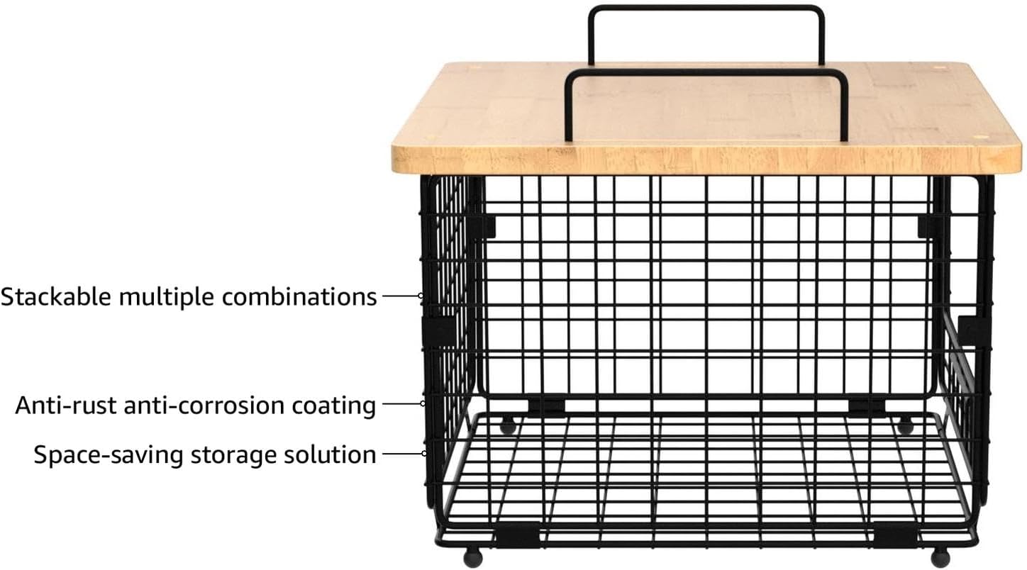 2 Set Stackable Wire Basket with Bamboo Top – Kitchen Counter, Pantry Organizer and Storage – Produce Onion Potato Fruits Vegs Bread Food Snack Spice Organizing Bin for Cabinet Shelf Countertop Floor