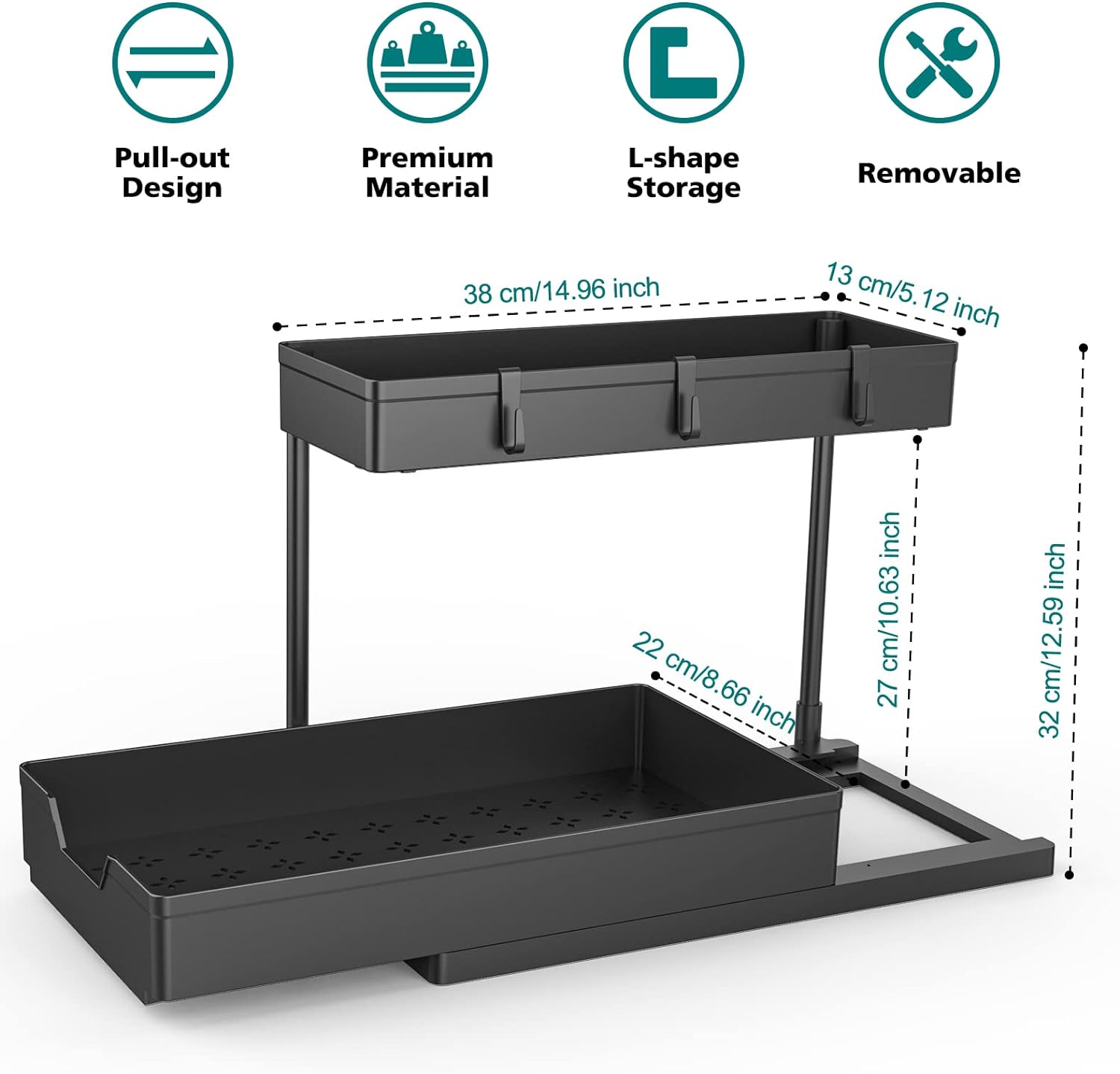 2-Tier Under Sink Organizers, 2 Pack Sliding L-shape Cabinet Organizers Narrow Space Storage Multi-purpose Sink Organizer for Bathroom Kitchen Drawer(Black 2 )