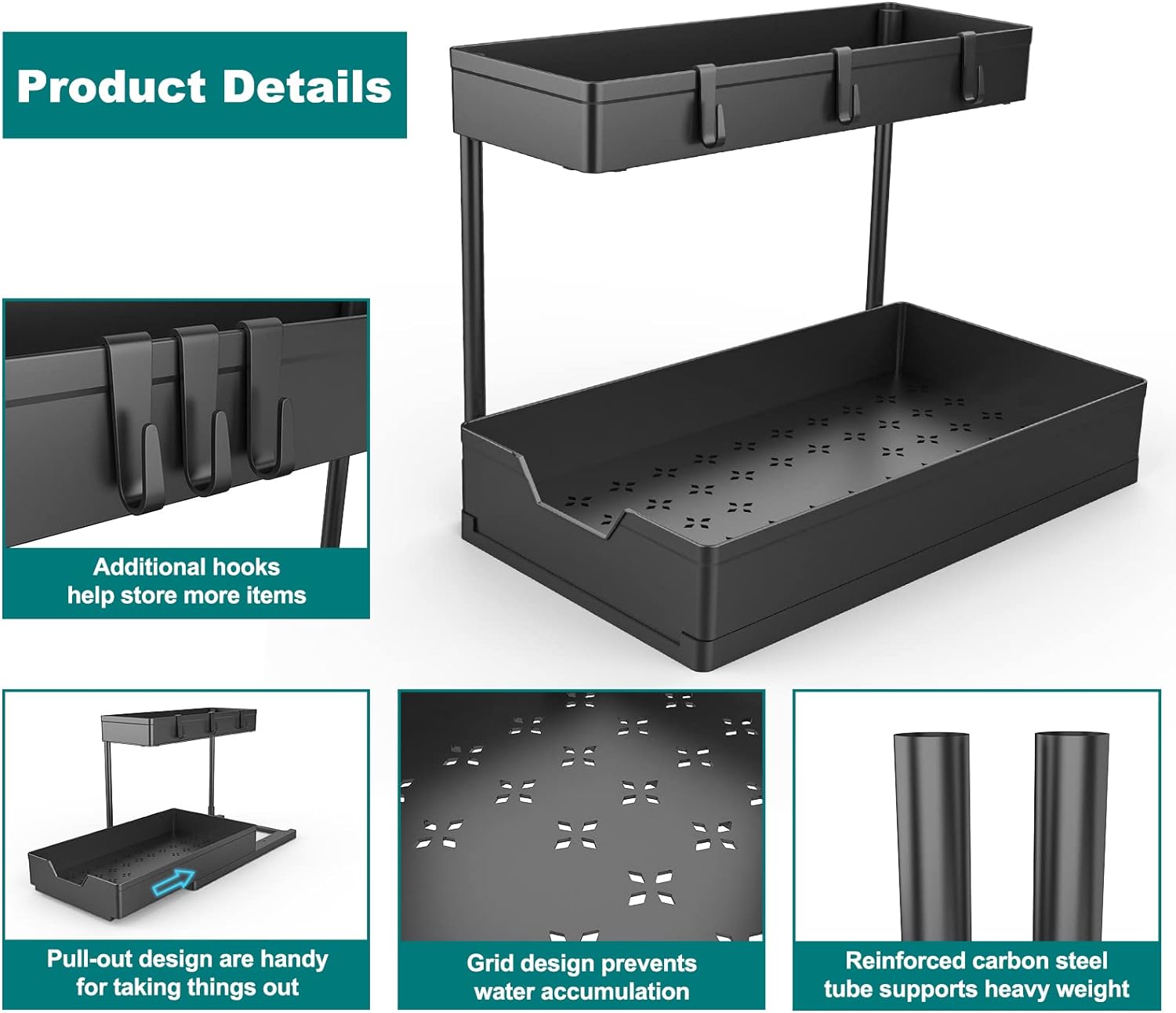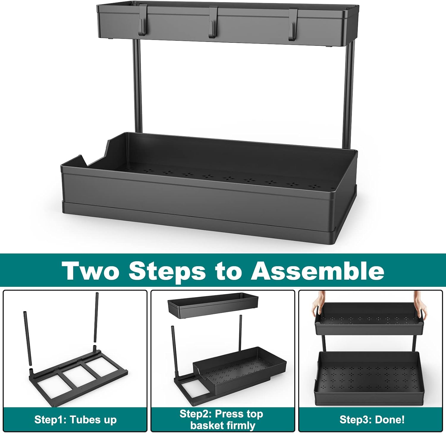 About this itemn?Sliding Storage Drawer?The under sink organizer is designed to be pulled out which is more convenient to use than other normal storage organizers. The bottom sliding drawers can be pulled out by the handles for easy access to items behind the front row, making picking and taking more flexible and easier in limited space.n?Space Saving & Neatly Organized?This under sliding cabinet organizer can make full use of the cabinet space, like kitchen under sink for cleaning supplies, bathroom under sink for toiletries and so on. With pull out cabinet organizer, you have room for all your stuff, and a slide-out system like this makes it easier to access everything you store under the sinkn?Stability Construction?- This under sink organizers and storage is made of thick plastic material which can help you better store your items and look clean and tidy. The four sturdy tubes with protective coating prevent rust in wet and watery places.n?Easy to Install and Clean?The slide out cabinet organizer can be completed installed without using tools. Drainage design prevent water accumulation. Also effortless to clean, simply wipe the surface with a damp cloth to clean and then keep it dry.n?Multi-Purpose Organization and Storage?The pull out under bathroom sink organizer is suitable for closets, kitchens, bathrooms, pantry, laundry rooms, offices, bedroom and many other places.