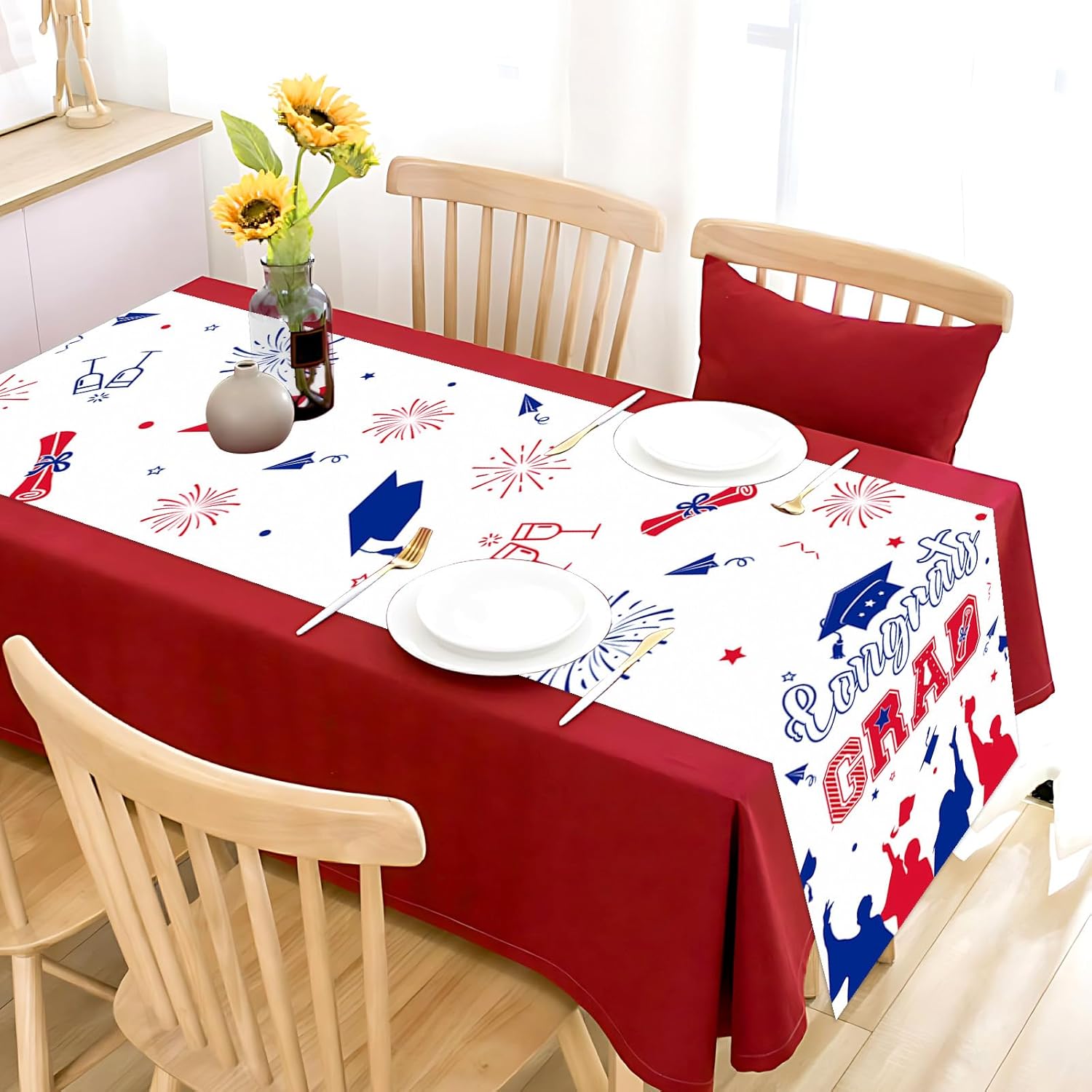 2025 Graduation Theme Table Runner, Red Blue Congrats Grad Linen Fabric Table Runner for Everyday Use 72 x 13 Inches, Washable Table Cover for Indoor Outdoor Kitchen Dining Table Home Decor