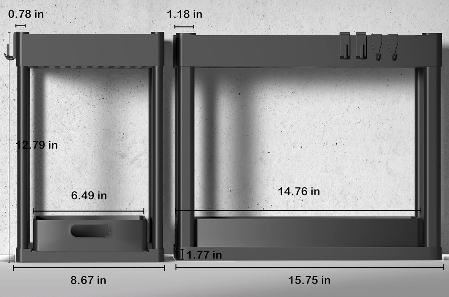 About this itemnSpace-Saving Design: This under-sink organizer features a 2-tier sliding shelf system, maximizing storage space while keeping your essentials neatly organized and accessible.nVersatile and Multifunctional: Crafted from durable HIPS material with a frosted matte finish, this organizer is suitable for various rooms, including the kitchen, bathroom, garage, laundry room, and office.nEasy Installation and Maintenance: Assembly is required, but the tool-free setup process is straightforward. The drainage design and smooth surface make cleaning a breeze, ensuring long-lasting use.