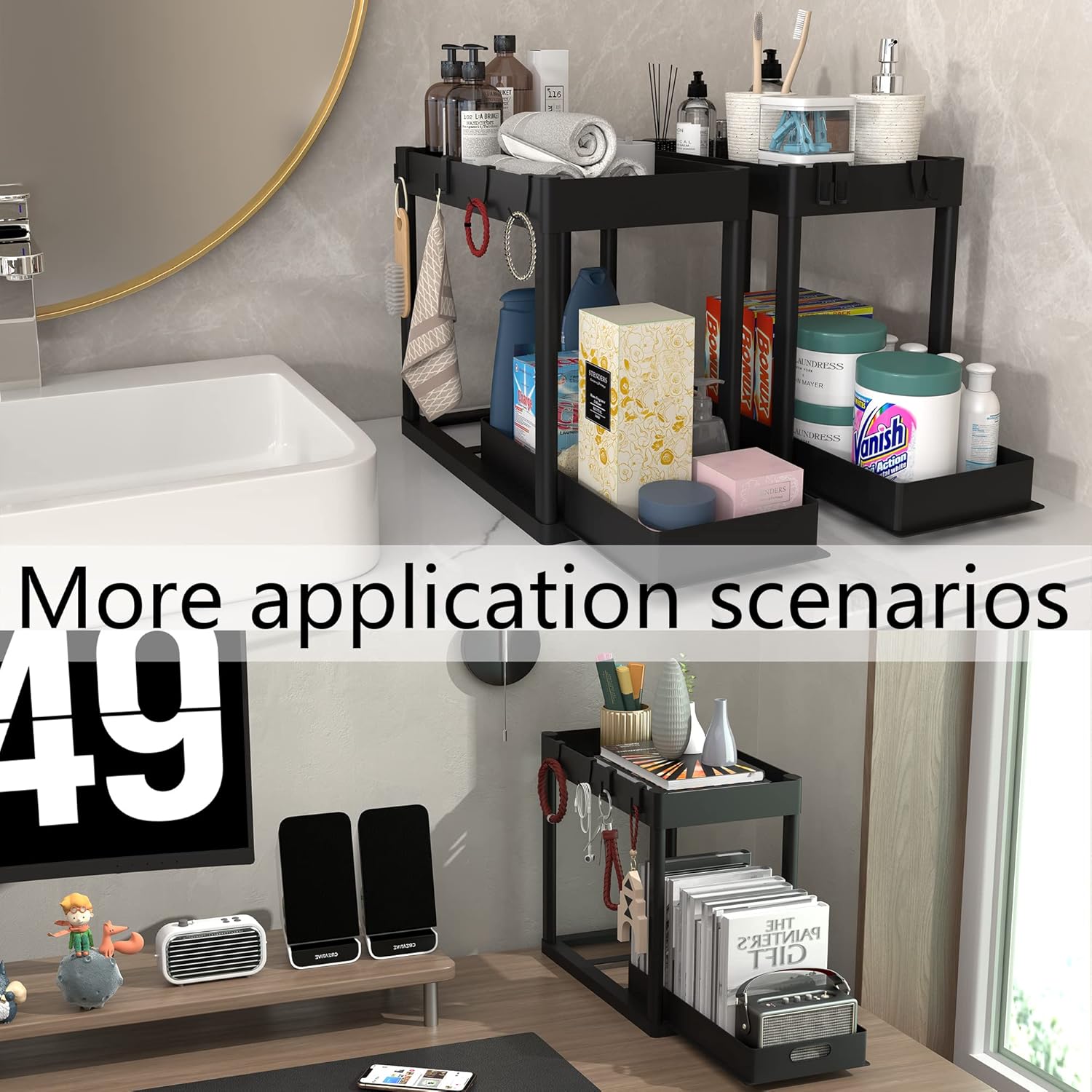 2PC Under Sink Organizer Rack 2 Tier Under Sliding Cabinet Basket Organizer Drawer with 4 Hooks, Multi-purpose Under Sink Storage for Bathroom Kitchen Desktop?Black?