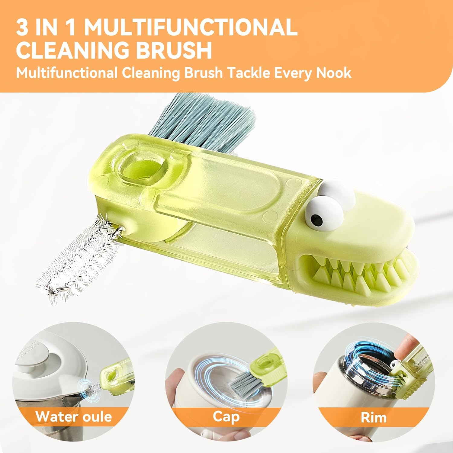 About this itemn? 3 in 1 Cleaning Brush?3 in 1 bottle brush with U-shaped silicone brush, stranded slit brush and stiff bristle corner brush, makes easier to clean coffe cups or mechine, tea cups, milk bottles, ice grids, molds, peelers, etc. In addition, the eyes of this crocodile brush are designed to prevent hands from slipping off during the cleaning process.n?Ideal Cup Lid Gap Brush?The shape and size of the brush head is not only a crevice cleaning brush, but also particularly suitable for cleaning the gaps in the cup lid, and the silicone brush head can easily clean the mouth of the glass, ensuring that every drink is fresh.n?Wide Useful?This bottle brush head can rotate 360 degrees to use different brushes, which is convenient to clean crevice, such as cup lid gap, coffe and tea cups, juicers, air fryers, toasters, sterilizers, grater, tiles gap, baseboards, bottles, filters, cup bottoms, feeding bottles, thermos cup, and more.n?Convenient Cleaning Brush?The brush tool is small and lightweight, easy to carry. Whether for home, outdoor or travel use, it can easily fit into a bag or backpack. It is a practical lifestyle gadget that can keep your drinking utensils clean and hygienic anytime and anywhere.n?High Quality Material?The bottle brush tool is made of high quality plastic, non-toxic, safe and environmentally friendly, and won’t do harm to the water cup and pacifier. The material is strong and durable, which ensures long time use and cleaning effect.