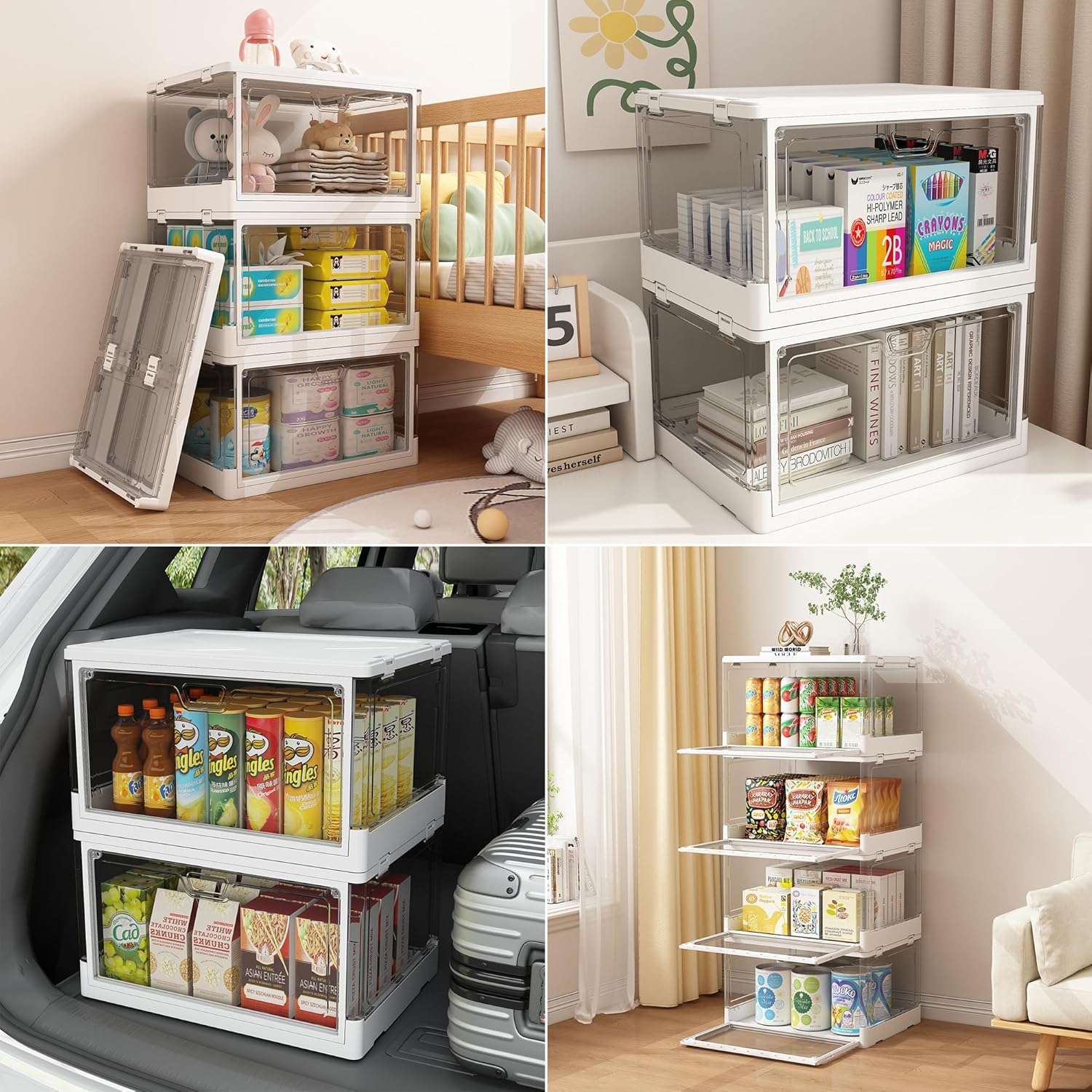 About this itemn?Visual Design?These stacking storage bins feature transparent panels on all four sides, allowing you to easily and quickly see what’s inside. They offer a perfect blend of style and functionality.n?Two Ways to Open?The folding storage container opens in two ways: a lid at the top or a magnetic door at the front. The top lid lets you quickly store items, while the front door provides easy access without needing to move or remove items from the top.n?Durable & Stackable?The plastic storage bins with lids are crafted from premium, sturdy, and heavy-duty materials, ensuring durability. The groove design on these foldable storage boxes allows them to stack up securely without tipping over. When not in use, these collapsible bins can be folded up and tucked away under the sofa or in an RV.n?Wide Application?The big storage cabinets are ideal for sorting out toys, crafts, photos, clothes, hats, snacks, food, medicines, etc. They’re also handy as extra storage in the garage, closet, wardrobe, kitchen, bedroom, bathroom, living room, pantry, laundry room, bookcase, office, classroom, or dormitory.n?Large Storage Capacity?The size of each storage organizer is 15
