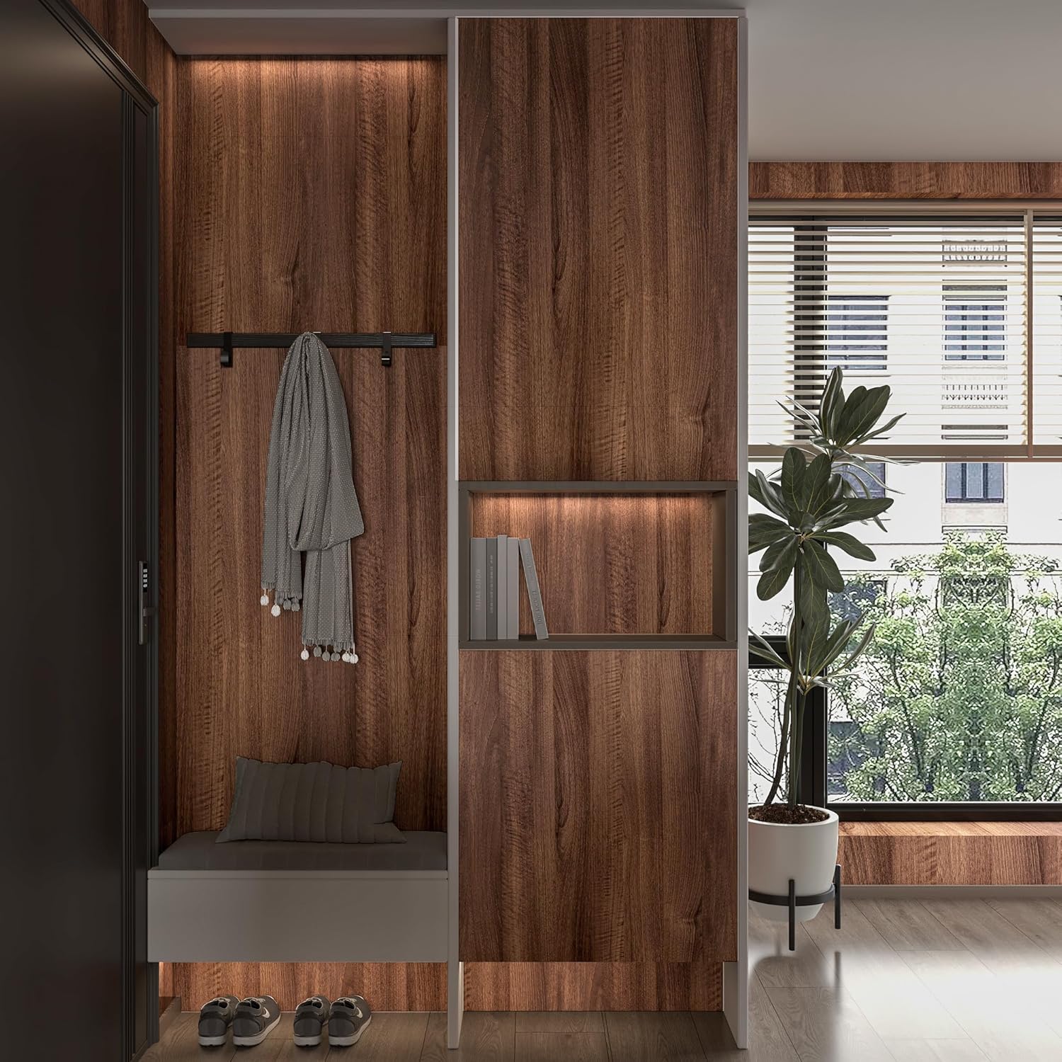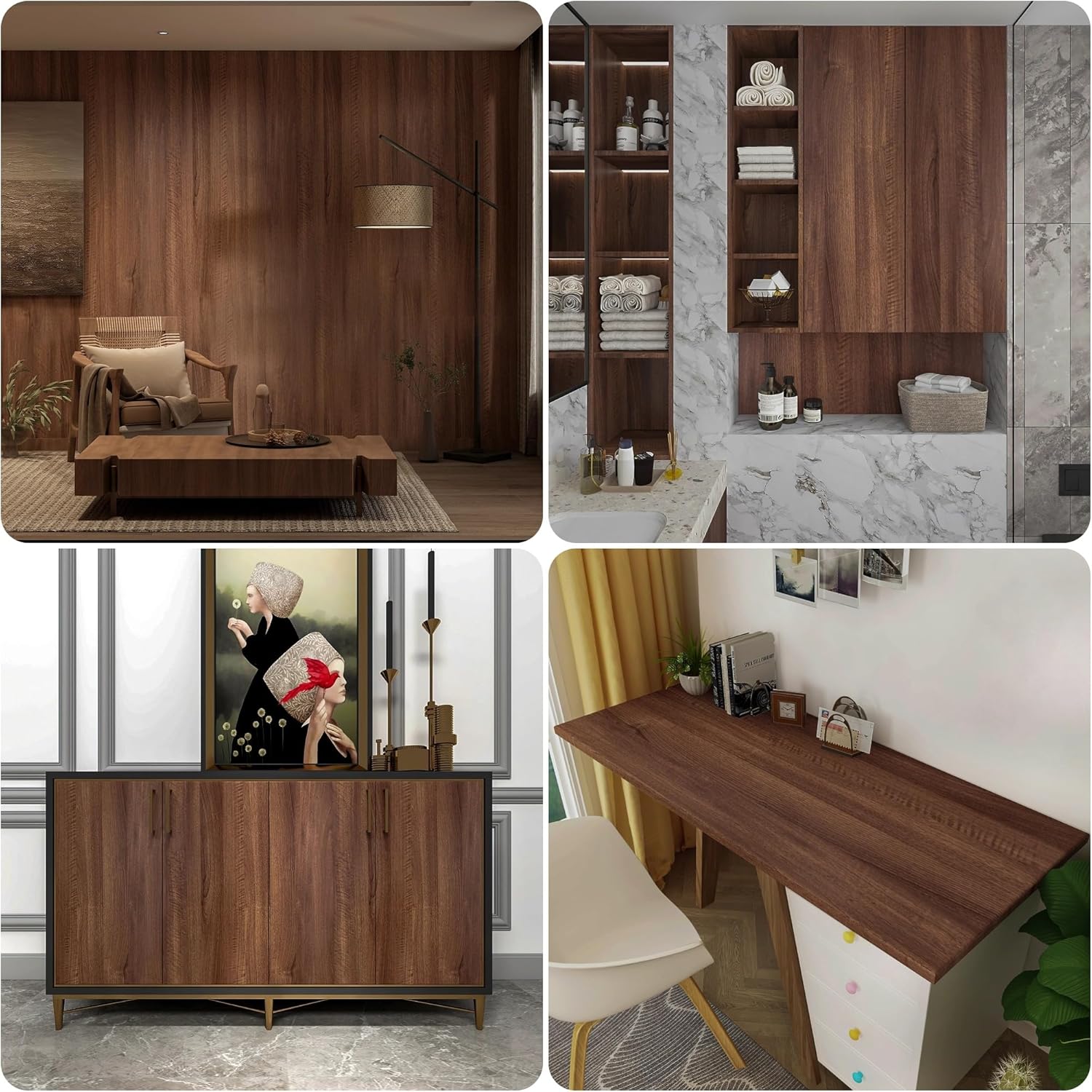 About this itemnMaterial: Walnut contact paper is made of high quality vinyl, waterproof, oil resistant, durable and easy to clean.nFeatures: Walnut wallpaper peel and stick, the back has an air-conducting groove design, which can effectively reduce the troubles caused by air bubbles during installation, wood grain self-adhesive contact paper, thickened, self-adhesive, removable, no sticky residue after tearing off, better protection of furniture.nSize: Faux wood grain contact paper measures 31.4 × 157.4 inches, with a total coverage area of 34.4 square feet. The back of the contact paper comes with grid lines, which makes it easier to measure and cut.nApplications: Brown wood texture wallpaper is suitable for flat,dry and smooth surfaces for home improvement,old furniture remodeling,as well as living room,bedroom,kitchen,cabinet,countertop,counter,table,drawer,shelf,liner,dresser,shelve,bookcase,closet,backsplashe,door panel,craft,accent wall,cabin,office,etc.nNote: Due to the different shooting Angle, light and display color resolution, there may be a little color difference, Holomey guarantees the quality of each wallpaper, if you encounter any quality problems during use or don’t like our products, please contact us in time, we will solve it for you in the first time.n See more product details
