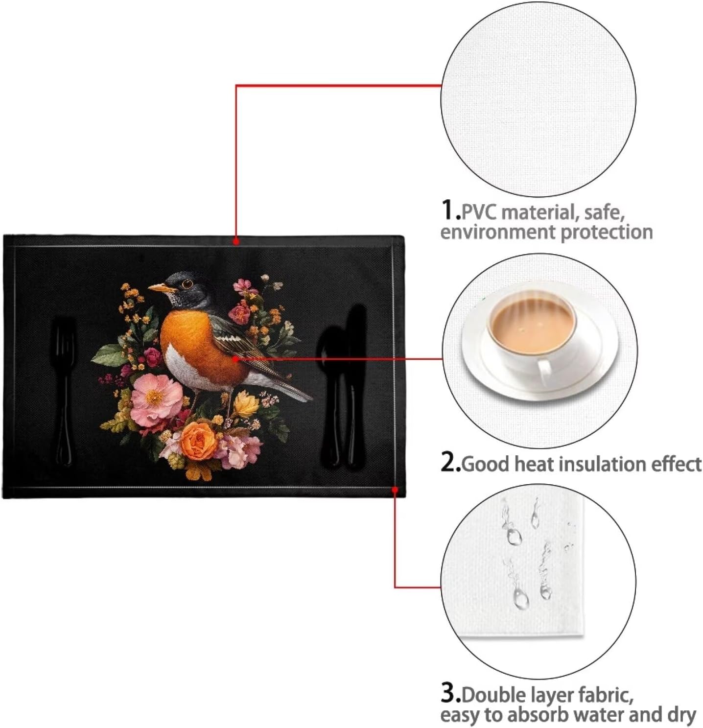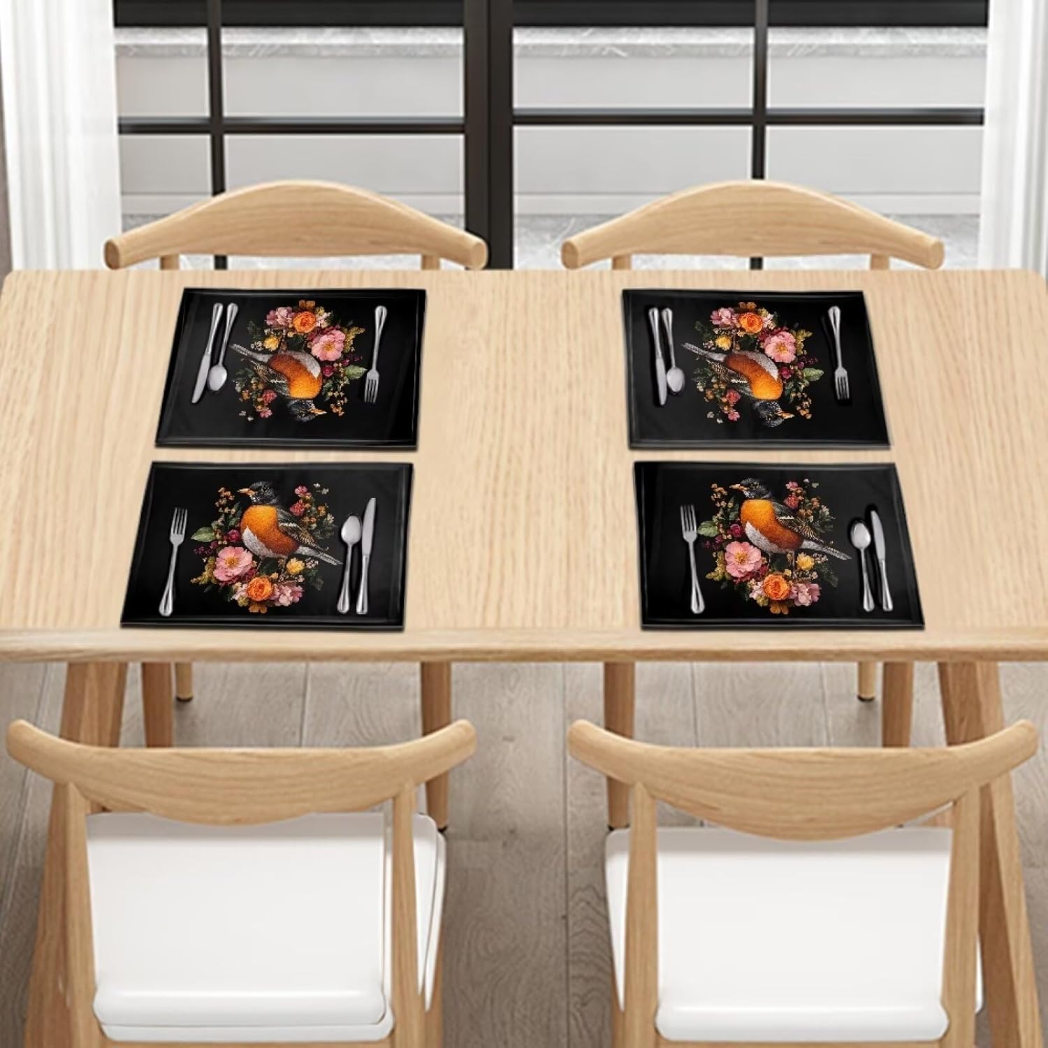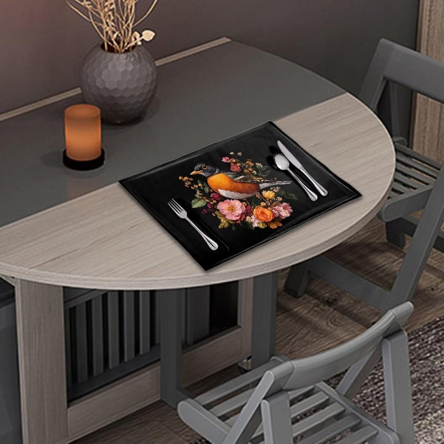 4 PCS Dining Table Mats Sturdy Non Slip Placemats for Kitchen Cafe Restaurant Heat Resistant Soft Countertop Accessory Decor, 11.8 x 17.7 Inch, American Robin Floral Black
