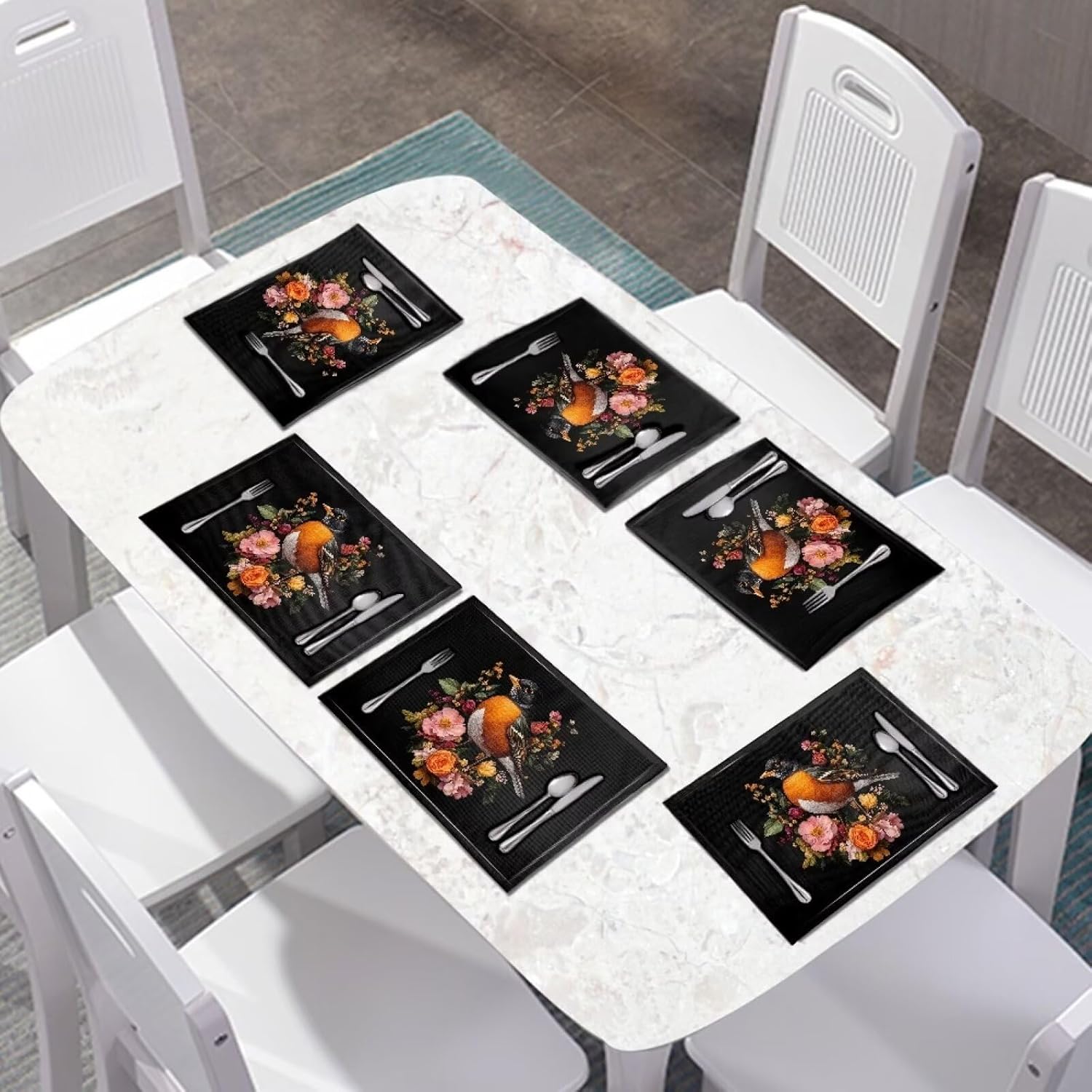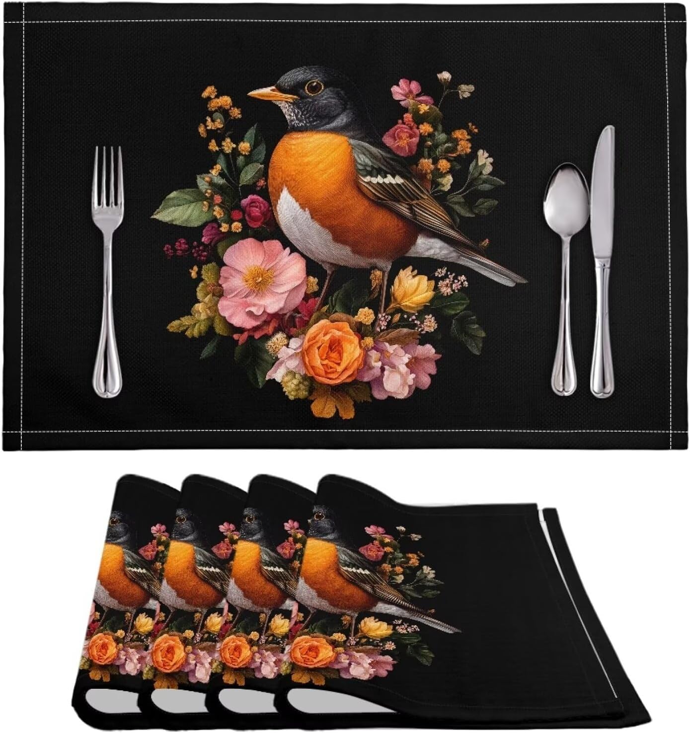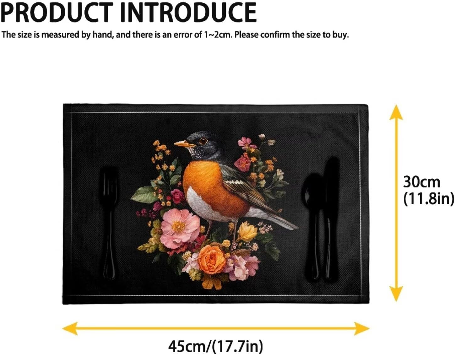4 PCS Dining Table Mats Sturdy Non Slip Placemats for Kitchen Cafe Restaurant Heat Resistant Soft Countertop Accessory Decor, 11.8 x 17.7 Inch, American Robin Floral Black