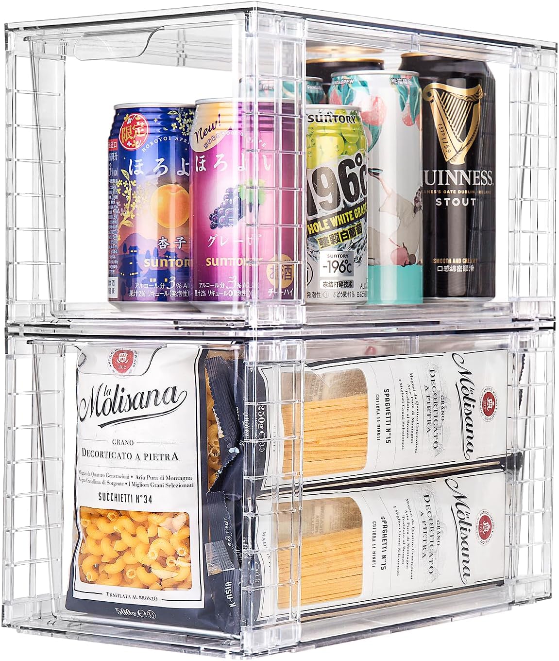 4Pack Large Stackable Kitchen Storage Drawers, Clear Foods Organizer Bins with Handles, Easily Assemble for Bathroom, Kitchen, Pantry, Cabinet, Closet(XL-UP Handle)