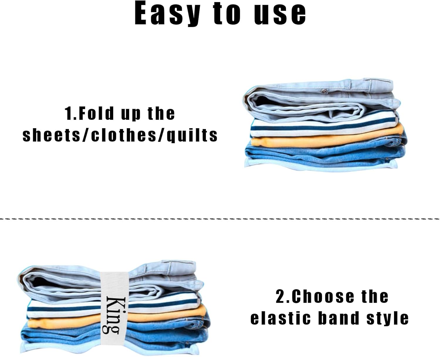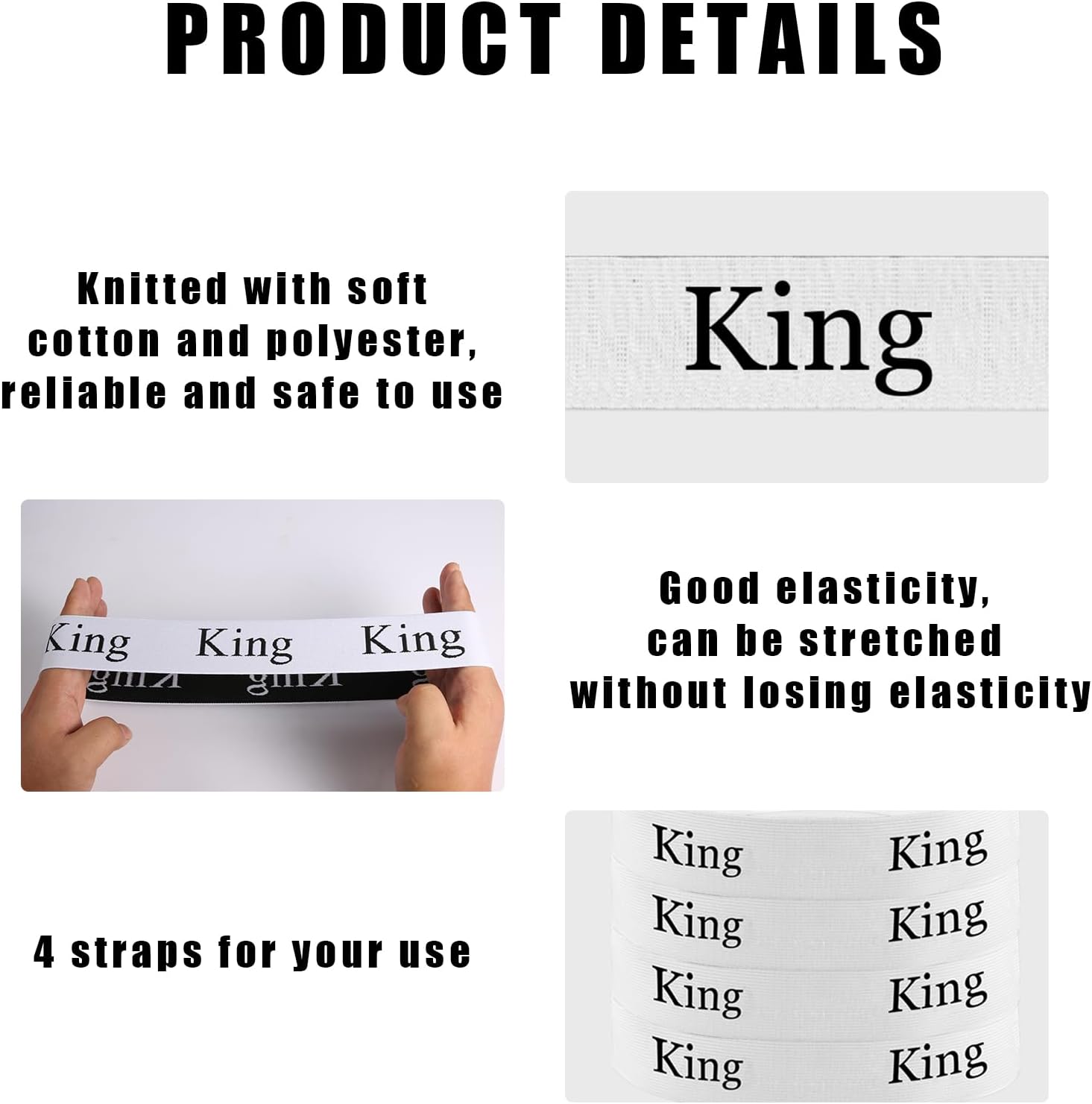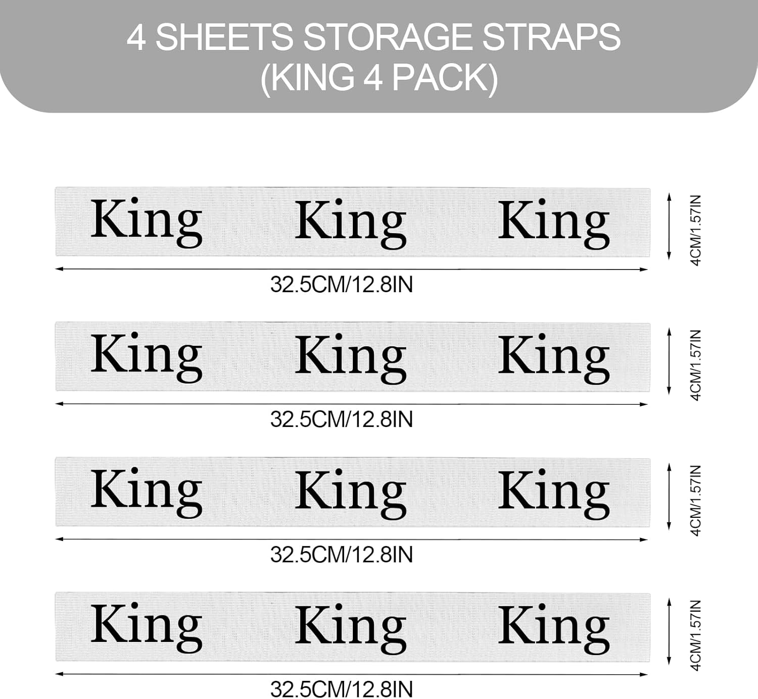 Package Content: You will get 4 pieces of elastic bed sheet straps, Sufficient quantity to meet your needs.nQuality Material: The bed sheet organizer bands are made of elastic fabric, lightweight and super elastic and sewn well, sturdy and durable, not easy to break or deform, ensuing long-term use.nQuality Material: The bed sheet organizer bands are made of elastic fabric, lightweight and super elastic and sewn well, sturdy and durable, not easy to break or deform, ensuing long-term use.nStretchable and Durable: These elastic organizer straps are not only stretchable but also durable. Strong elastic ensures it can be used for long time. Suitable for storing and identifying sheets of any thickness.nWidely Used: Our bed sheet straps are widely used for organizing bed sheets, blankets, clothes, coats, pillows, thin quilts, etc., which can keep your closet in bedroom, laundry room, bathroom or dormitory in order and save the space.
