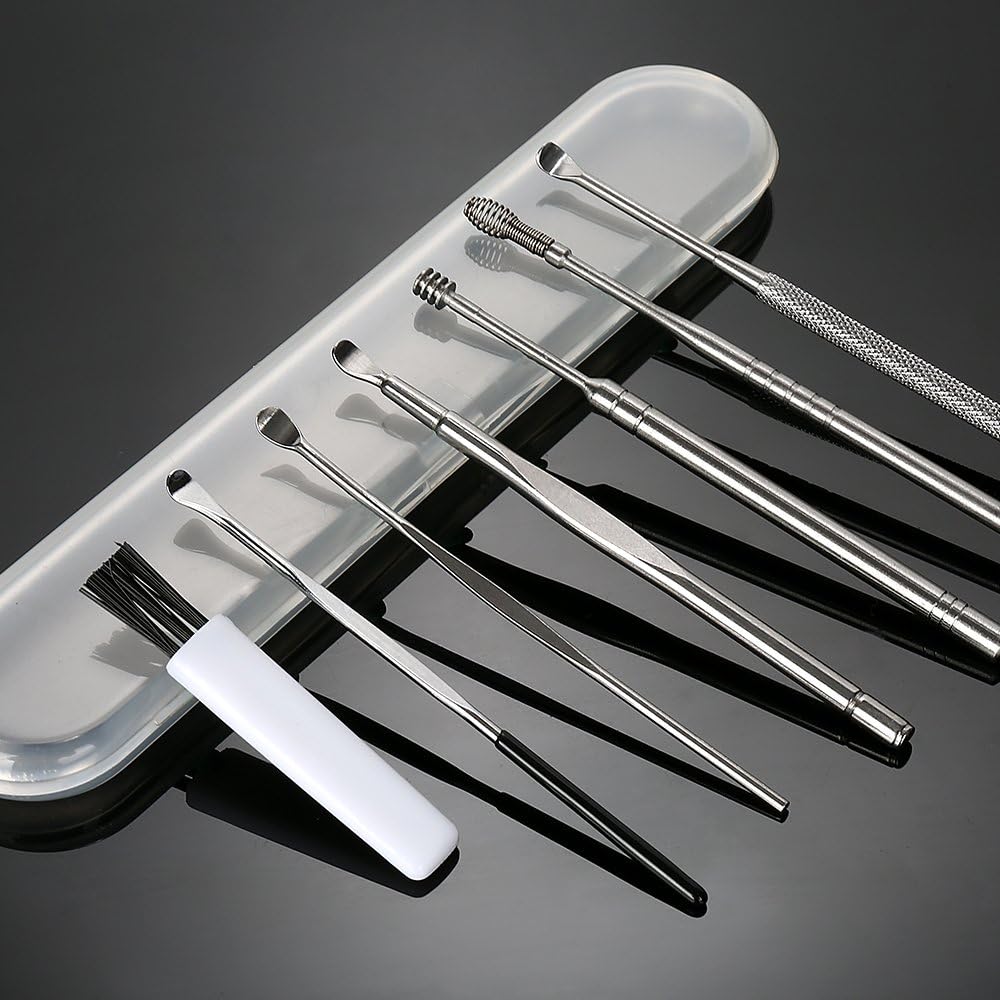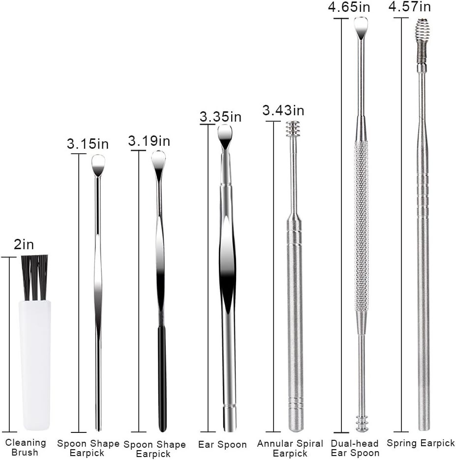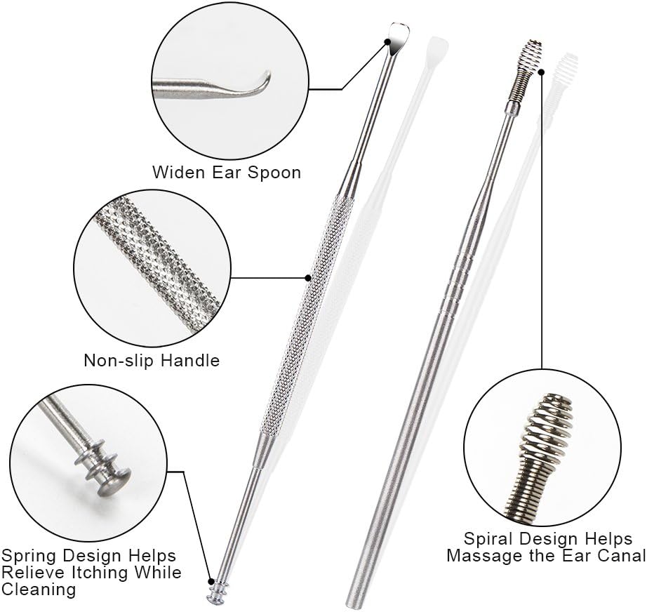 EAR CLEANSING TOOL: Different from the cotton swabs which may further push the wax into the ear, the scoop shaped ear pick can remove buildup earwax effectively. The cucullar and spiral double-head design earpick can help you massage the ear canal and relieve itching. Our ear pick are professional tools for your earsnSTAINLESS STEEL MATERIAL: All earwax removal tool are made of stainless steel, sturdy enough, easy to clean. They’re extra solid in use and not easy to distort. These ear picks are safe for you or your family to usenINTIMATE DESIGN: Every ear pick are fully polished with smooth and rounded surface in case to prevent any irritation or scratching and make sure you can massage the ear canal while cleaning. The handles of the ear pick tools are designed for a non-slip gripnEASY TO USE AND CLEAN: Rinse the ear pick off thoroughly with soap and water before and after use. And then clean them with alcohol and you can use the cleaning brush to clean the debris before and after usenWELL PACKAGED AND PORTABLE: Comes with a portable box to store and you can take these ear wax removal tools to anywhere. You don’t need to worry losing tools when you need them next time. Suitable for daily home use or travel use, and also a great choice for your family