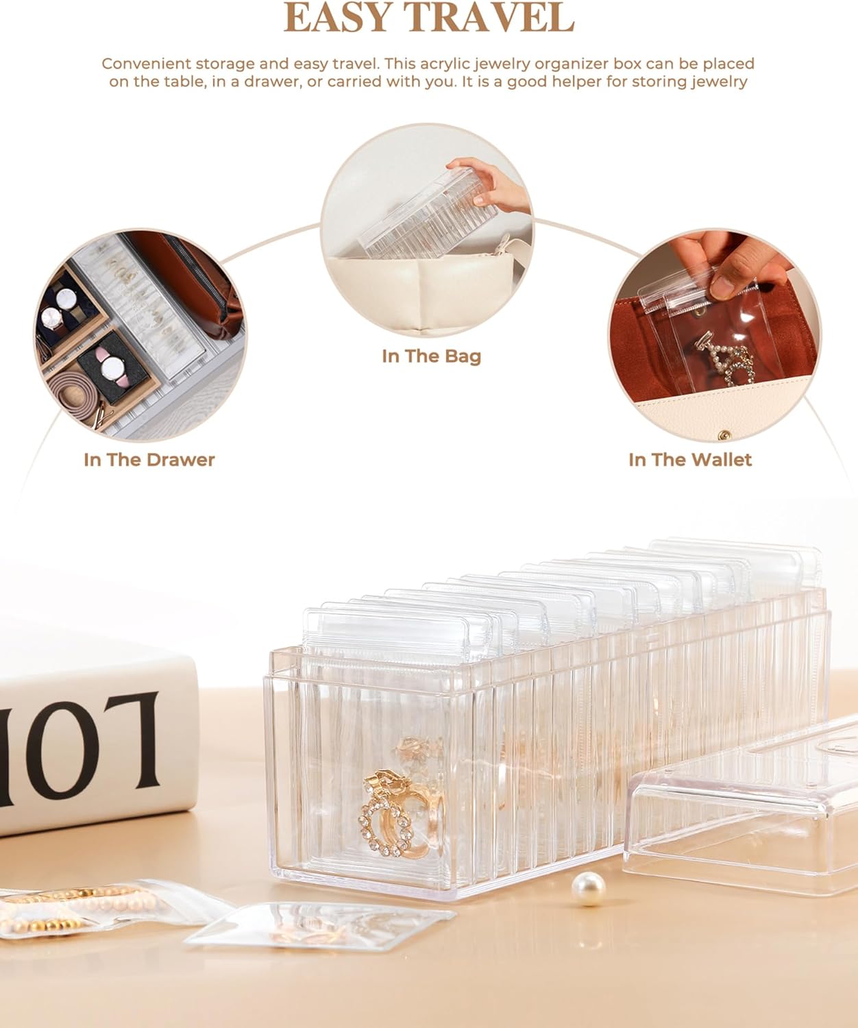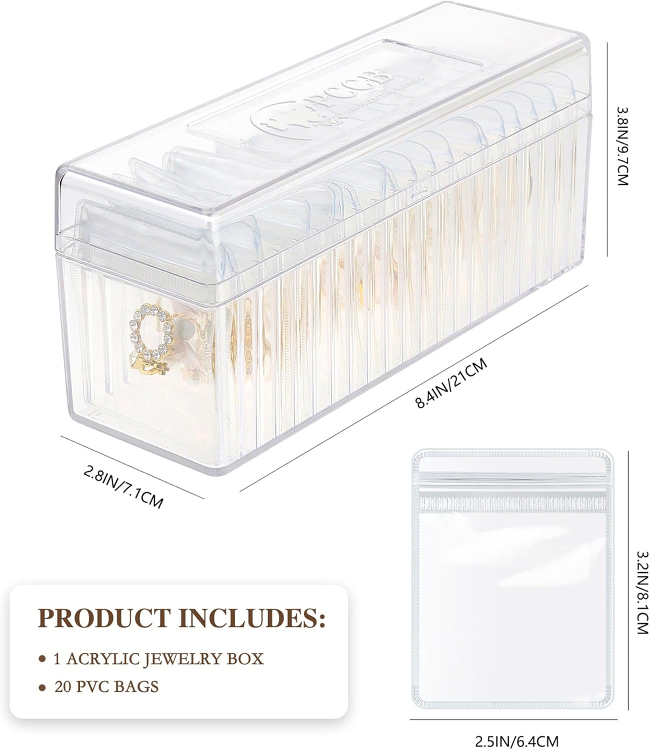 About this itemn?Durable Acrylic Construction: Crafted from high-quality, sturdy acrylic, our clear jewelry organizer is built to last, providing reliable protection for your precious jewelry. Its transparent, lidded design not only showcases your jewelry but also keeps it dust-free and waterproof.n?20 Portable PVC Pouches: The included 20 portable PVC jewelry bag are designed for durability and convenience. Their thick, transparent material resists tearing and securely seals to prevent jewelry from oxidizing. (Warm reminder: The size of the jewelry bag is 3.2 * 2.5 IN. For your shopping pleasure, please check whether the size of your jewelry is suitable.)n?Secure & Organized Storage: With 20 fixed slots, our jewelry holder organizer ensures your jewelry stays neatly organized and easily accessible. No more tangled necklaces or misplaced earrings; everything has its place.n?Compact & Travel-Friendly: Measuring 8.4 x 2.8 x 3.8 inches, our jewelry organizer box fits neatly in drawers or can be used to store your favorite pieces in the PVC jewelry bag, ready to grab and go. It’s a travel essential for keeping your jewelry safe and organized on the go.n?Perfect Gift for Her: Whether it’s for your mother, wife, girlfriend, daughter, friend, or colleague, our earring organizer makes a thoughtful and practical gift. Its elegant design and functional features make it an ideal choice for any special woman in your life.