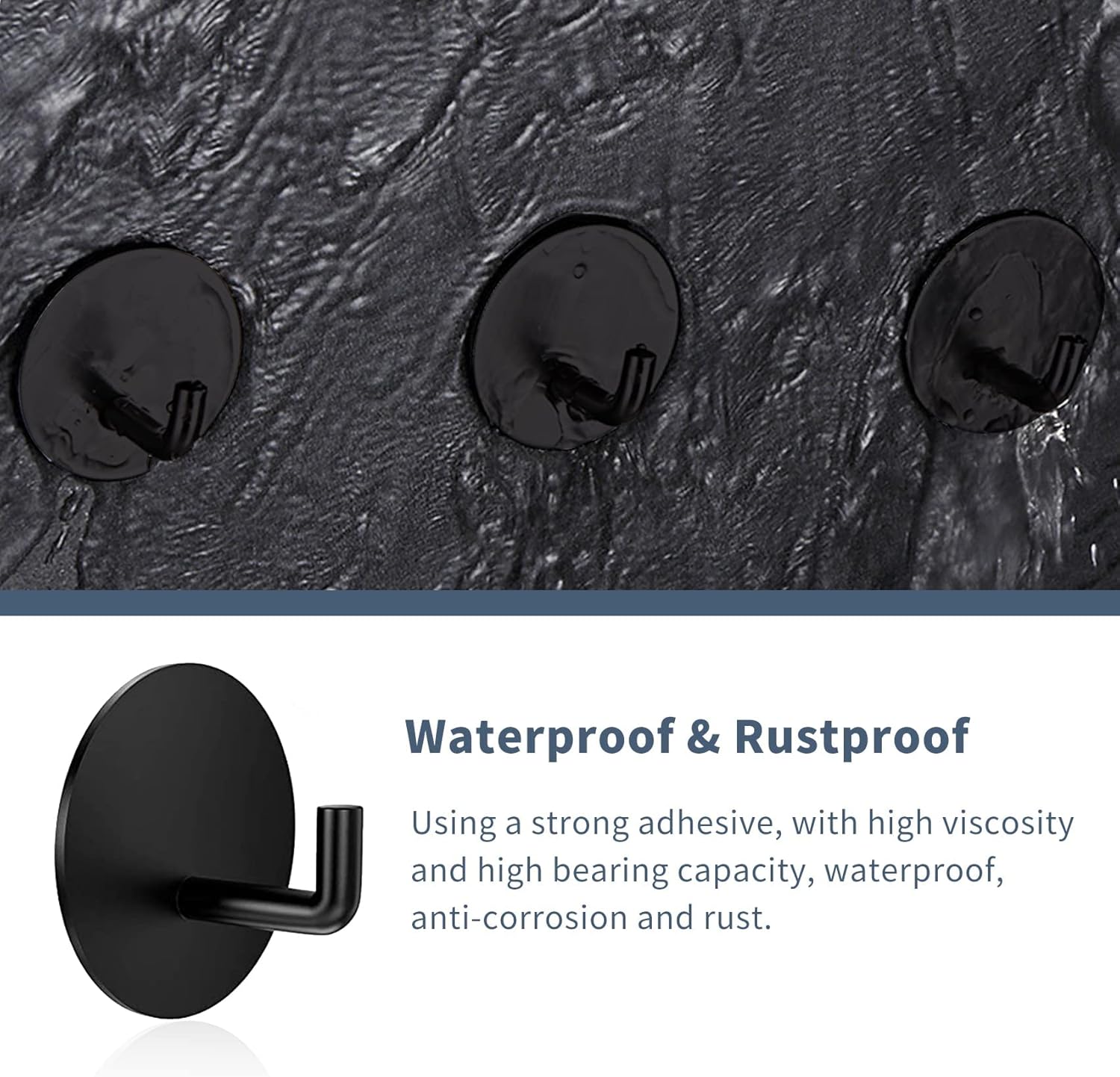 About this itemn? Waterproof Heavy Duty Sticky Wall Hooks ?Made of high quality of 304 stainless steel. Able to resist daily scratches, corrosions, tarnish and rust. Those circle stick on hooks use strong adhesives, the maximum load-bearing capacity is 6 lbs.n? Widely Used Sticky Hooks ?Suitable for inside shower, bathroom, bedroom, kitchen, closet and living room. Able to hang, sponge, towels, loofah, coats, purses, bag, keys, washcloths, clothes, hats, mug and etc. Not recommended to hang fragile, expensive items.n? Works on Different Surfaces ?Those black adhesive hooks work on different surfaces such as wood, marble, clipboard, ceramic tile, glass, plastic, stainless steel and metal. Do not work on the paint wall and wall paper. It will damage the wall surface.n? Handy Damage Free Hooks ?Those self adhesive hooks are the perfect tool for a place that is not allowed drilling the wall, such as renting apartments, RV. The adhesive wall hooks are the convenient replacement for you. No damage to the wall.n? Easy to Install & No Drill Needed ? Tear it apart and paste it in the desired position and press firmly for a few seconds. The installation only takes seconds. We recommend wait 24 hours before hanging any items on it. When removed, use a hairdryer to heat the adhesive, it can be easily removed. No nails or screws are needed.n See more product details
