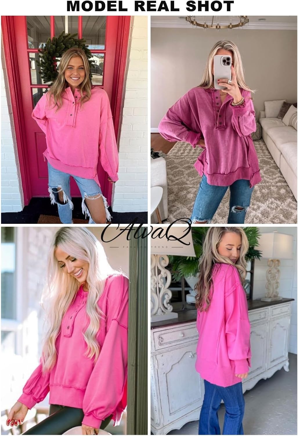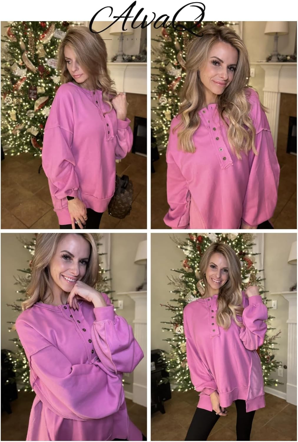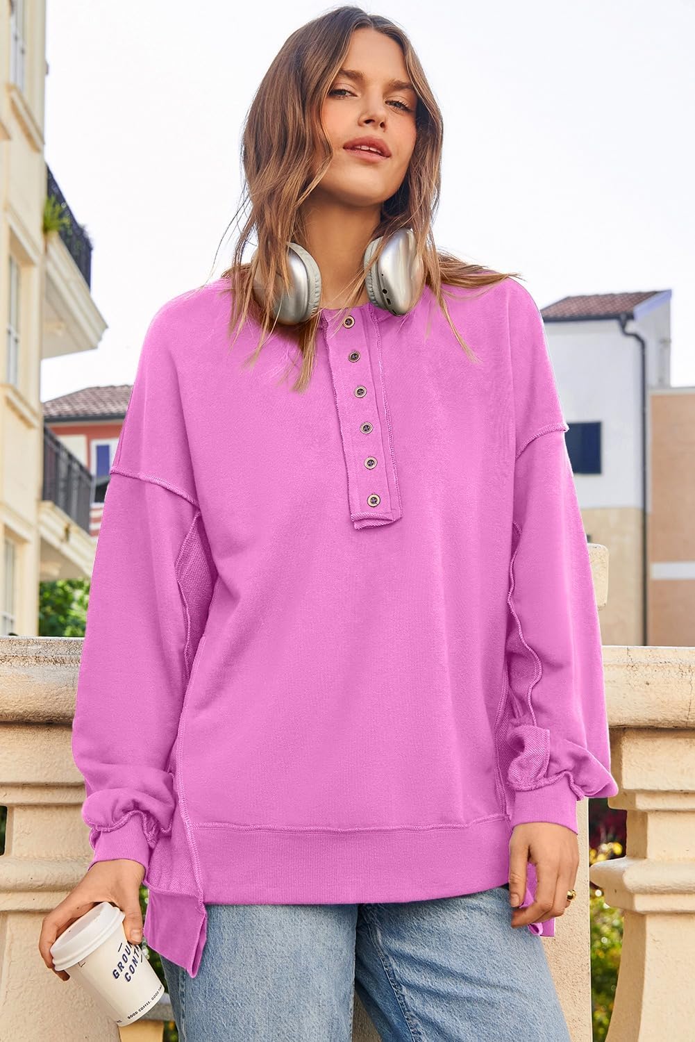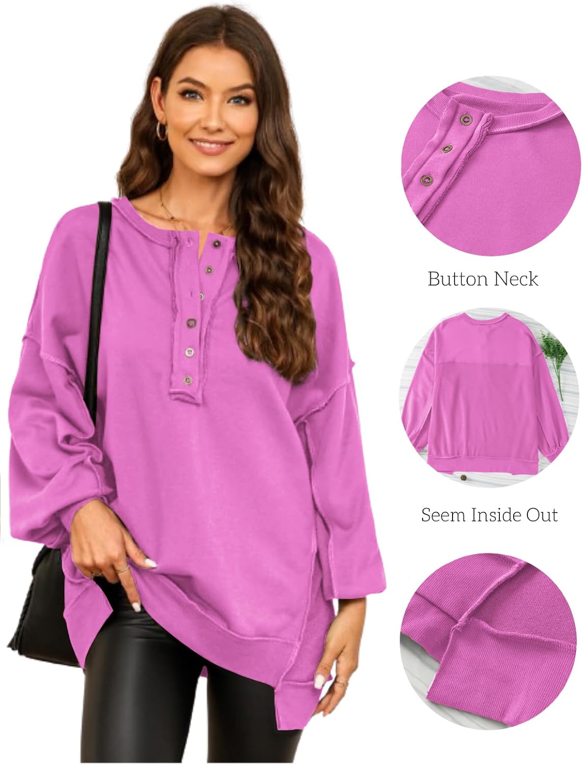 AlvaQ Women’s Oversized Sweatshirt Casual Long Sleeve Button Henley Neck Pullover Tunic Tops Outfits