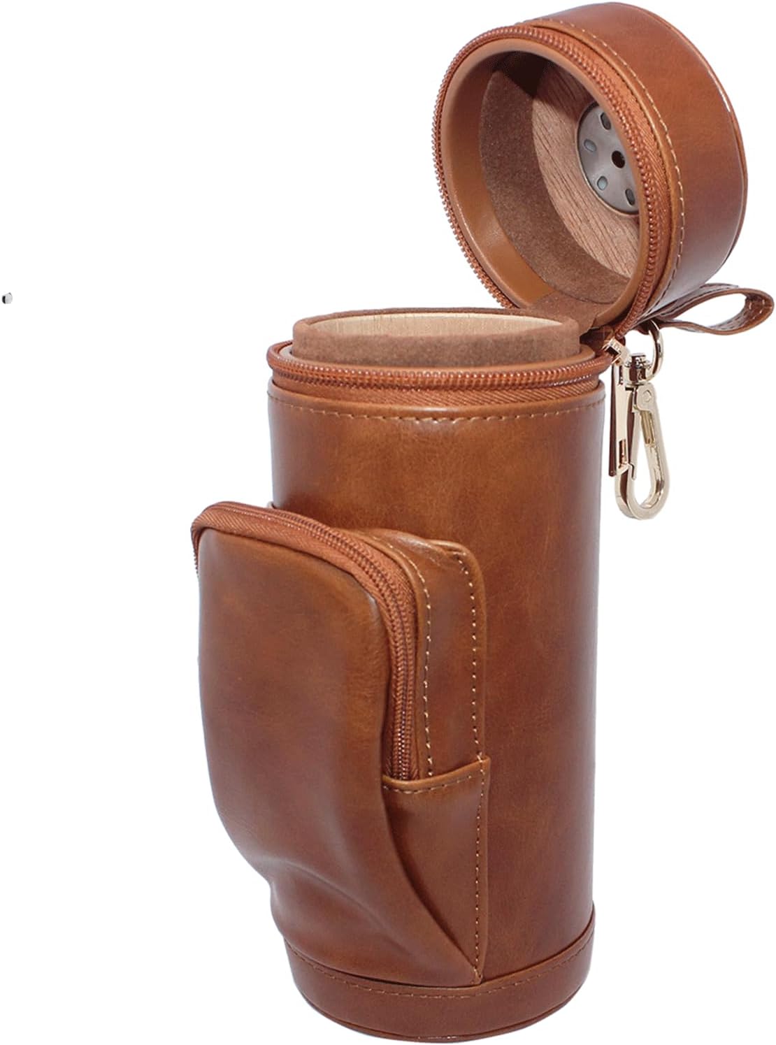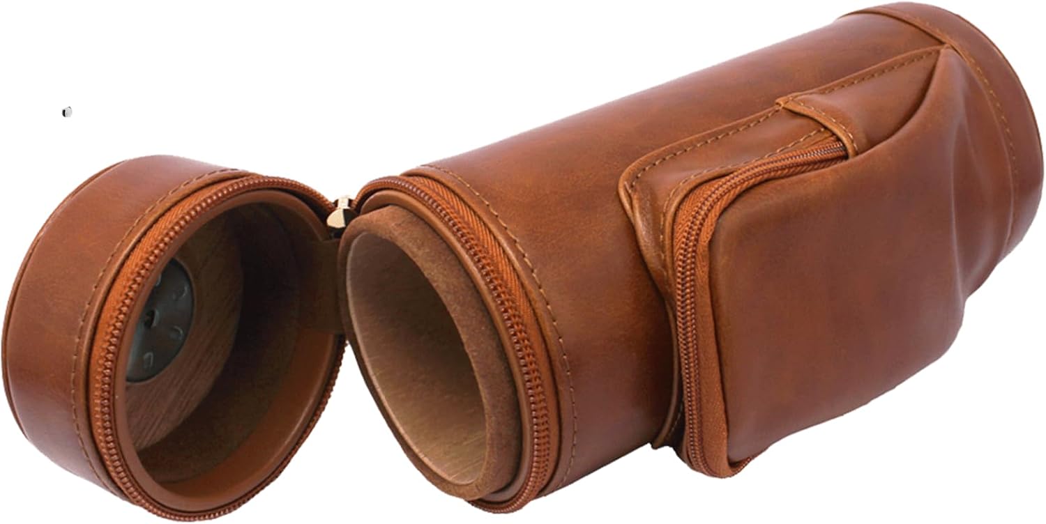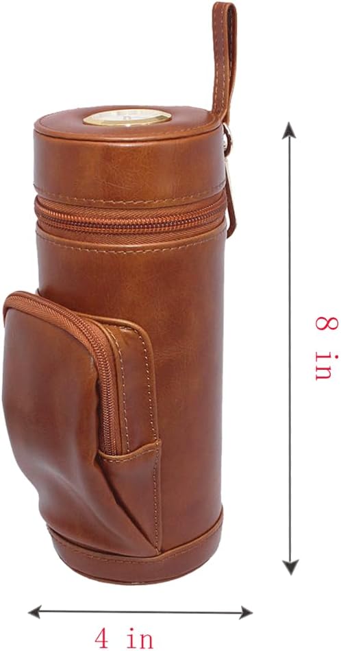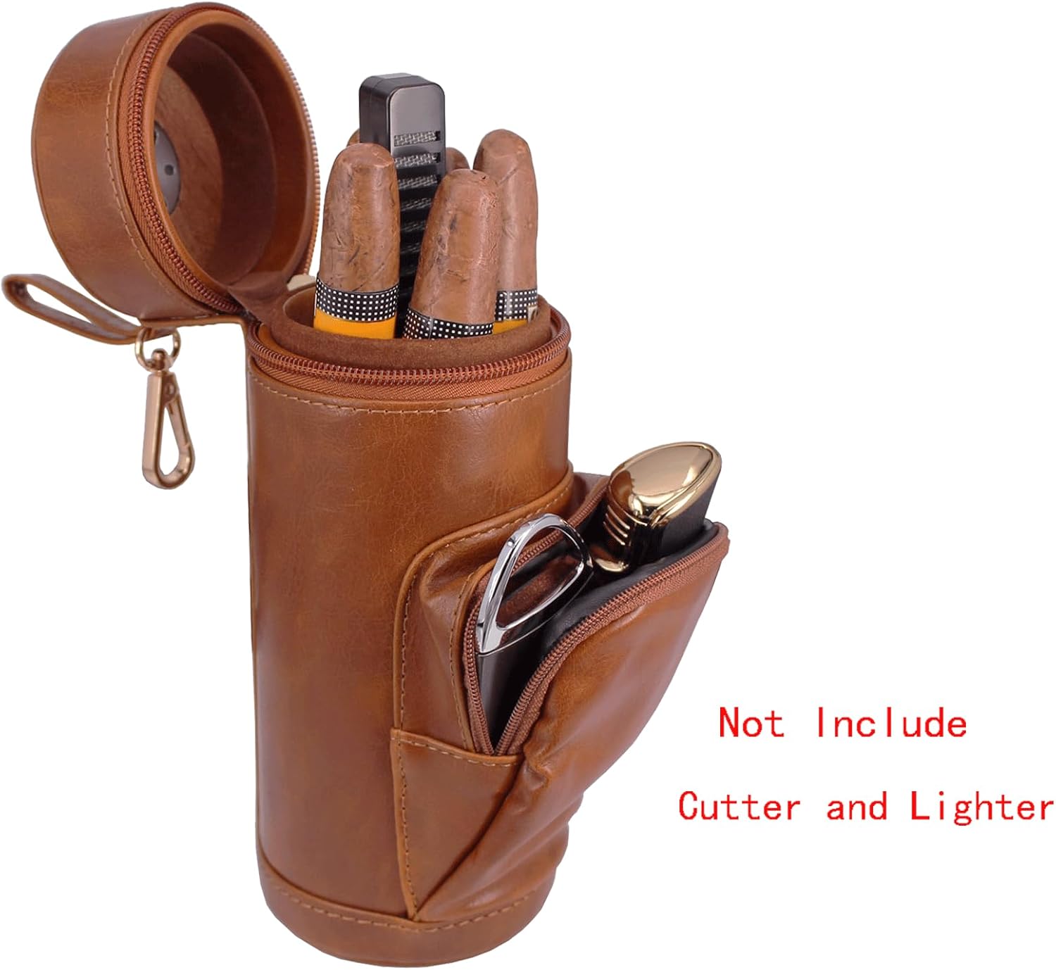 About this itemnBrown leather outside and cedar wood inside to keep cigars fresh. Attached Clip that will hook onto any belt, waistband, or pocketsnHolding 5cigars of max length 6.5 inches and up to ring gauge 52nNewly and Fashion design . Front pocket to store cutter and lighter Easily . Comfortably to carry anywhere with attached Sling. Monitor humidity at any time by exterior HygrometernPerfect Gift For Husband, Boyfriend and Dad,Any Cigar Lovers. It comes with Built-In Hygrometer, Long Humidifier, and Dropper ?Instruction.nPictured lighter and cutter Not included.