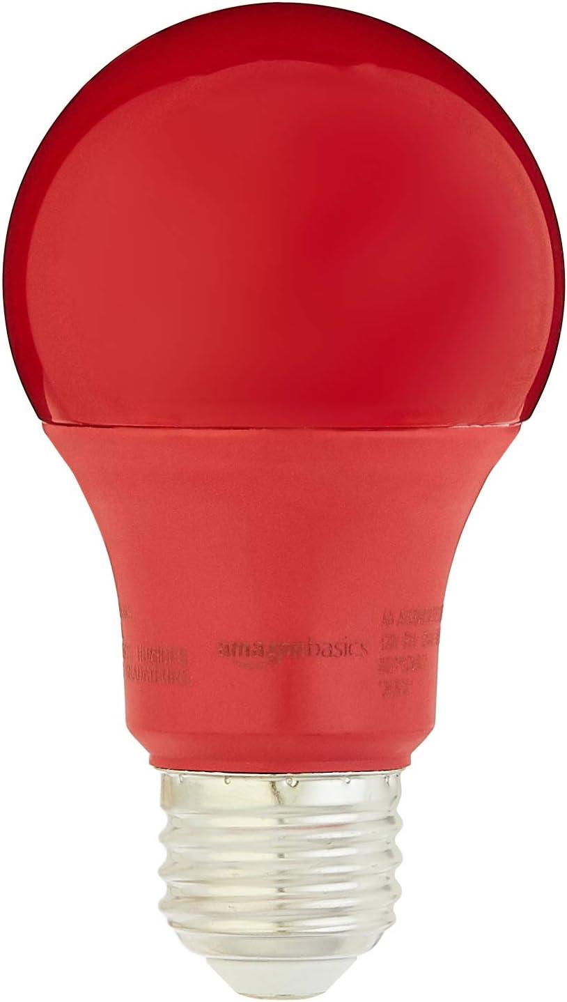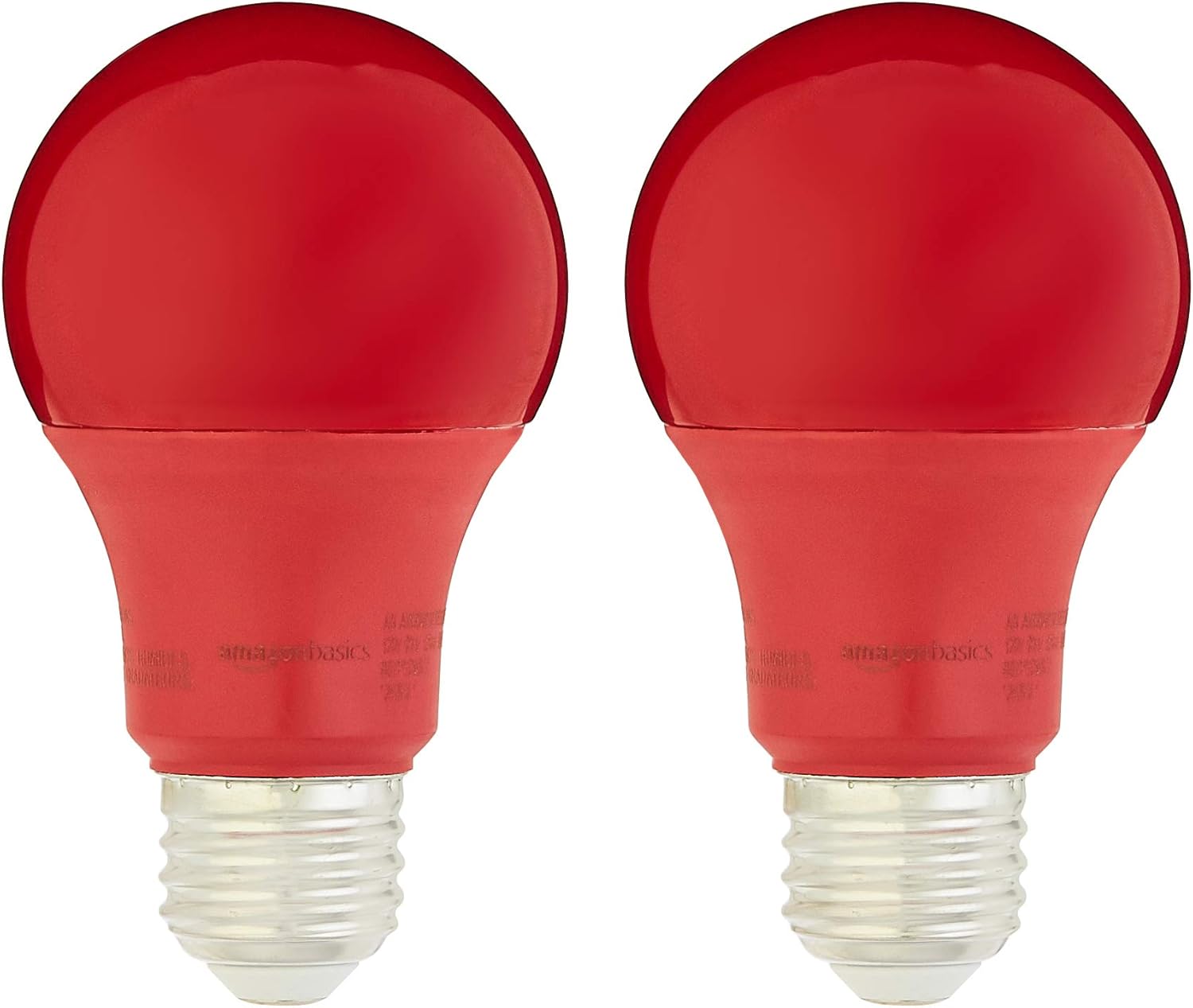 Amazon Basics A19 Red Color Party LED Light Bulbs, 60 Watt Equivalent, Energy Efficient 9W, E26 Standard Base, Non-Dimmable, 10,000 Hour Lifetime, 2-Pack