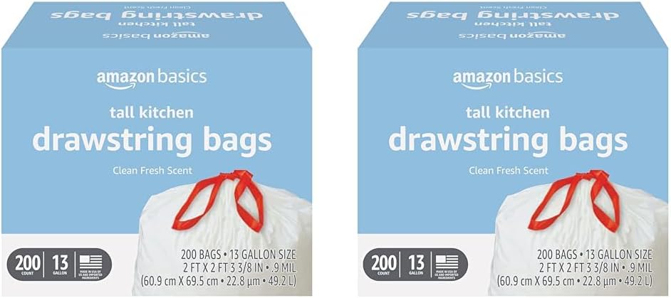 About this itemnIncludes 200 tall kitchen garbage bagsnIndividual bag dimensions: 24inches wide x 27 3/8 inches tall with 0.9 mil bag thicknessnEach trash bag has a 13-gallon capacitynWhite trash bag with red drawstring closure for easy tying and carryingnAlexa voice shopping enabled: to place your next order, just say. Alexa, reorder Amazon Basics Tall Kitchen Drawstring Trash Bags.n See more product details