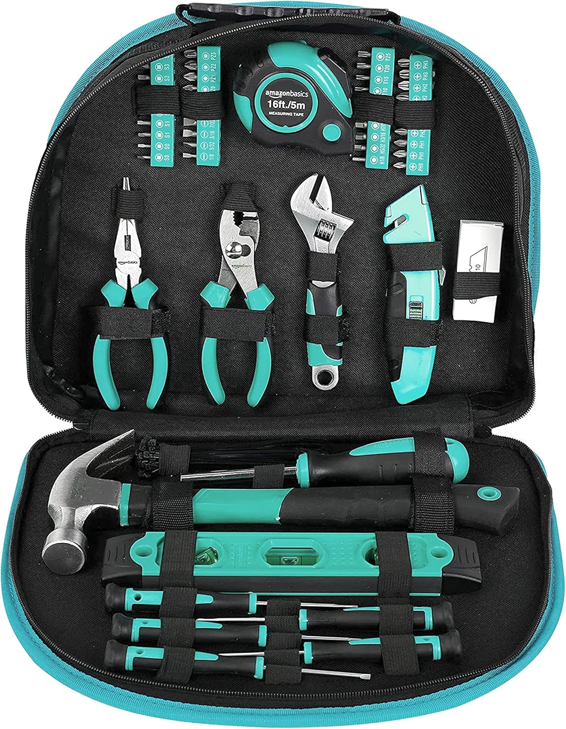 About this itemnVERSATILE TOOL SELECTION: Tackle everyday household projects with this comprehensive 104-piece basic tool kit for the home. Includes a hammer, level, pliers, magnetic screwdrivers and bits, wrenches, cable ties, a utility knife, and morenDURABILITY AND STRENGTH: Built with corrosion-resistant and heat-treated plating, this tool box set will stand demanding tasksnORGANIZATION MADE SIMPLE: Keep this small tool set secure and neatly arranged in the round storage case. The compact design offers easy transportation and accessibility wherever your projects take younCOMFORTABLE NON-SLIP HANDLES: Featuring easy-grip, non-slip handles, each tool in this small tool set is designed for maximum comfort and control, providing simple handling during each usenCONVENIENT COMPACT STORAGE: The portable round pouch offers a stylish turquoise finish, ideal for storing your kit efficiently and securelyn See more product details