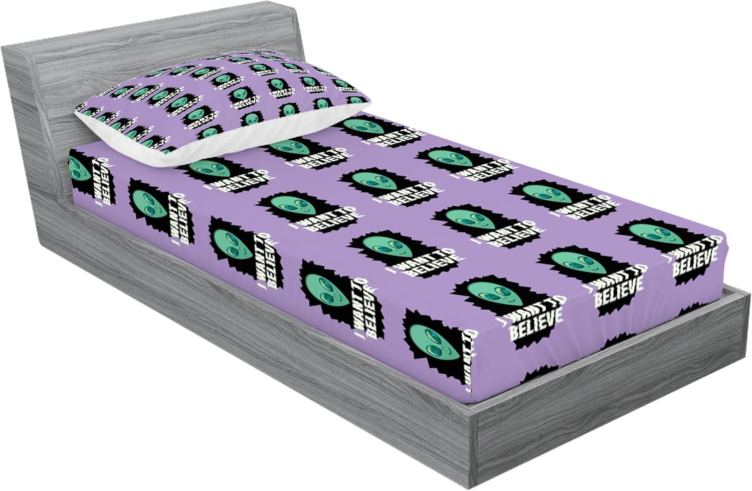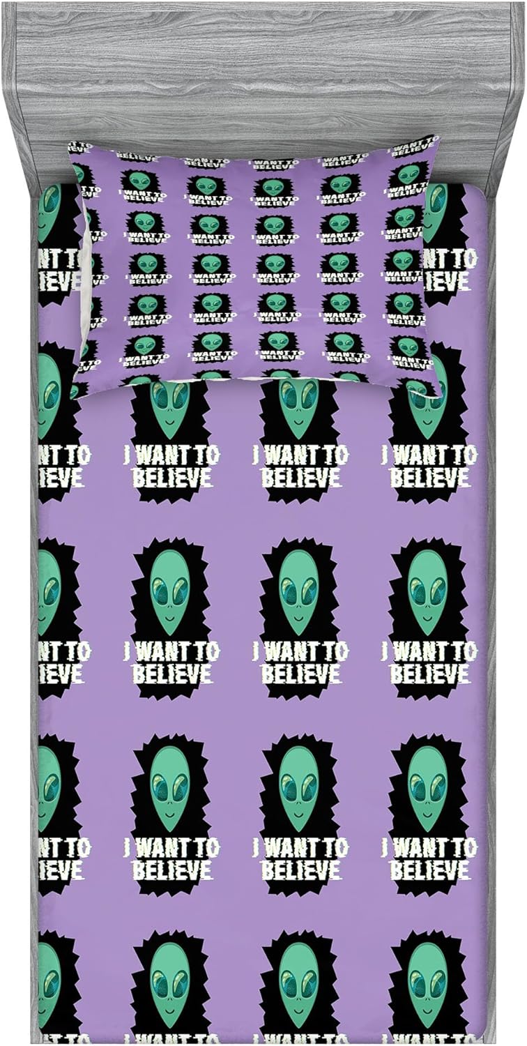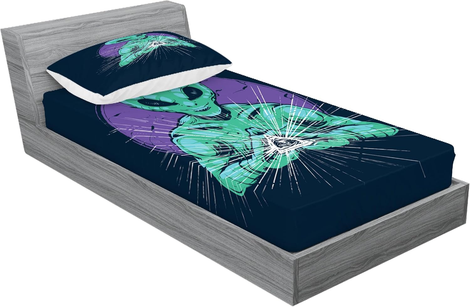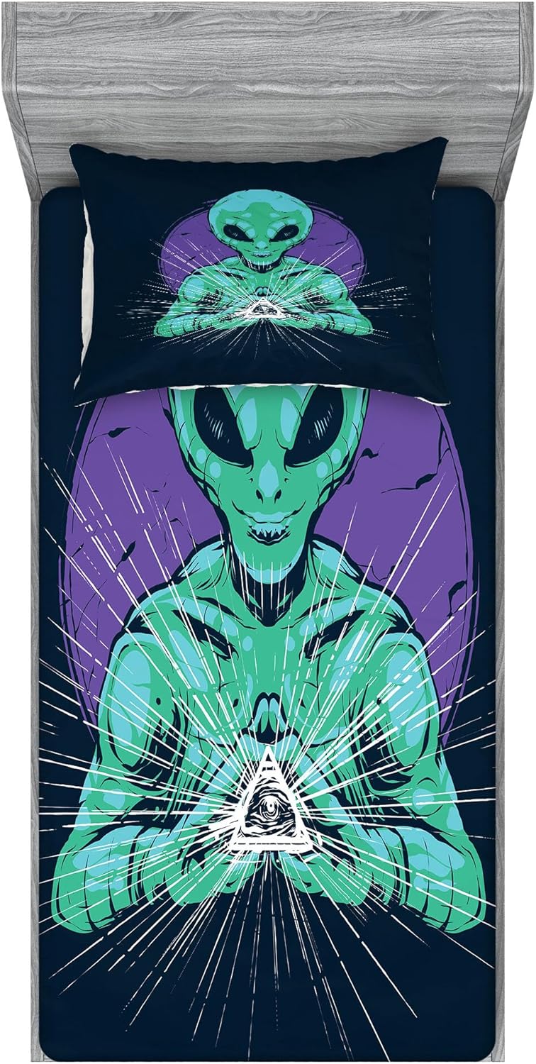Ambesonne Alien Fitted Sheet & Pillow Sham Set, Retro Extra-Terrestrial Character with Eye Triangle Illustration Art, Decorative Printed 2 Piece Bedding Decor Set, Twin, Navy Blue Violet Seafoam