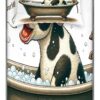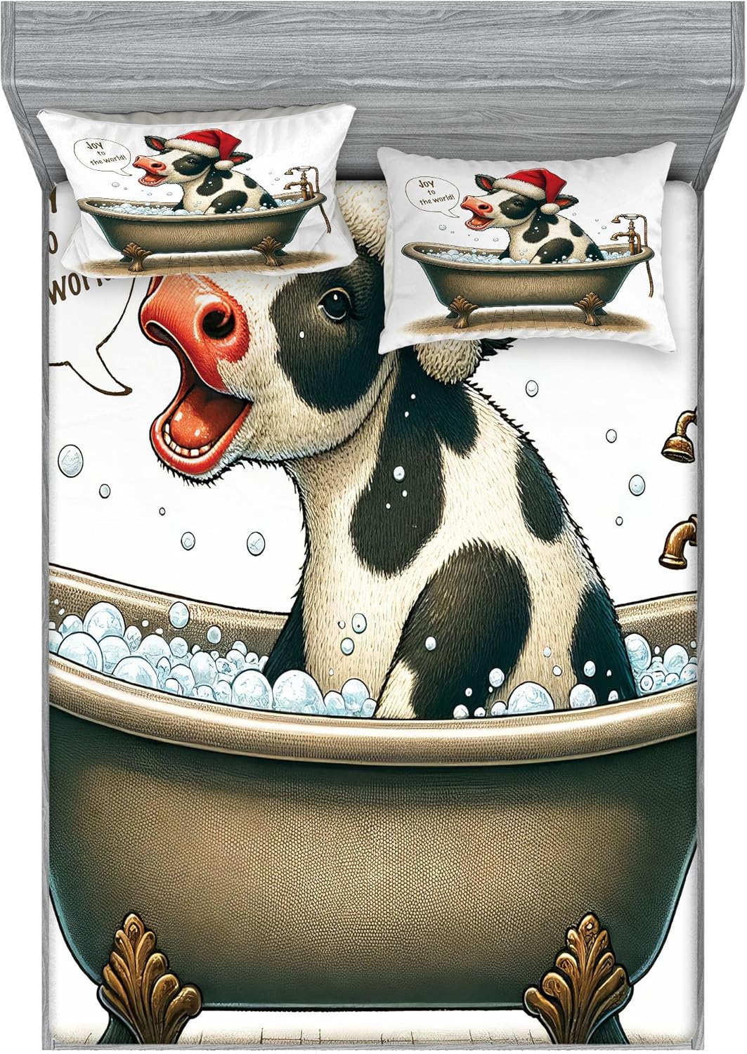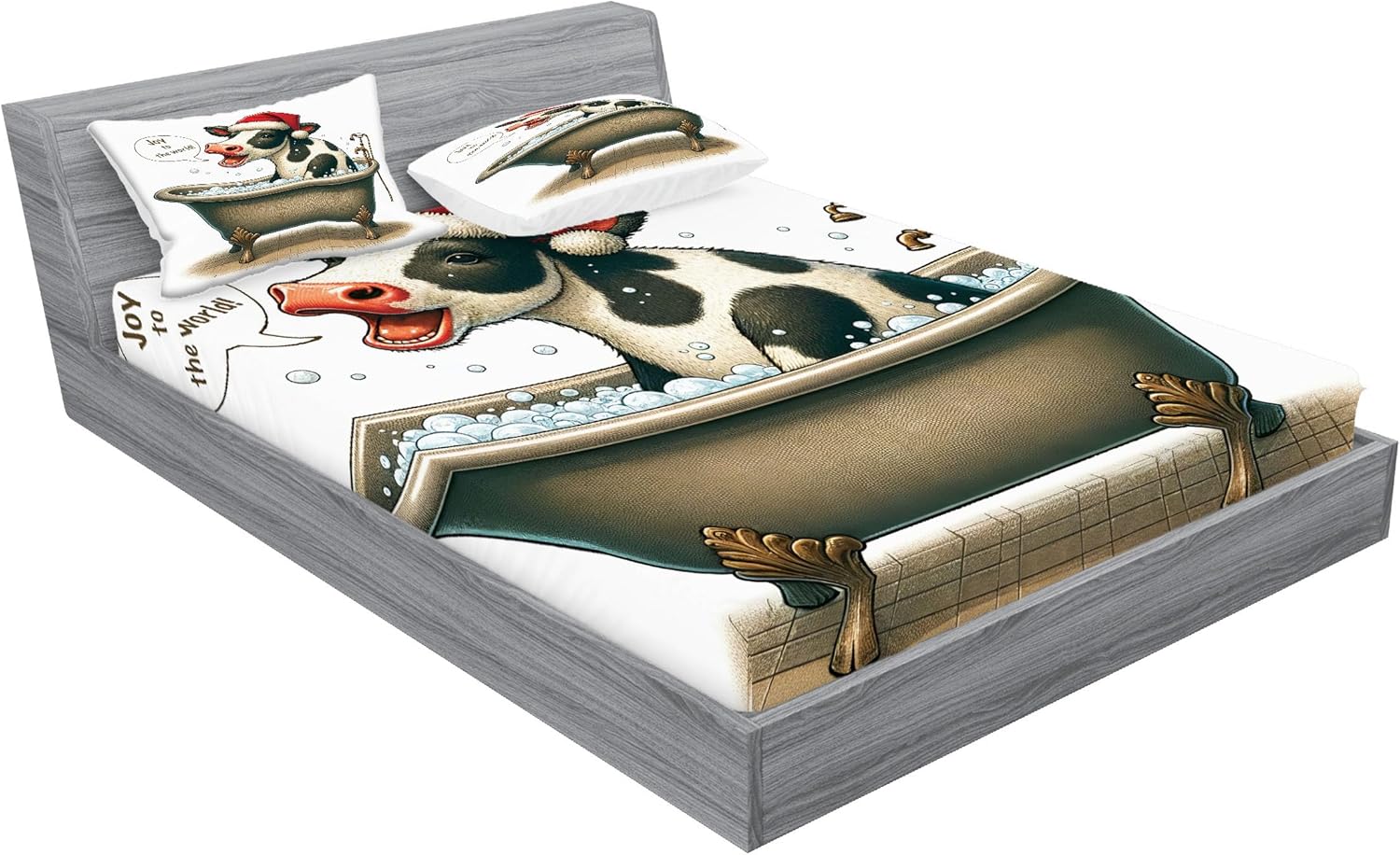 Ambesonne Christmas Fitted Sheet & Pillow Sham Set, Funny Cow Having a Bubbly Bath Humorous Xmas Caricature Joy to World, Decorative Printed 3 Piece Bedding Decor Set, Full, Dark Sepia Red White