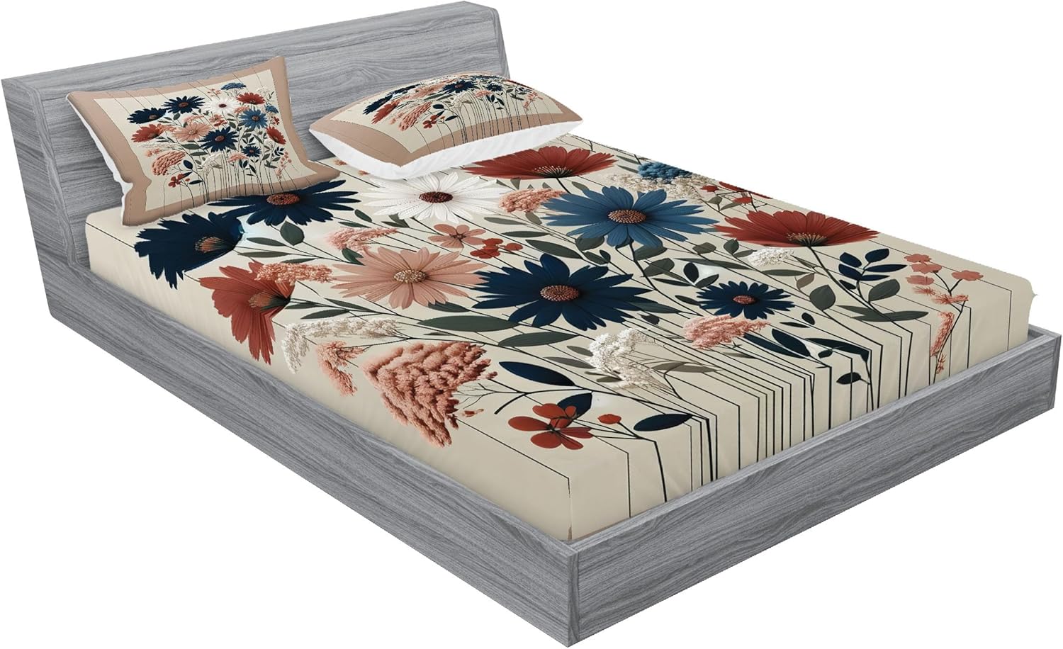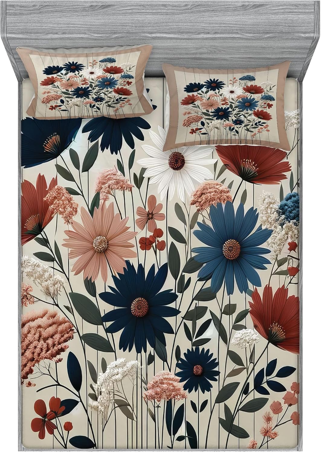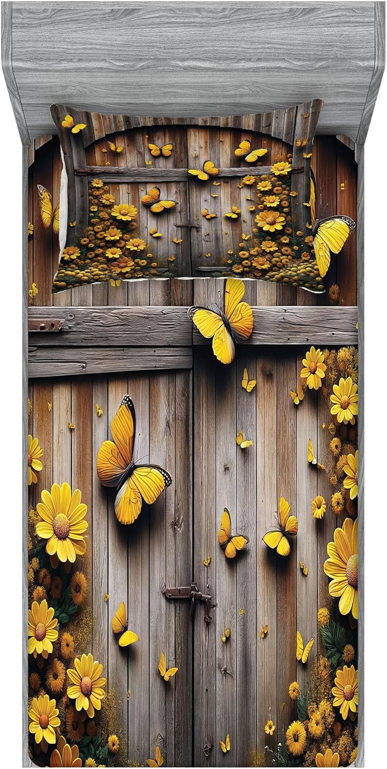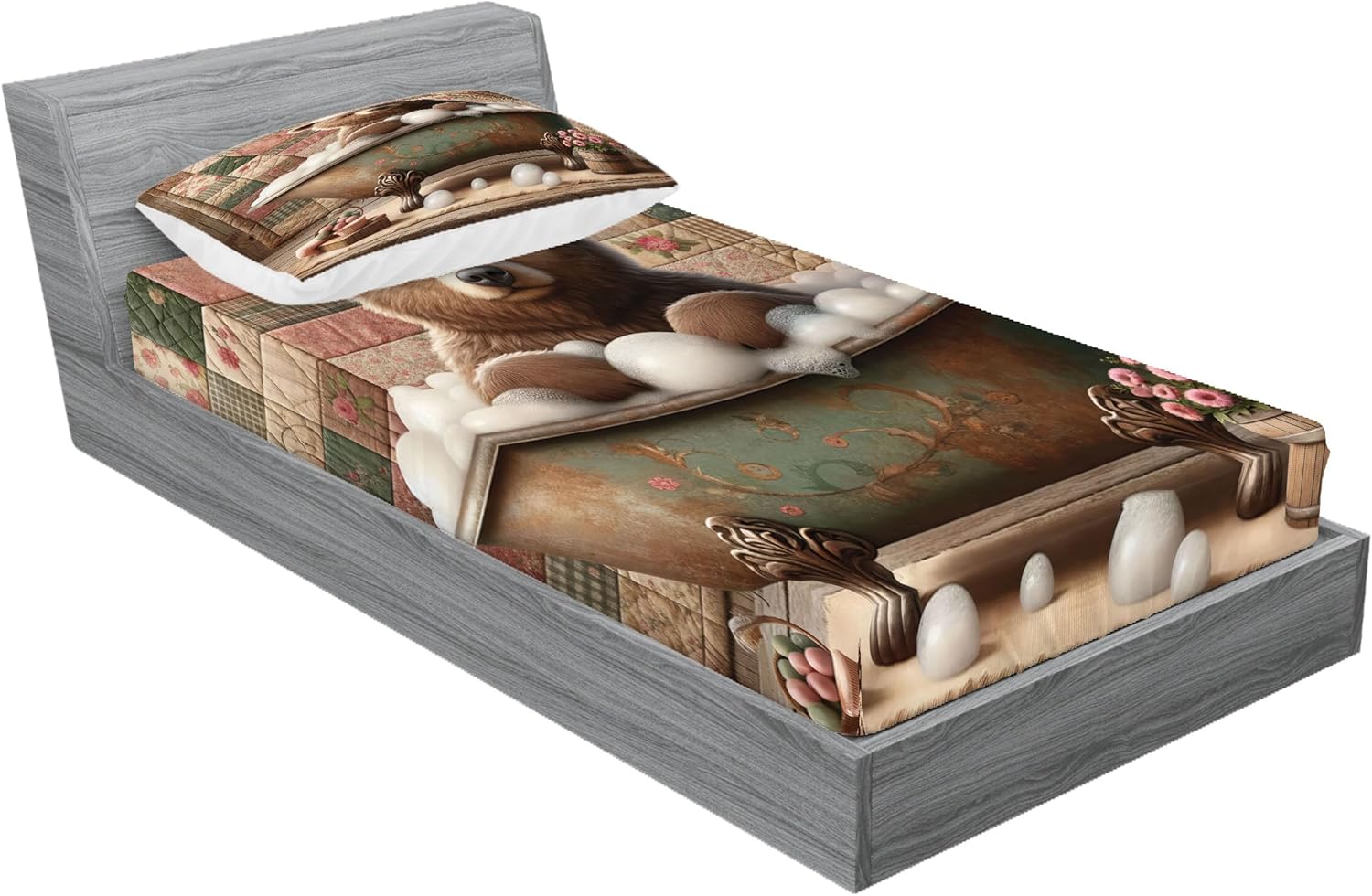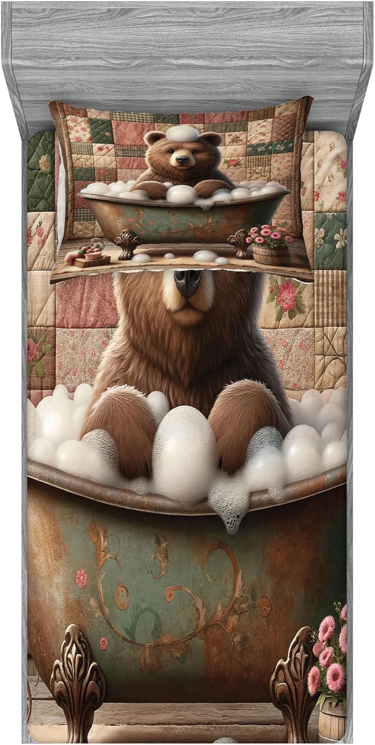 Ambesonne Rustic Fitted Sheet & Pillow Sham Set, Funny Grizzly Bear Weathered Bathtub Bubbles Farmhouse Flowers Patchwork, Decorative Printed 2 Piece Bedding Decor Set, Twin, Chocolate Rose Green