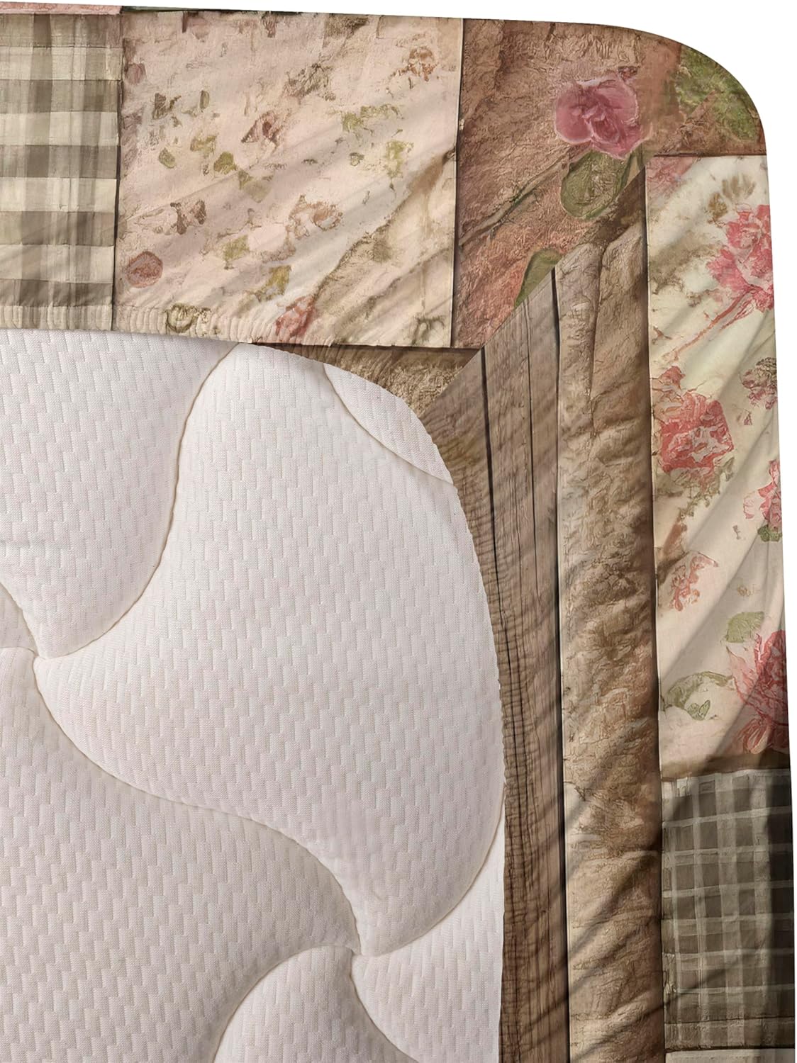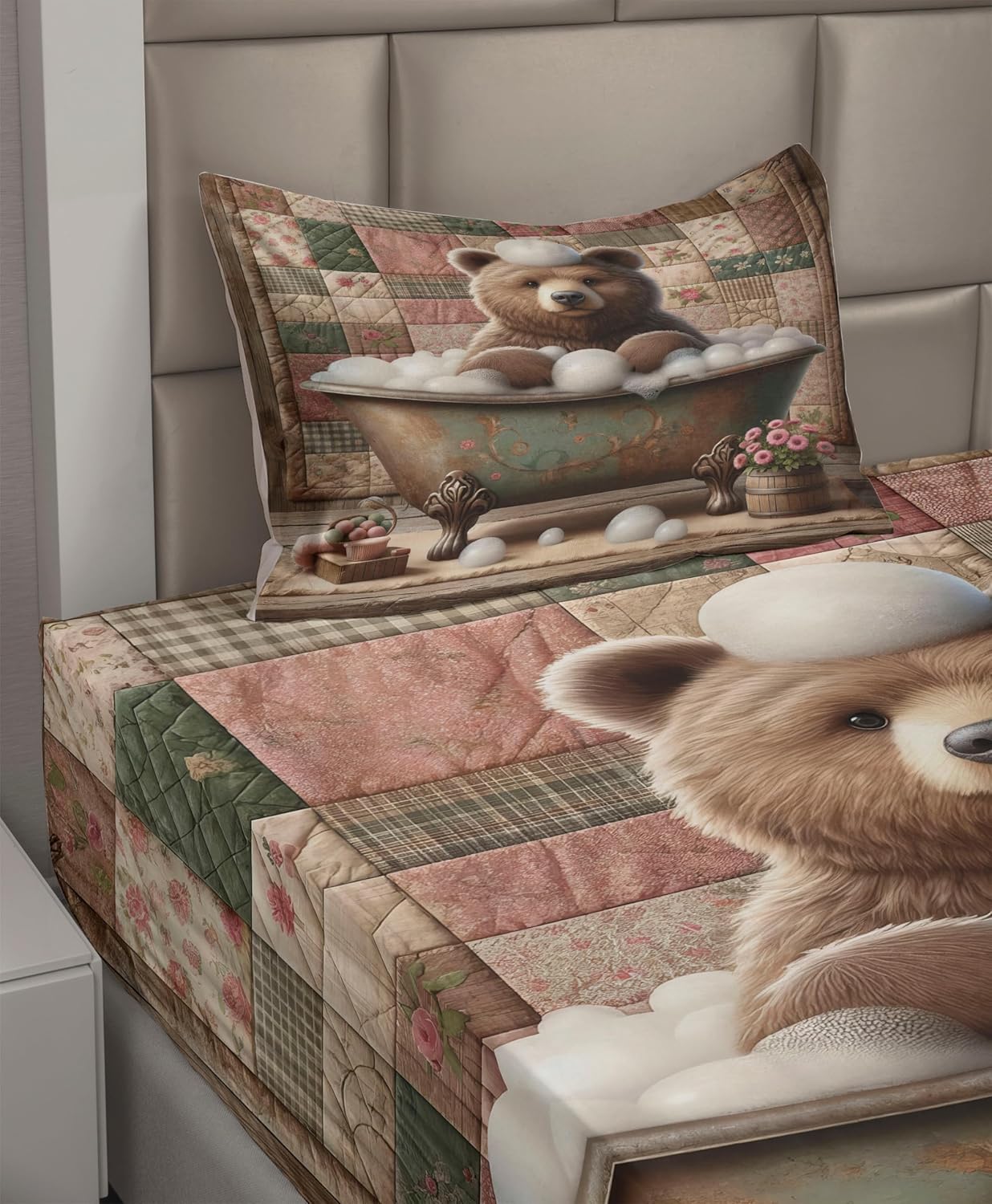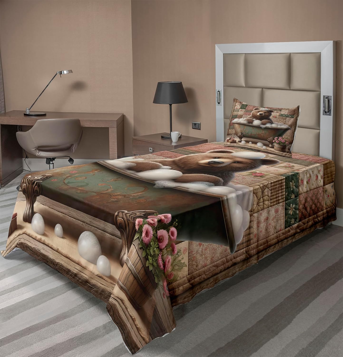Ambesonne Rustic Sheet Set, Funny Grizzly Bear Weathered Bathtub Bubbles Farmhouse Flowers Patchwork, Fitted and Flat Sheet with Pillowcase Bedding Accent 3 Piece Set, Twin XL, Chocolate Rose Green