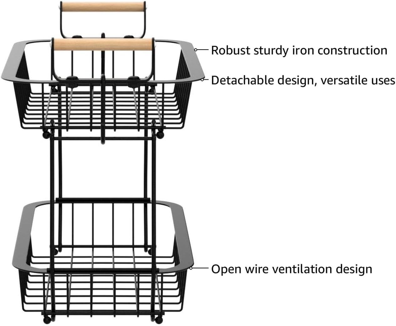 About this itemnDetachable 2-Tier Fruit Basket: You can use this fruit basket in a stacked 2-tier rack or use it as two separate baskets if preferred. It can hold plenty of various sized fruits, vegetables and bread, keeping your space neat and organized.nRemovable Banana Hanger: Two removable hangers provide capability to hang bananas and grapes – the perfect place to prevent your bananas from bruising. They are functional and balanced, can withstand a bunch of bananas.nSturdy Material and Stable Structure: Made of rustproof wrought iron with a classic black powder coating. Each basket has 4 circular feet that keep the fruits away from dirty desk and provide great balanced support. The portable wooden handles designed for easy carrying.nMultifunctional Storage Rack: A functional helper to neatly store not only your fruits and veggies, but also bread, snacks, spice bottles or toiletries, toys, tools and more. Use it in the kitchen, pantry or bathroom, compact enough to fit on the countertop, dining table or under cabinet.nOpen Wire and Easy Installation: The open wire design ensures plenty of ventilation for your fruits and veggies, which keeps them stay fresh longer. Well made and sturdy, easy to put together and take apart.