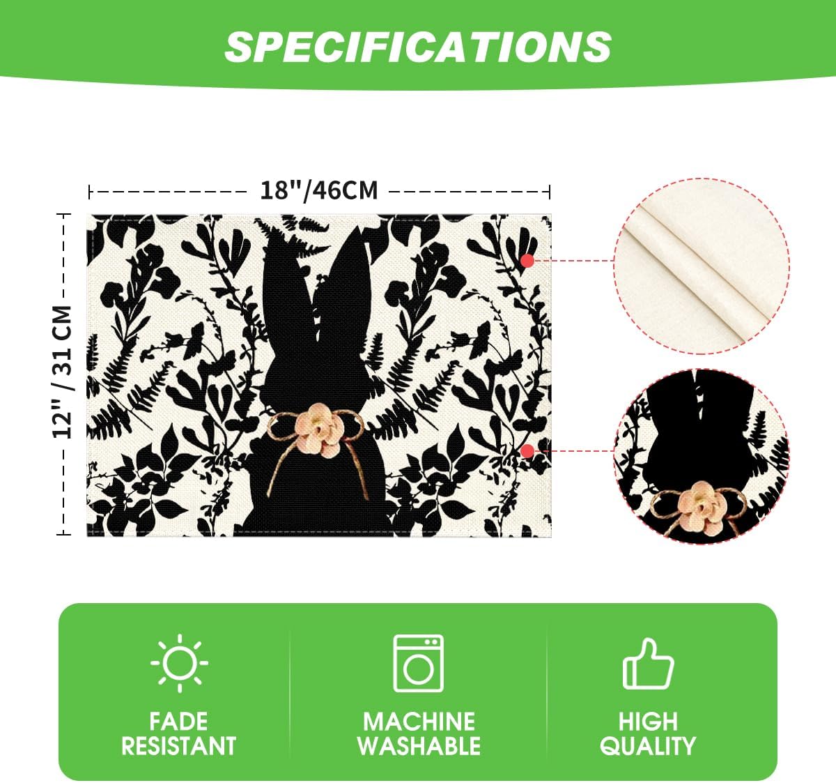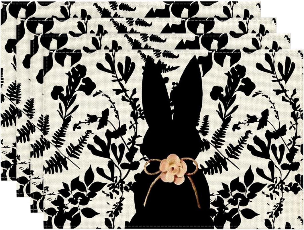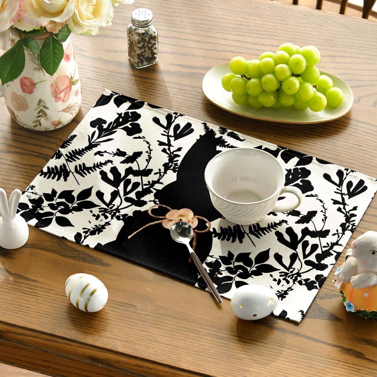 Artoid Mode Black Bunny Leaves Bow Easter Placemats Set of 4, 12×18 Inch Spring Table Mats for Outdoor Home Party Kitchen Dining Decor