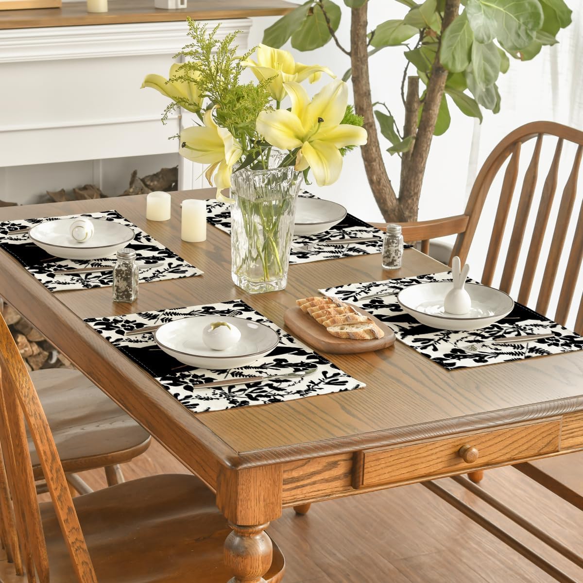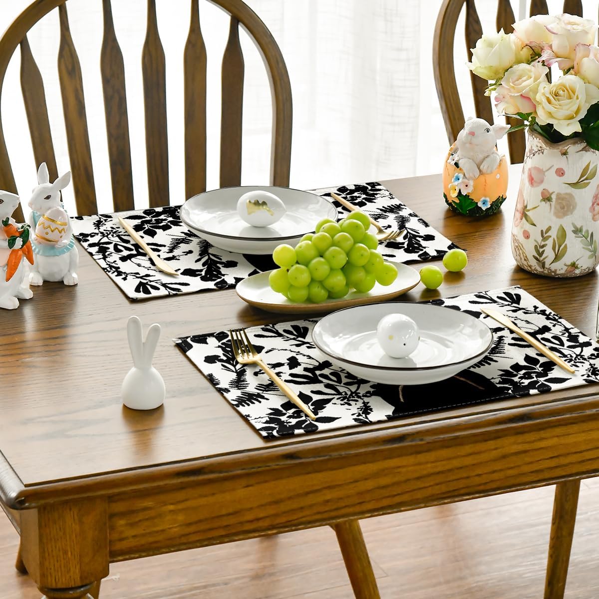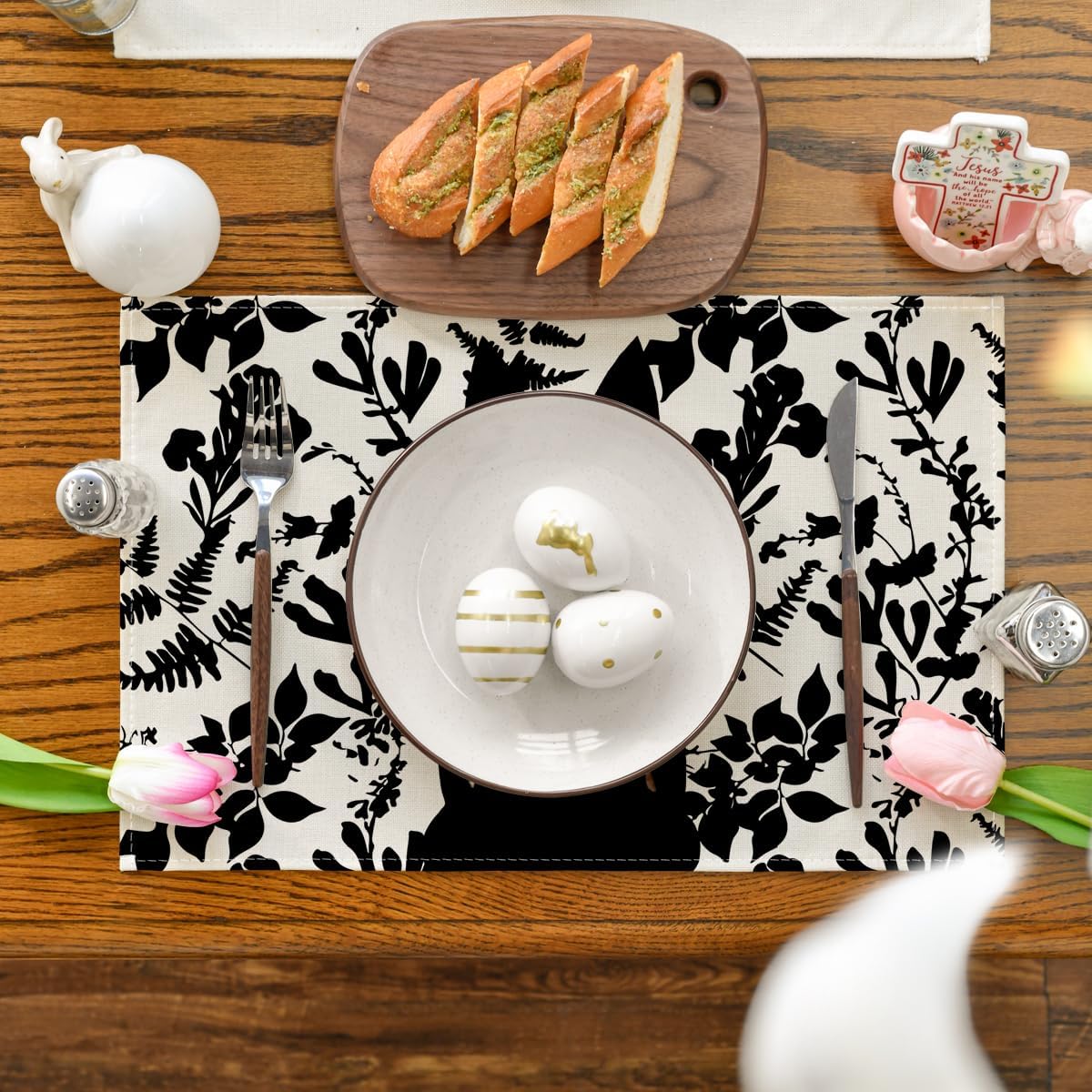 Artoid Mode Black Bunny Leaves Bow Easter Placemats Set of 4, 12×18 Inch Spring Table Mats for Outdoor Home Party Kitchen Dining Decor