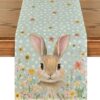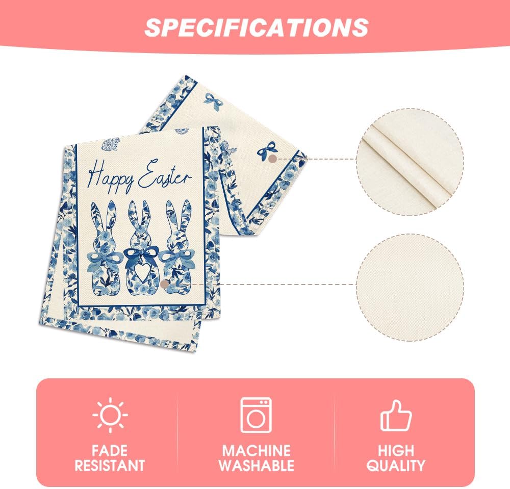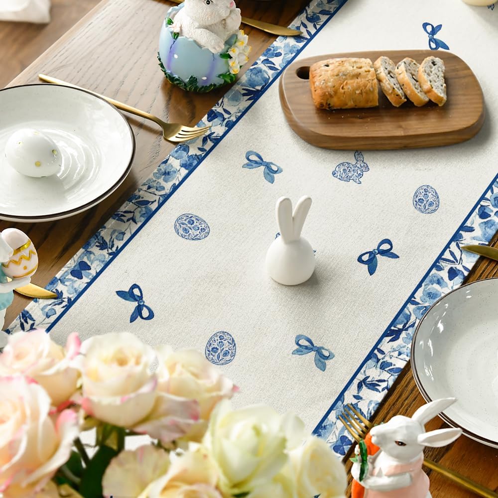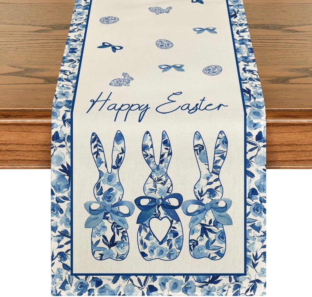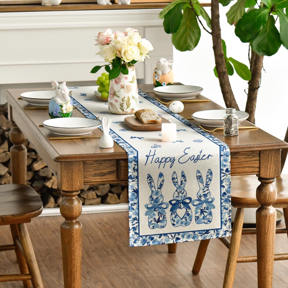 Artoid Mode Blue Porcelain Bunny Rabbit Happy Easter Table Runner,Seasonal Kitchen Dining Table Decoration for Home Party Decor 13×120 Inch
