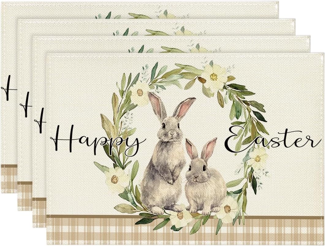 Artoid Mode Buffalo Plaid Bunny Rabbits Happy Easter Placemats Set of 4, 12×18 Inch Seasonal Flower Table Mats for Party Kitchen Dining Decoration