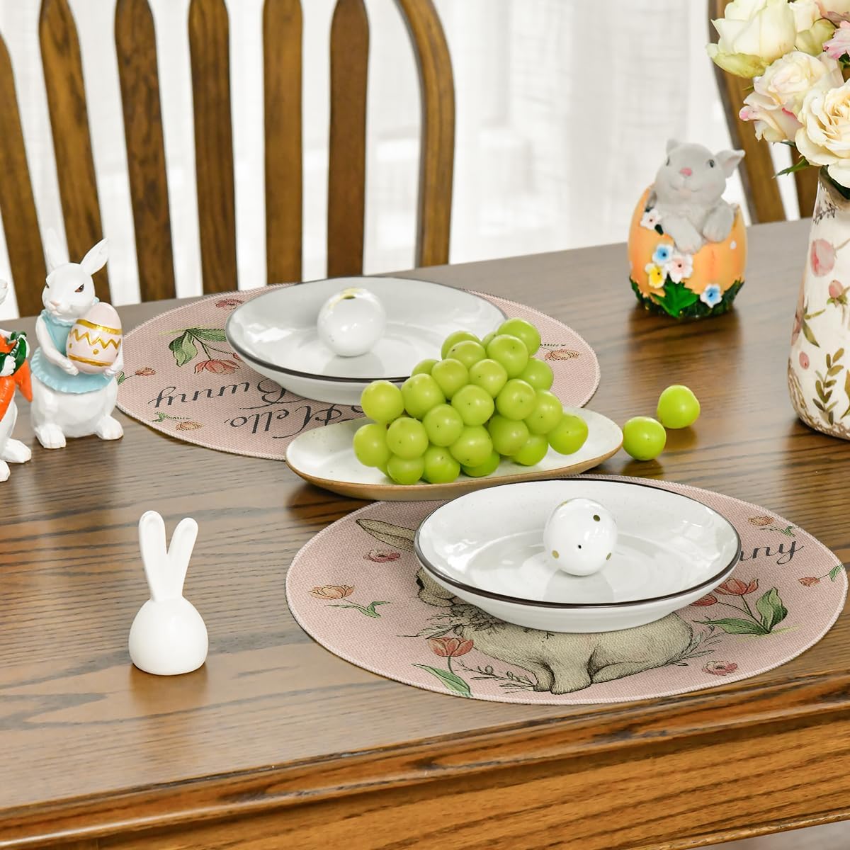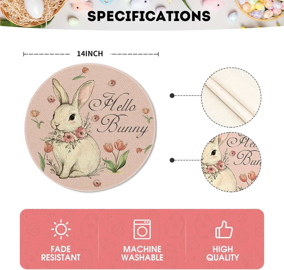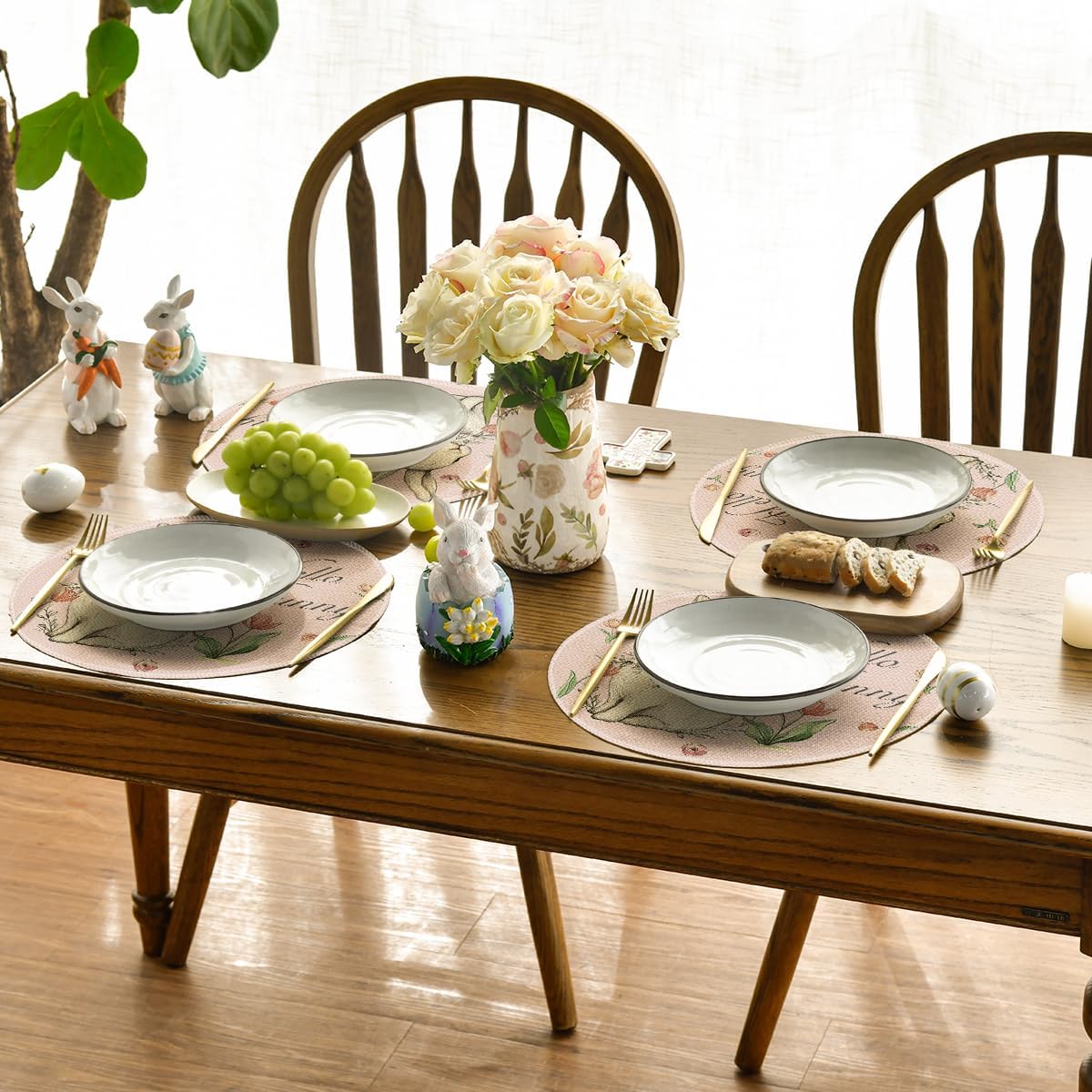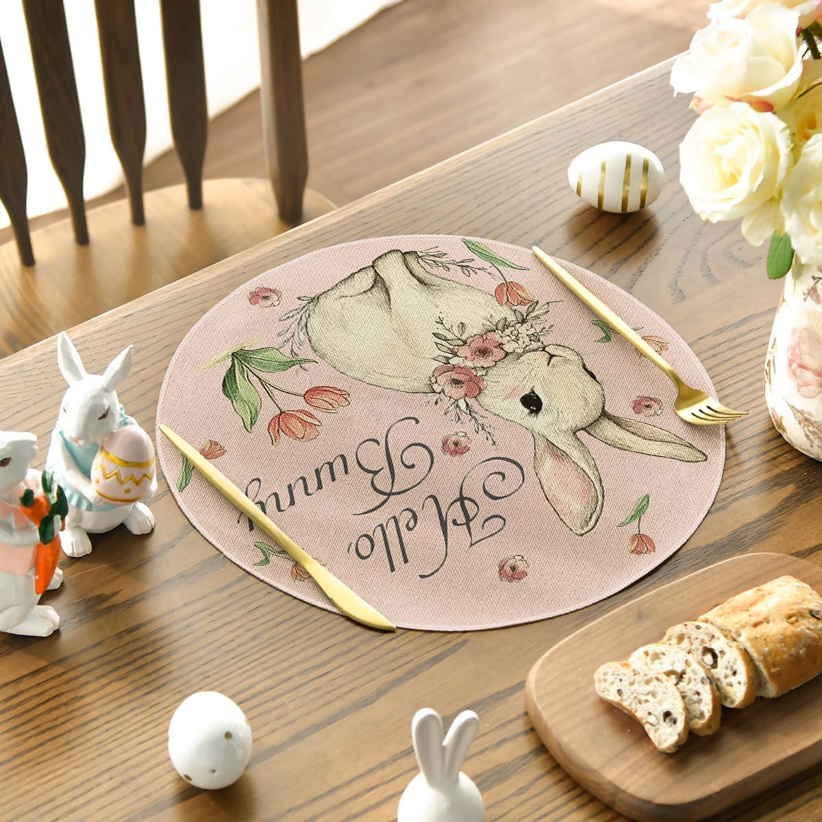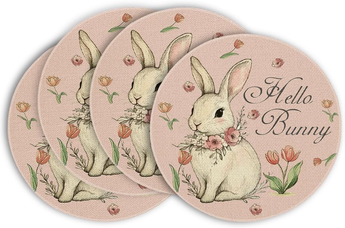 Artoid Mode Pink Bunny Eucalyptus Tulips Easter Placemats Set of 4, 14 Inch Spring Round Table Mats for Party Kitchen Dining Decoration