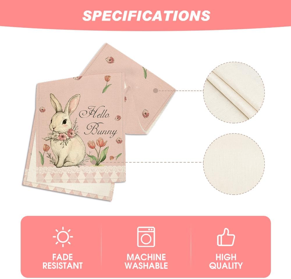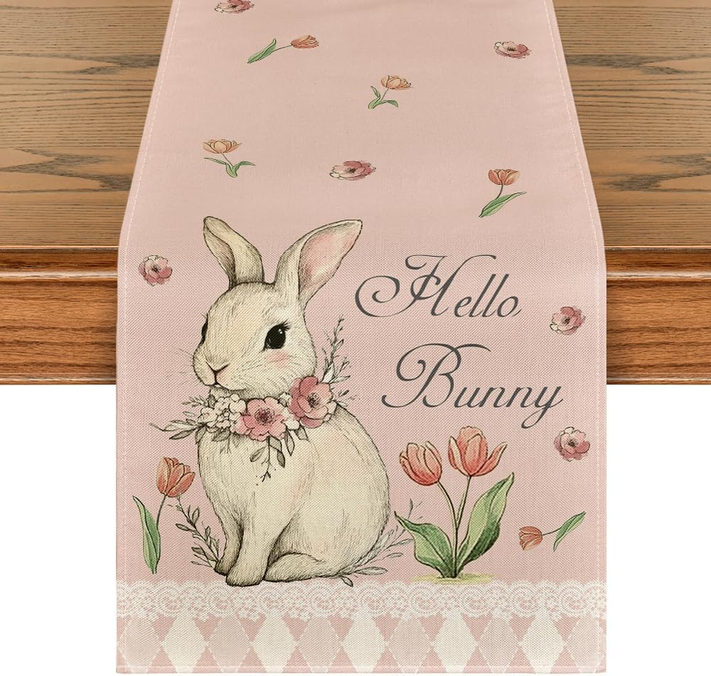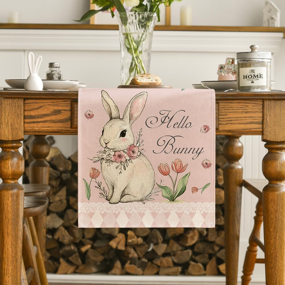 Artoid Mode Pink Bunny Eucalyptus Tulips Easter Table Runner,Seasonal Spring Flowers Kitchen Dining Table Decoration for Home Party Decor 13×90 Inch