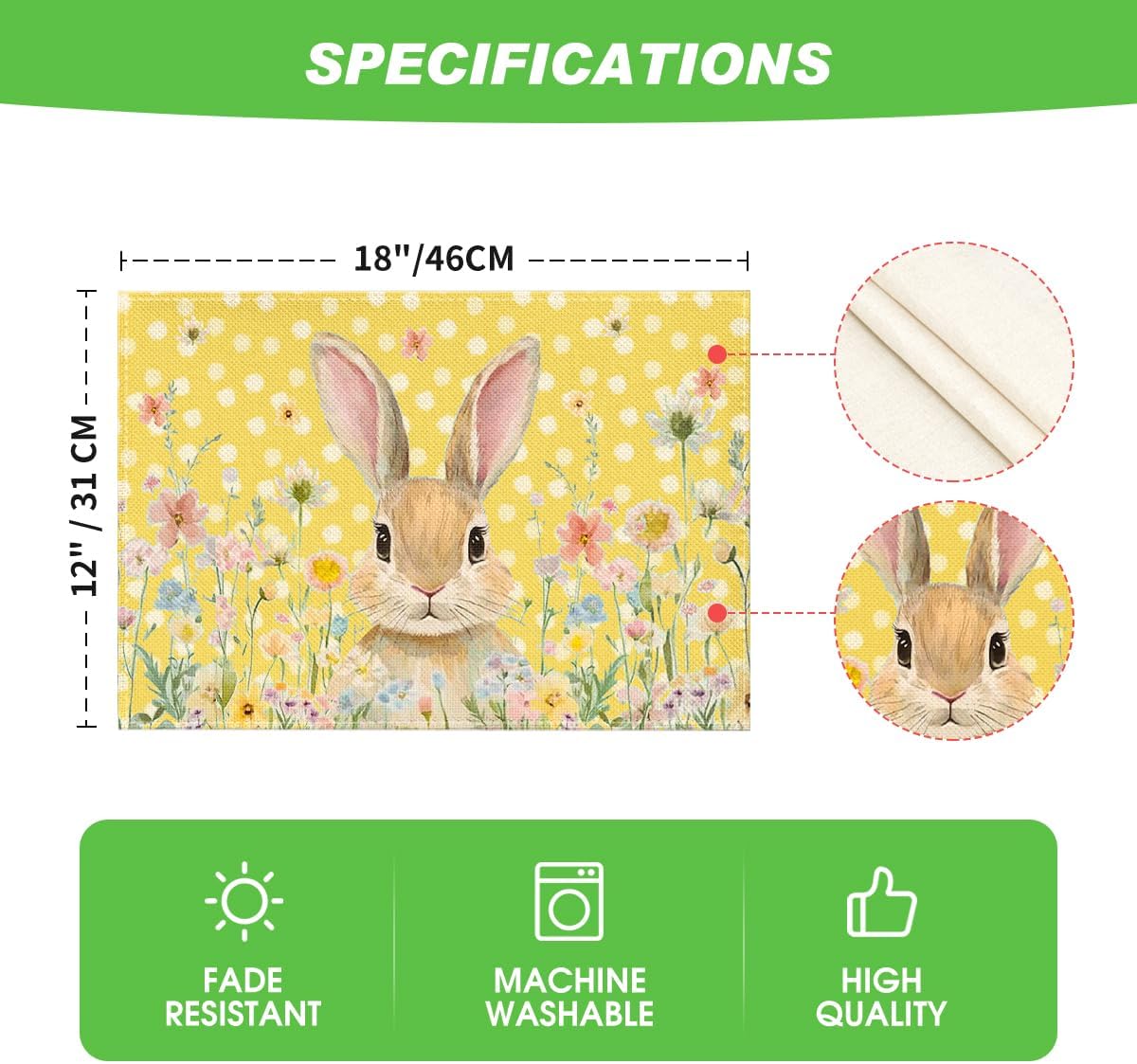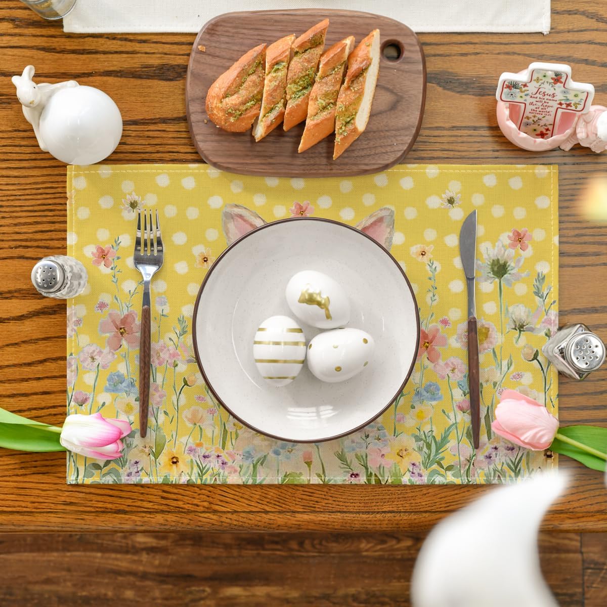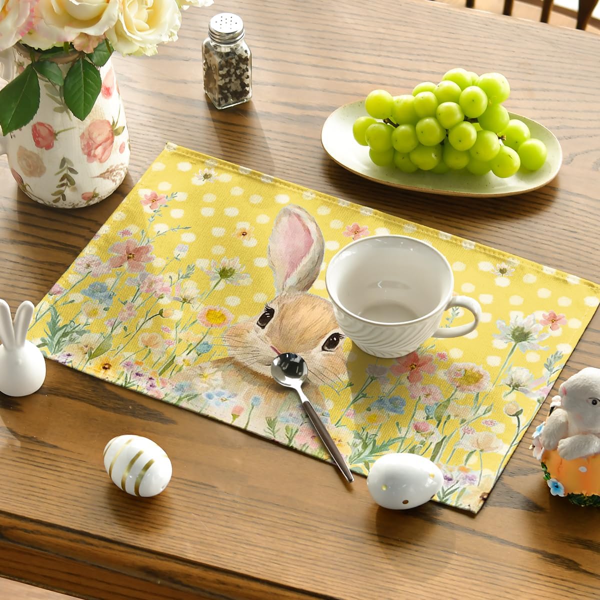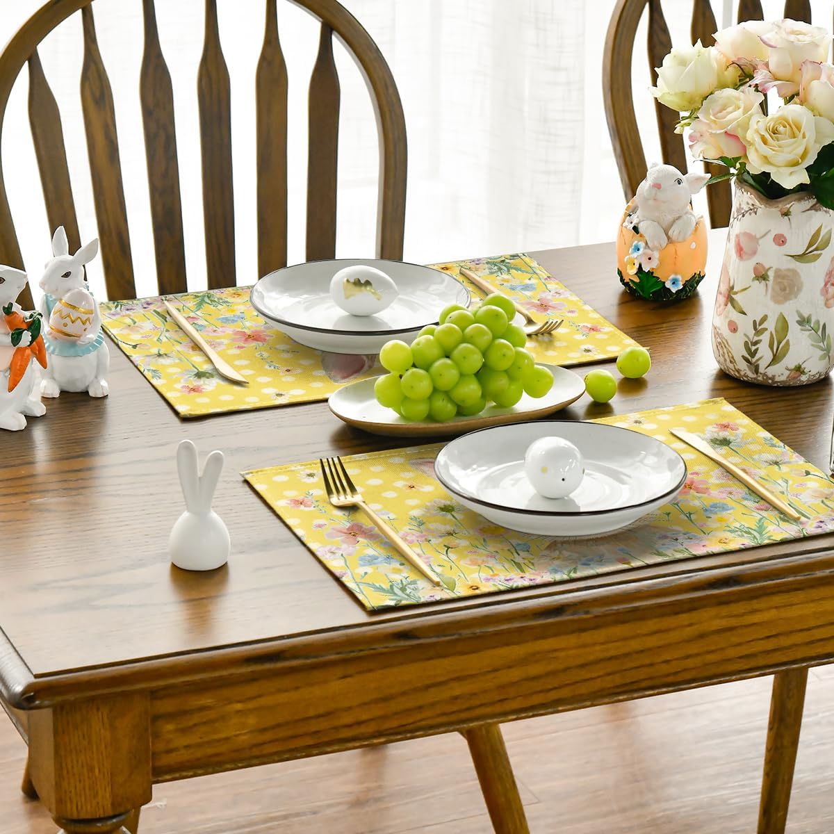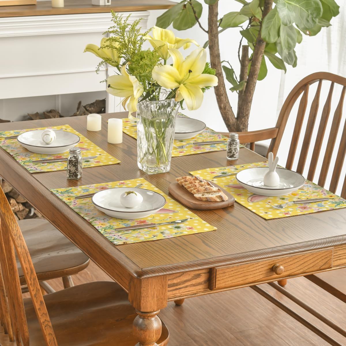 Artoid Mode Yellow Bunny Polka Dot Easter Placemats Set of 4, 12×18 Inch Flower Seasonal Spring Holiday Table Mats for Party Kitchen Dining Decoration