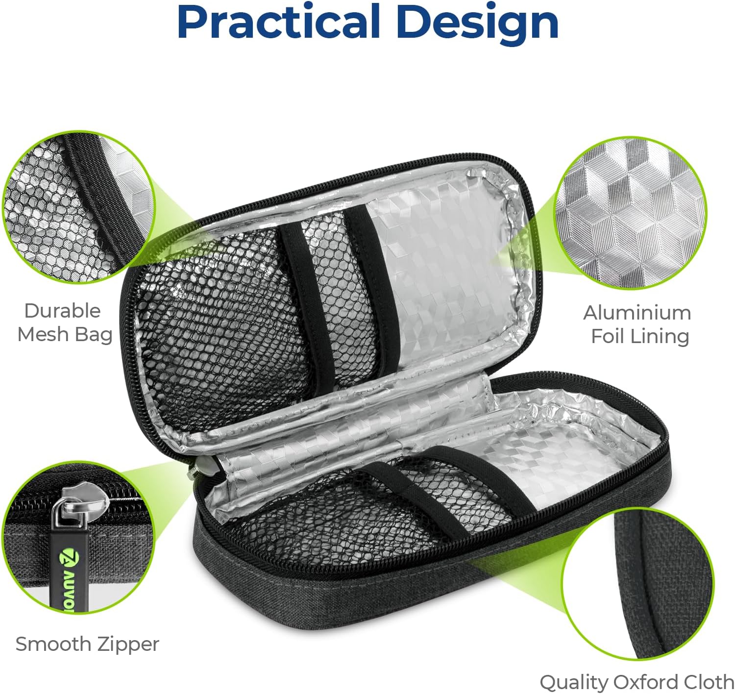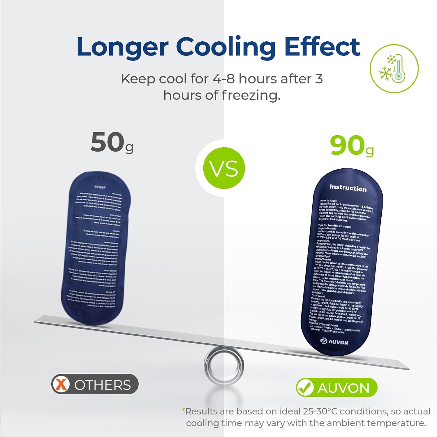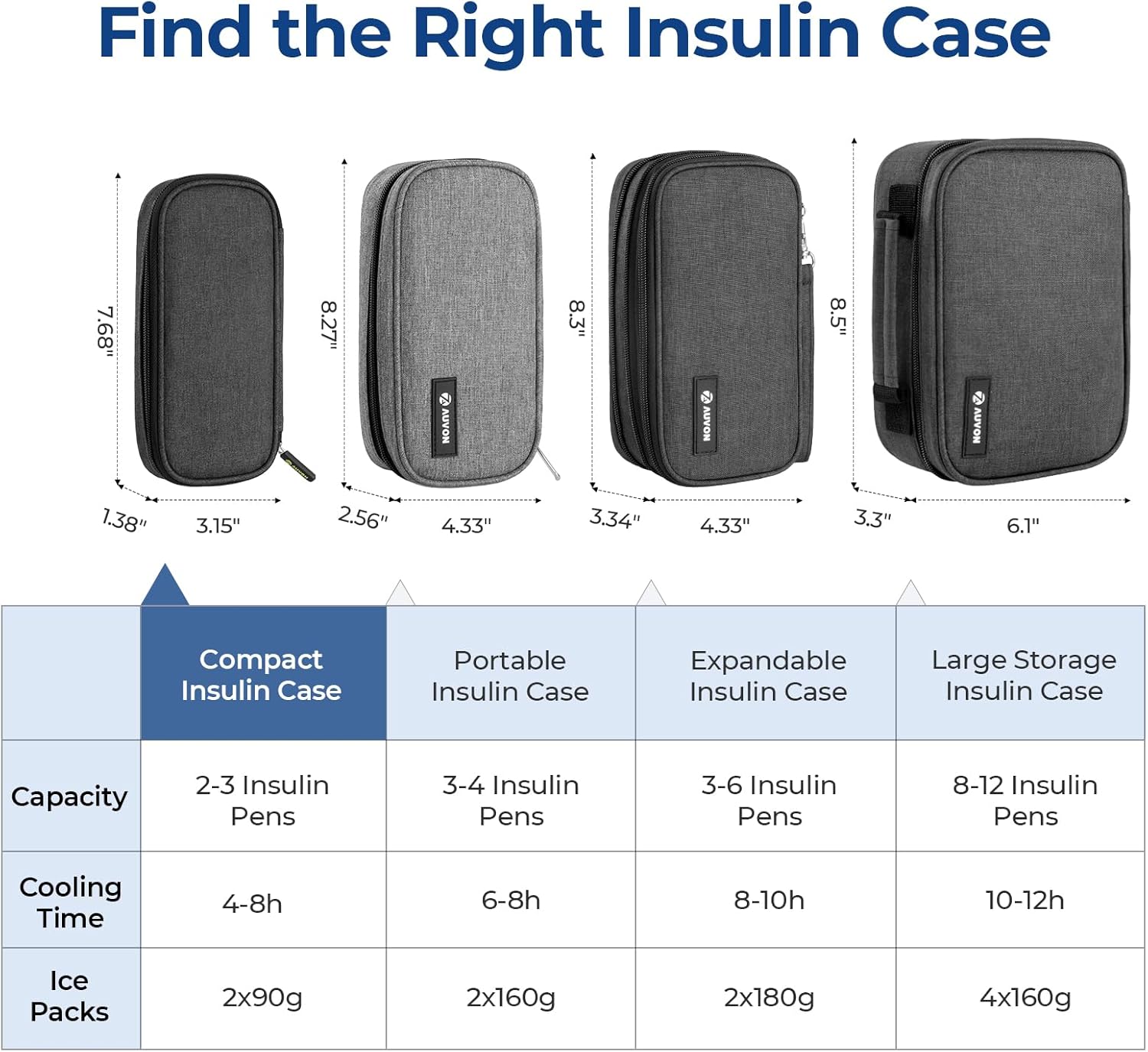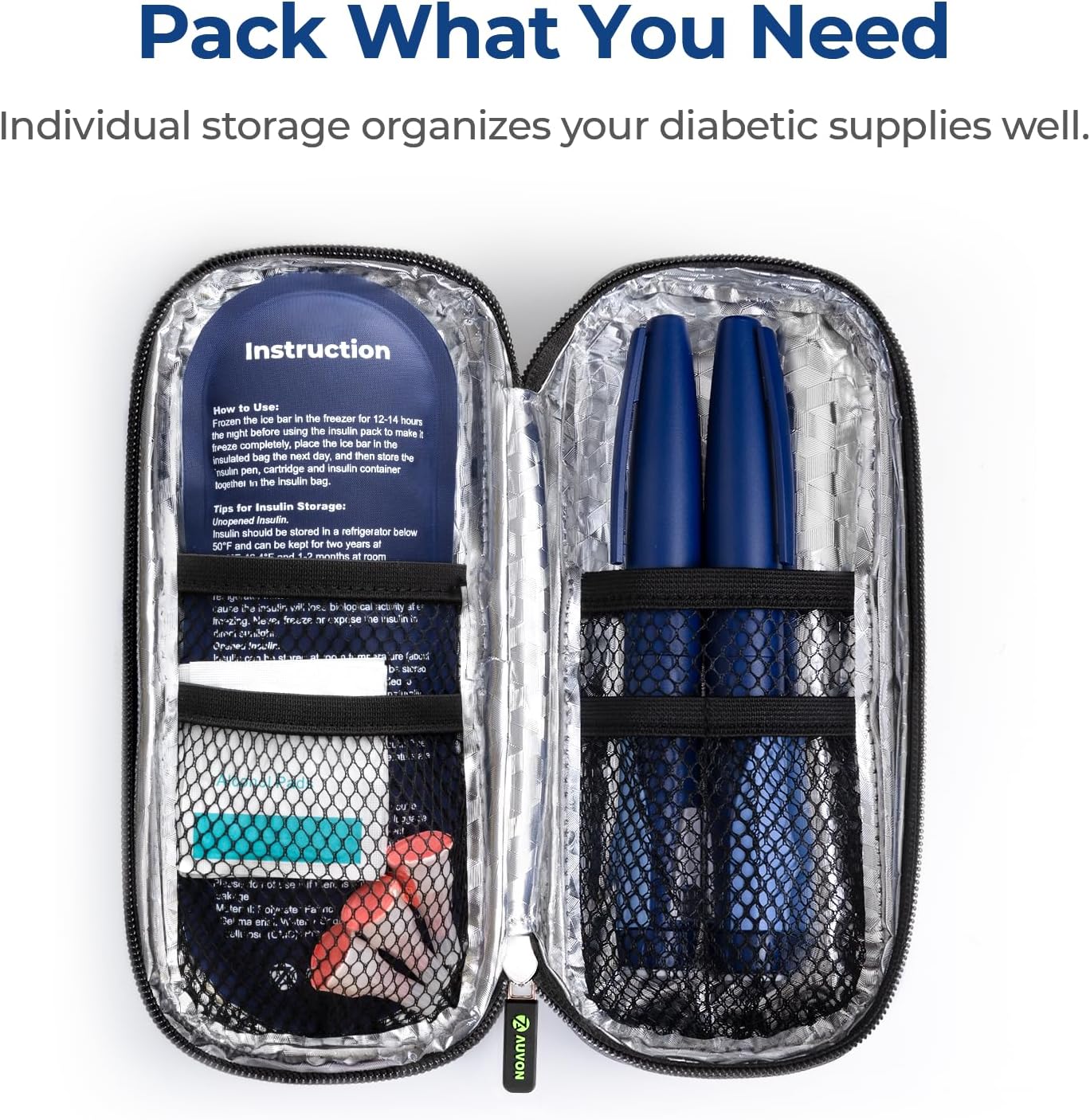 About this itemnUpgraded Cooling Effect: This diabetic travel case comes with two upgraded ice packs each weighing 90g. The insulin cooler can maintain your diabetic supplies at a suitable temperature for 4-8 hours, after being frozen for 3 hours. This diabetic supply bag provides enough cooling time for a stress-free short trip (The above results are based on ideal 25-30? conditions, so actual cooling time may vary with the ambient temperature. ?nIdeal Size for Daily Life: This insulin pen travel case is compact 7.7 x 3.15 x 1.38in for easy carry. The small insulated cooler bag designed in the right size can be held with one hand easily and fit your handbag or backpack. This medication cooler is a great choice for commuting to work or school, outdoor camping or short tripsnHigh-quality & SAFE. Made of Oxford fabric exterior, thickened pearl cotton and aluminum interior, the diabetes travel case is ideal for keeping hot items and cold supplies in good conditionnOrganize What You Need: With a well-designed layout, this insulin case facilitates neat storage for diabetic supplies, such as 2-3 insulin pens, refills, syringes, insulin needles or alcohol wipes. The insulated medication travel bag can pack all you need and keep them well organized when you are daily outing. AUVON offers 4 insulin cooling bags in different sizes, and you can choose what you neednTSA Approved: The 2 x 90g ice packs meet TSA security standards and can be taken on board without hassles. Normally, one ice pack can meet your need to keep medicine cold, and the other one can be carried in your suitcase or left at home as a replacement. This insulin bag allows you to enjoy travel and makes your health management efficient and worry-freenWhat You Receive: 1 x Compact Insulin Cooler Travel Case, 2 x 90g Reusable Ice Packs, AUVON Warranty Support and Friendly Customer Service
