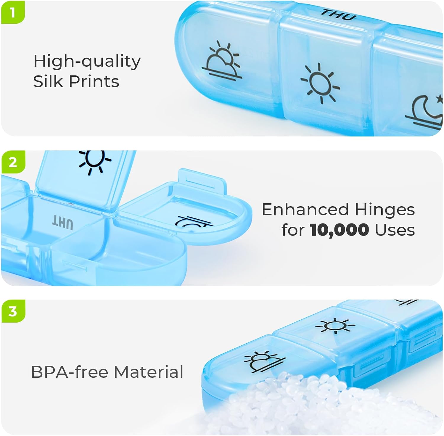 About this itemnFashion Pill Organizer: This weekly pill box comes with a fashionable black PU leather bag that features a durable gold zipper, does not fade, has no peculiar smell, and is durable. It helps your pill prevent spillage and also can protect your privacy.nLarge Capacity: This stylish 3 Times a Day Medication Organizer has an upgraded capacity to fill and sort all your morning, noon, and night pills for one week. Each compartment can hold up to 7 fish oils or 10 capsules, which is an ideal health assistant for daily/weekly use. (Overall size: 6.69
