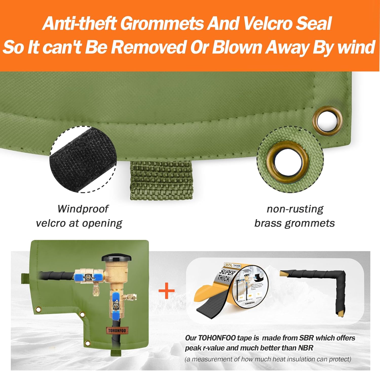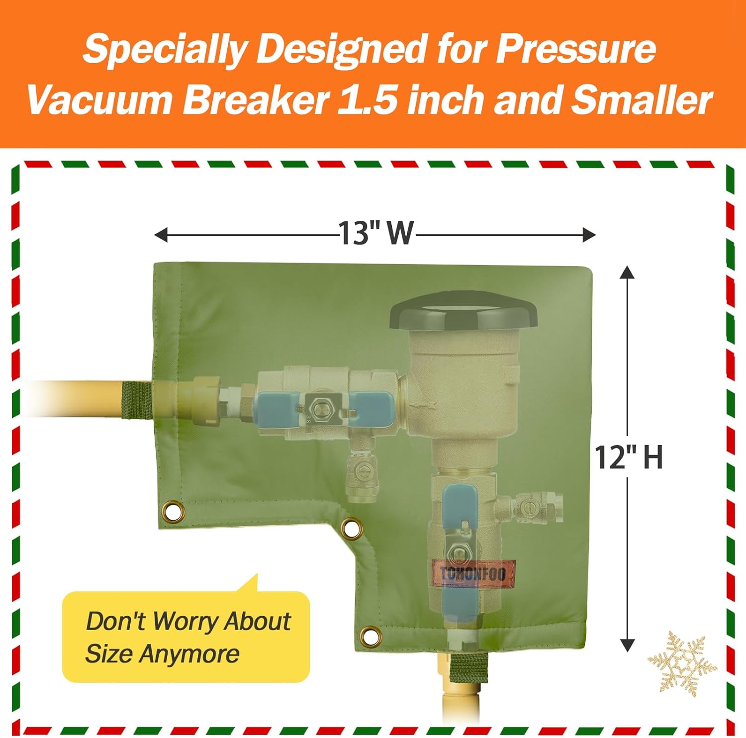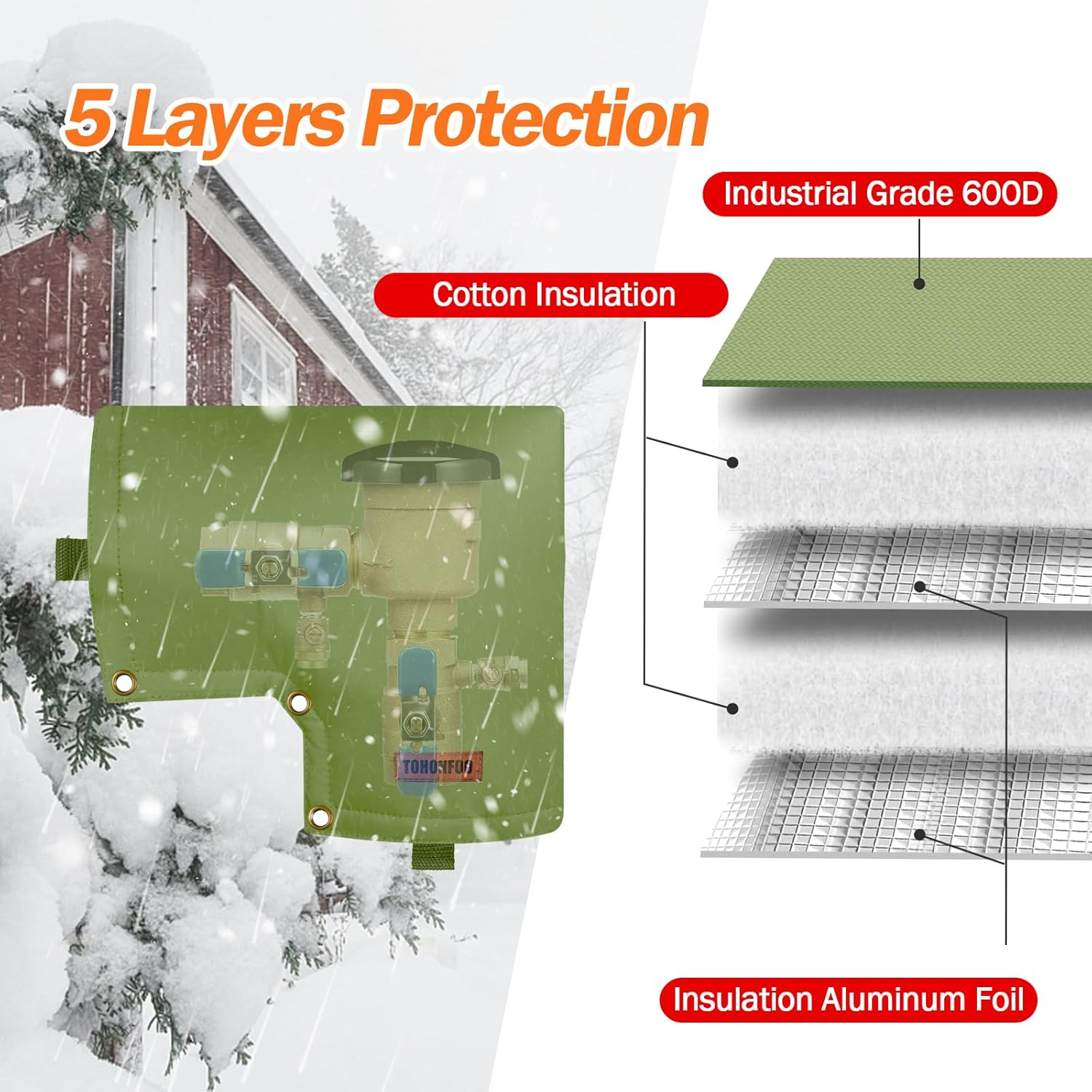 About this itemn?Customized Design?Our Backflow Insulation Pouch is specially designed for Pressure Vacuum Breaker, and it matches perfectly with Pressure Vacuum Breaker. Protect your Pressure Vacuum Breaker from Severe Snow and Intense Sun.n?5 Layers Design Insulation & Waterproof?Made of 1 Layer Waterproof Heavy Duty 600D Oxford Fabric, 2 Layers Cotton Insulation, 2 Layers PE Sliver Coated Cloth. Double stitching for max security has both waterproof and insulation effects. Keep the Backflow Device / Irrigation System / Lawn Sprinkler System from freezing or sunning.n?Avoid High Repair Costs?Protects your backflow pipe systems from freezing, bursting, and blowouts due to severe weather conditions like snow, rain, wind, and sun exposure heating. Avoid expensive costs of valve replacement and repair every year.n?Easy To Install and Stay Sturdy?Put the cover on your pipes and close it with the Velcro Strips. We also prepared some extra nylon ties to fix it and keep your insulated pouch in place. No worry dogs to get it away and the wind blowing it away. The grommets also can be locked by Chain to prevent being taken away by theft, increasing security.n?Friendly Customer Service?Please feel free to contact us if you are not satisfied with this Backflow Insulation Pouch, and we will offer you a satisfactory solution within 24 hours!n See more product details