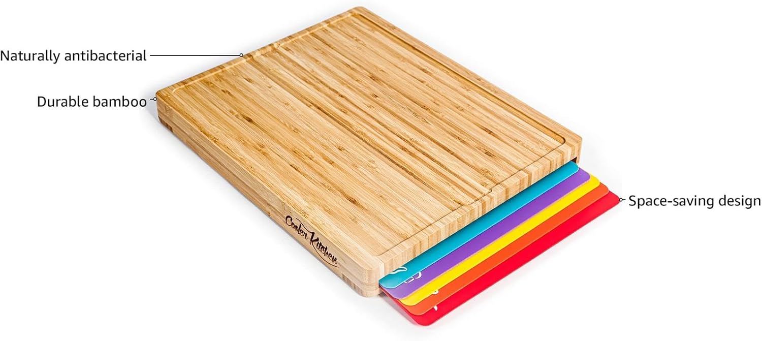 About this itemnPREMIUM BAMBOO WOOD AND EXTRA THICK CUTTING MATS ARE BUILT TO LAST: Our bamboo cutting board holder set is crafted with love from high-quality bamboo, these chopping boards are not only eco-friendly but also durable and gentle on your knives. Its dimensions are 15.73 inches in length, 13.78 inches in width, and 1 inch in thickness. Versatile and Complete: Our color coded plastic cutting boards for kitchen includes everything you need for seamless meal prep – Our mats are sturdy and durable while still maintaining their flexibility.nOUR MATS ARE THICK – 1MM! Our cutting mats for kitchen are sturdy and durable while still maintaining their flexibility to curl for easy cooking, or dumping your ingredients quickly into a pot or pan. They are also so stunning they could be used as place mats!nNON-POROUS HYGIENIC ODOR RESISTANT COATING – Naturally non­stick and non­toxic BPA FREE! The color coded set prevents cross contamination for you & your family’s safety. Our color coded flexible cutting boards set includes everything you need for seamless meal prep – 6 color-coded cutting boards for kitchen, each designed for specific food types. Never worry about cross-contamination again!nTEXTURE WAFFLE GRIPPED BOTTOM – PREVENTS SLIPPING ON MOST COUNTER TOPS – Each chopping board has a crosshatch textured back, so the mats will not slip on your counter-top! (Just wet a paper towel and put underneath) Sized for the home chef. Easy to store & maintain.nSTAY ORGANIZED AND TIDY – PREVENT CROSS CONTAMINATION : Thanks to the cutting board set with holder, you’ll have a designated spot within the chopping board itself for your cutting mats, keeping your kitchen clutter-free and your workspace neat. The cutting board storage will save mess and make cleanup a breeze. 6 color-coded cutting boards for kitchen, each designed for specific food types.