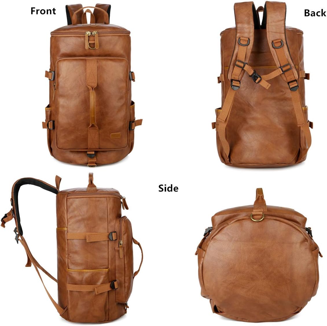 Material: Soft Faux Leather and Red color Lining-99% Like Real Leather and don’t hurt animalsnCan be worn many ways: Travel Duffel Backpack Hybrid, At least three different ways of carrying. Stylish and Multi-UsednLarge Capacity: 50cm x 27cm x 27cm / 20